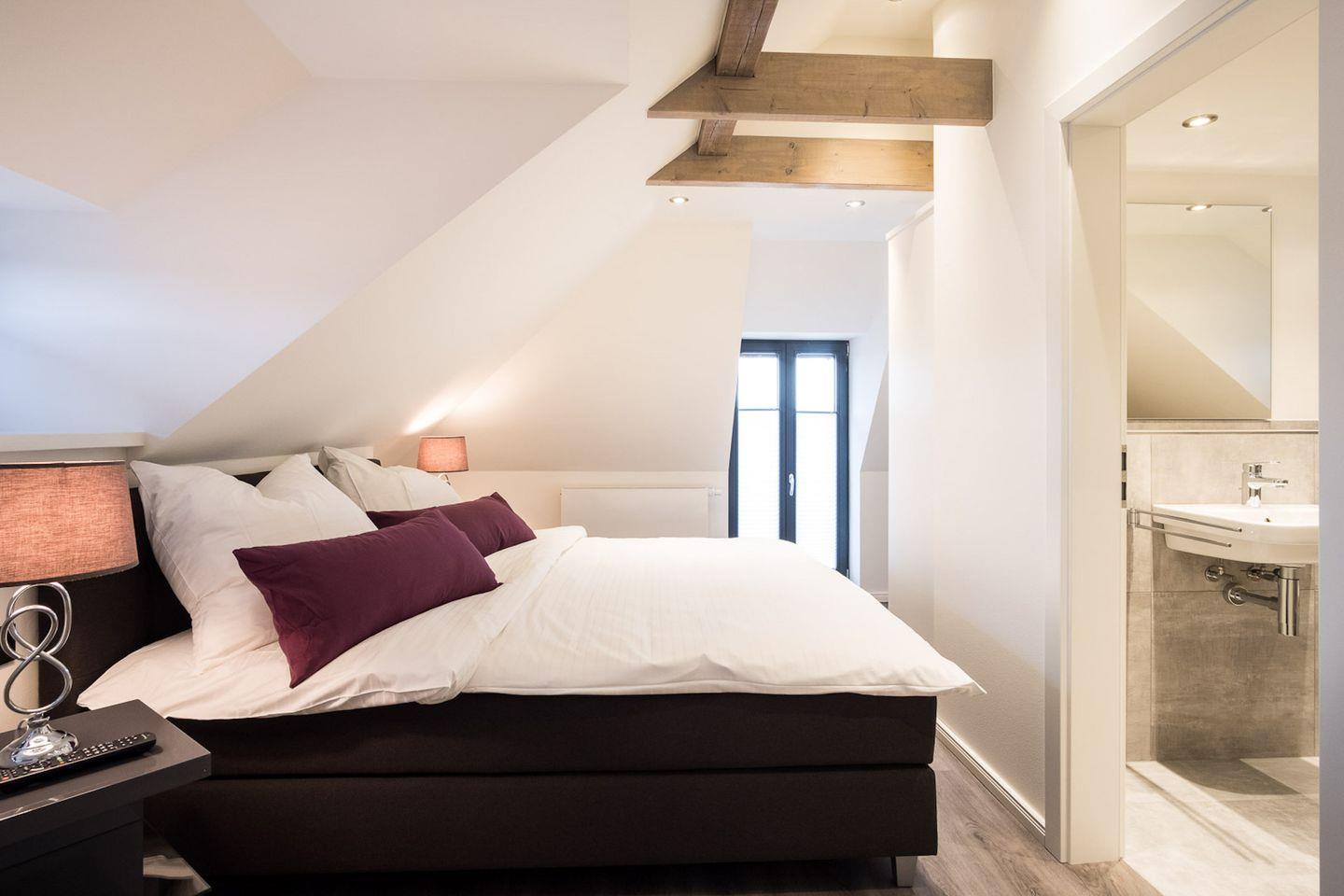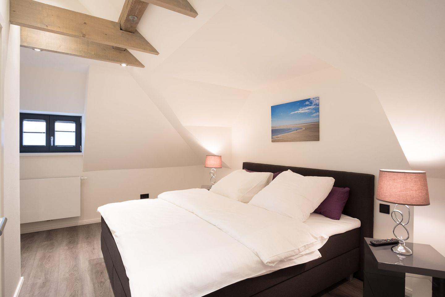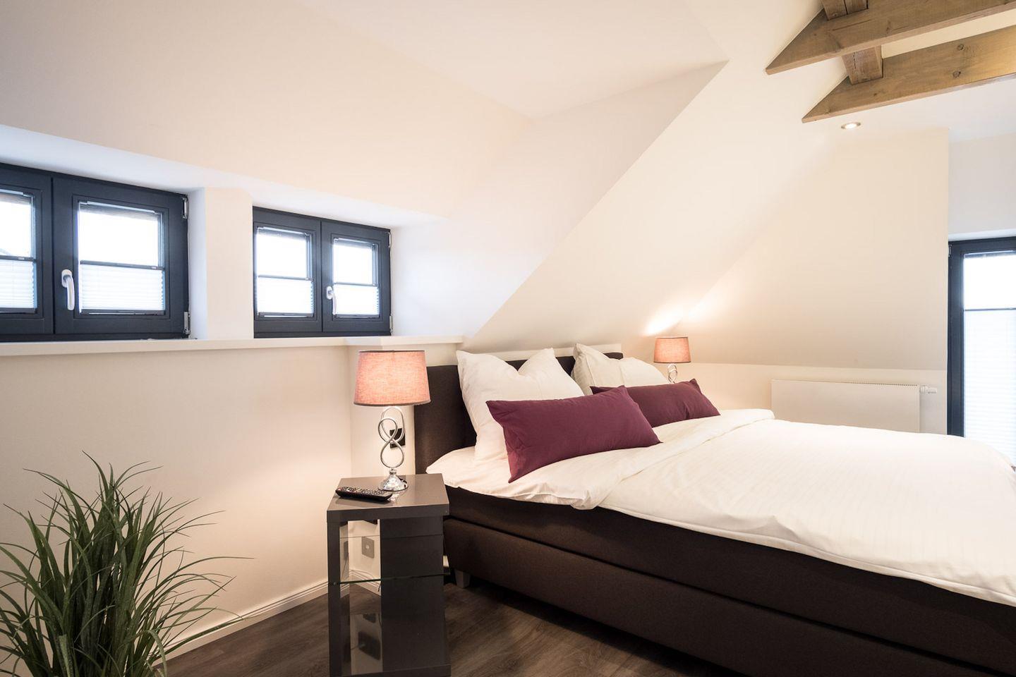 Über eine Holztreppe gelangt man in das Obergeschoss mit zwei großzügigen und liebevoll eingerichteten Schlafzimmern.