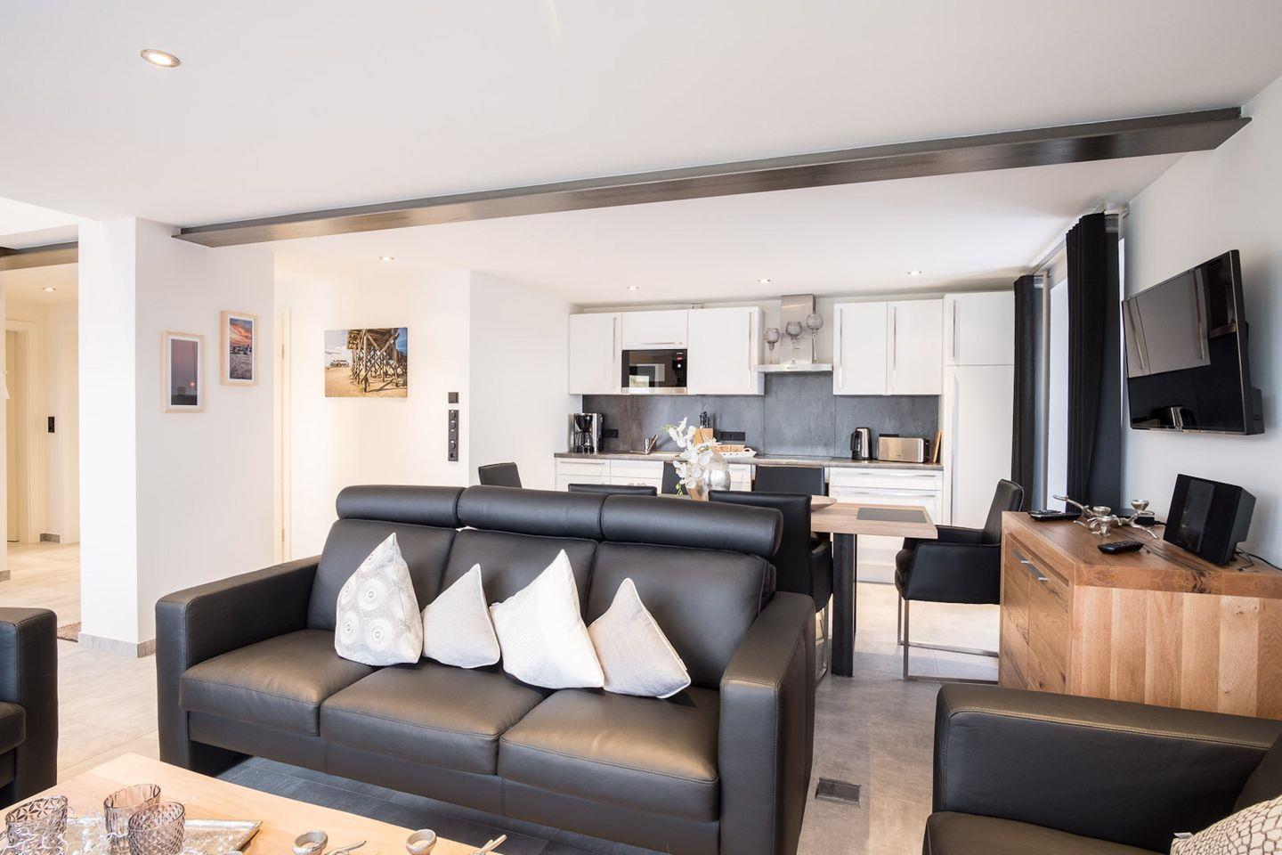 Die angrenzende Wohnküche ist mit allen wichtigen Geräten voll ausgestattet und lädt zum gemeinsamen Kochen ein.