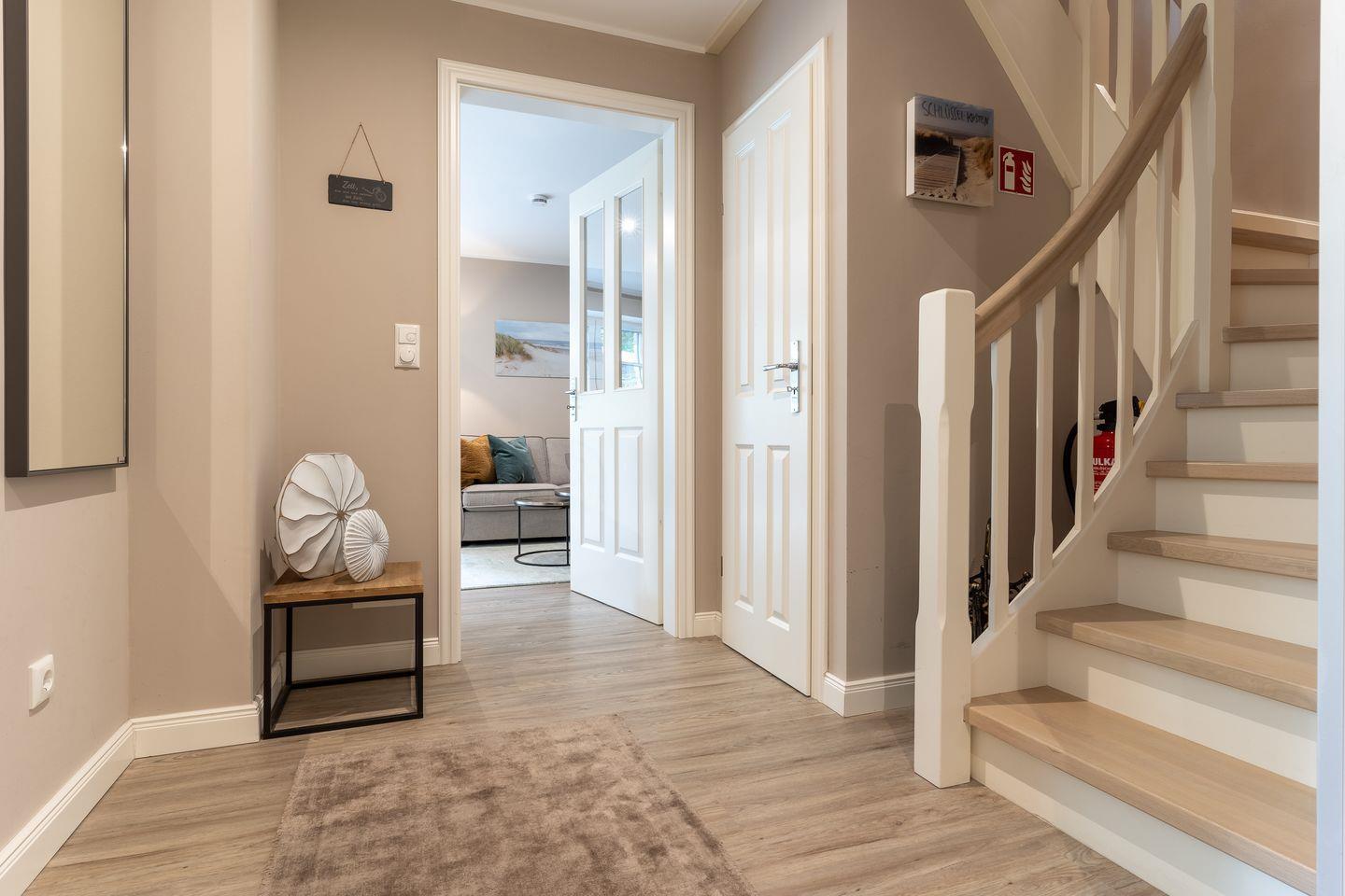 Im Eingangsbereich befinden sich Spiegel und Garderobe, zusätzlich befindet sich im Erdgeschoss noch ein Badezimmer mit Toilette und bodengleicher Dusche.