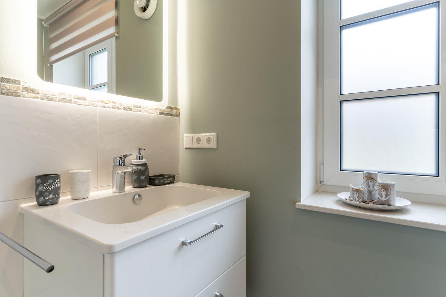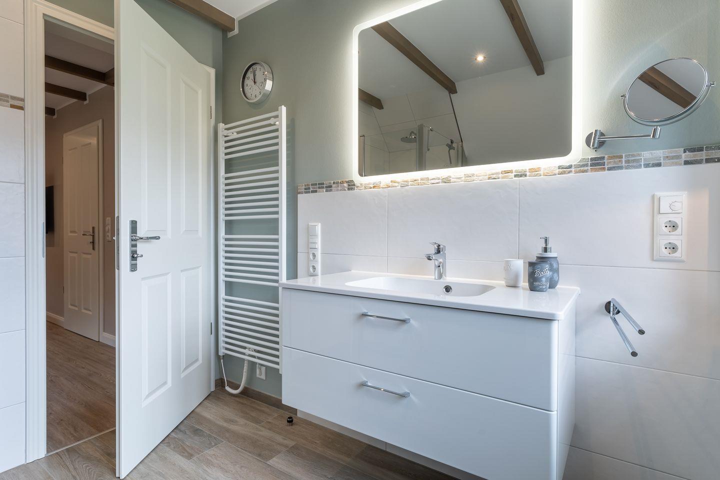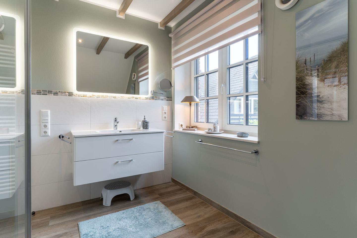 Die Badezimmer sind mit Schminkspiegel und Haartrockner ausgestattet. Für vorgewärmte und schnell trocknende Handtücher sorgt ein elektronischer Handtuchtrockner. Pro Doppelhaushälfte ist weiterhin eine Personenwaage vorhanden. Das große Badezimmer verfügt ebenso über eine ALEXA-Einheit. Schlaf- sowie Wohnzimmer sind mit Plissees bzw. Vorhängen ausgestattet, die eine komplette Verdunklung ermöglichen. Weiterhin finden Sie in Wohn- und Schlafzimmern mit Fliegengittern versehene Fenster vor.