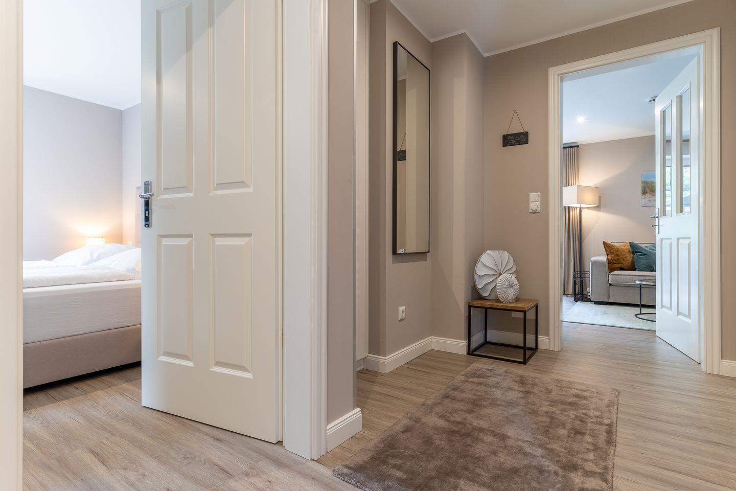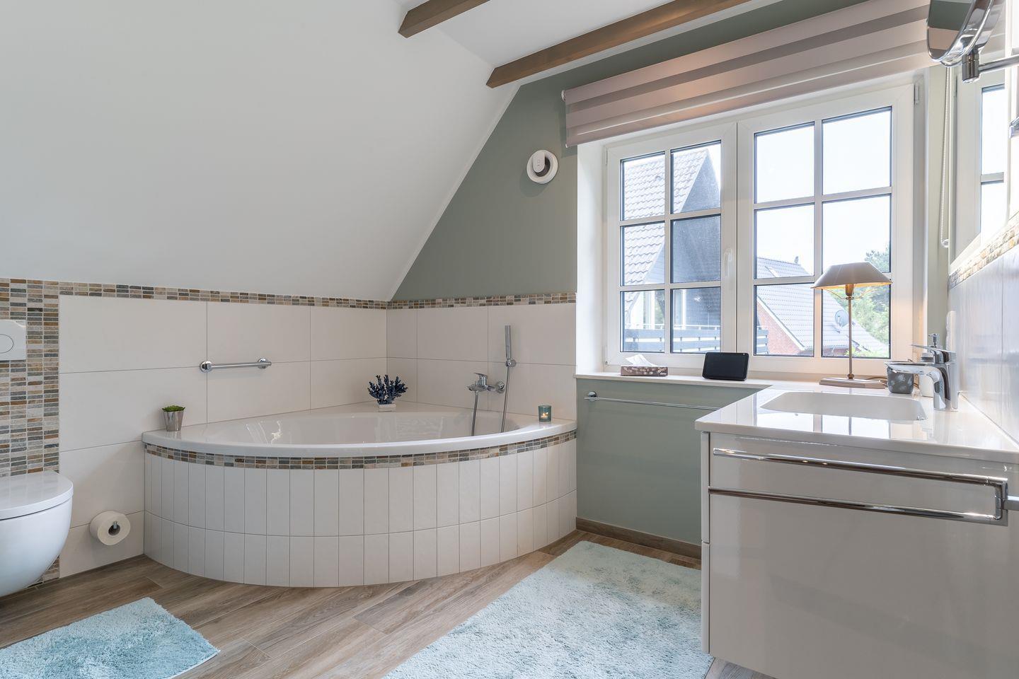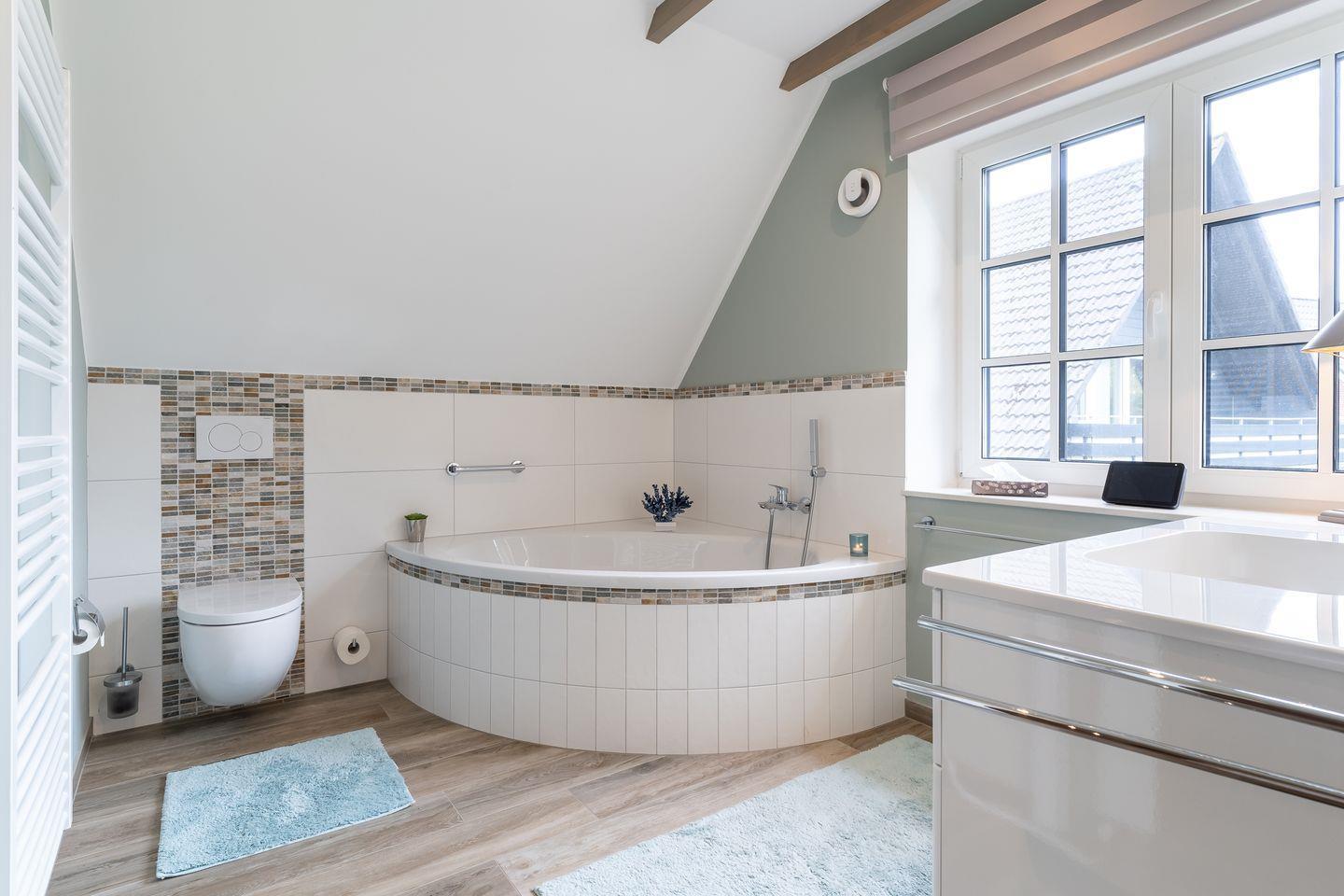 Die Badezimmer sind mit Schminkspiegel und Haartrockner ausgestattet. Für vorgewärmte und schnell trocknende Handtücher sorgt ein elektronischer Handtuchtrockner. Pro Doppelhaushälfte ist weiterhin eine Personenwaage vorhanden. Das große Badezimmer verfügt ebenso über eine ALEXA-Einheit. Schlaf- sowie Wohnzimmer sind mit Plissees bzw. Vorhängen ausgestattet, die eine komplette Verdunklung ermöglichen. Weiterhin finden Sie in Wohn- und Schlafzimmern mit Fliegengittern versehene Fenster vor.