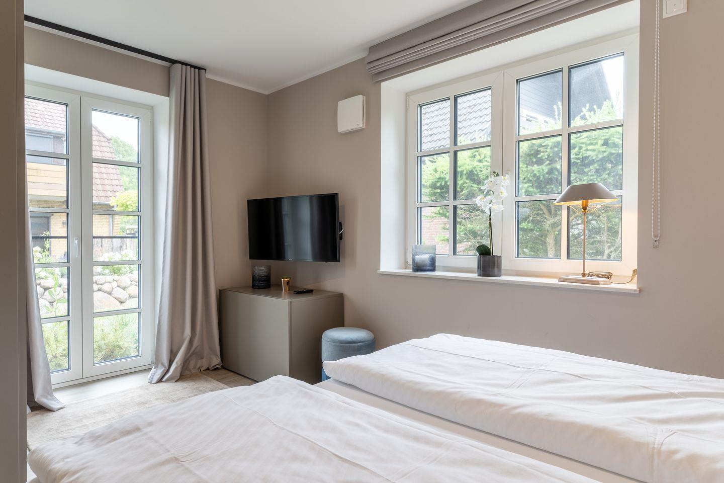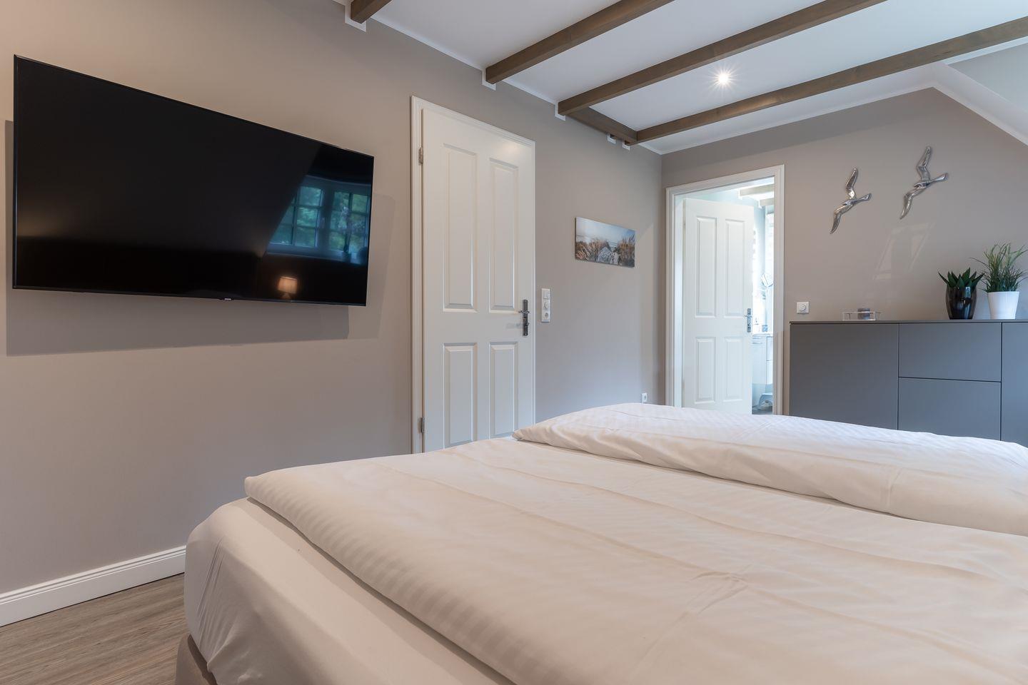 Ebenfalls im Erdgeschoss gelegen, ist das erste der drei Schlafzimmer. Dieses verfügt über ein 180x200cm Boxspringdoppelbett sowie einen Kleiderschrank, eine Kommode sowie einen schwenkbaren Flachbild-TV.