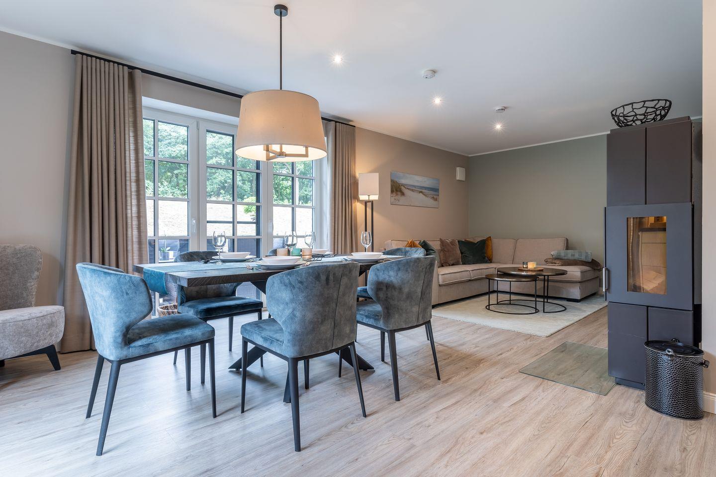 Im Wohnzimmer laden eine komfortable Sofagarnitur, hochwertige TV- und Unterhaltungselektronik sowie ein edler Kaminofen zum Verweilen und Genießen ein.