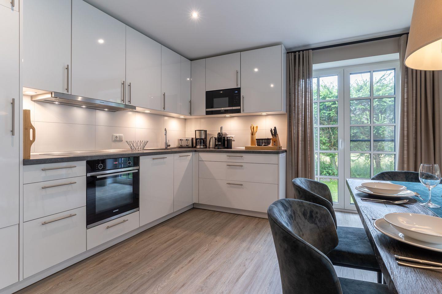 Die Küche wartet mit modernster Elektronik, darunter Geschirrspüler, Herd, Induktionskochfeld und Mikrowelle auf. Die hochwertige und umfangreiche Ausstattung an Geschirr, Besteck und Zubehör lässt keine Wünsche offen.