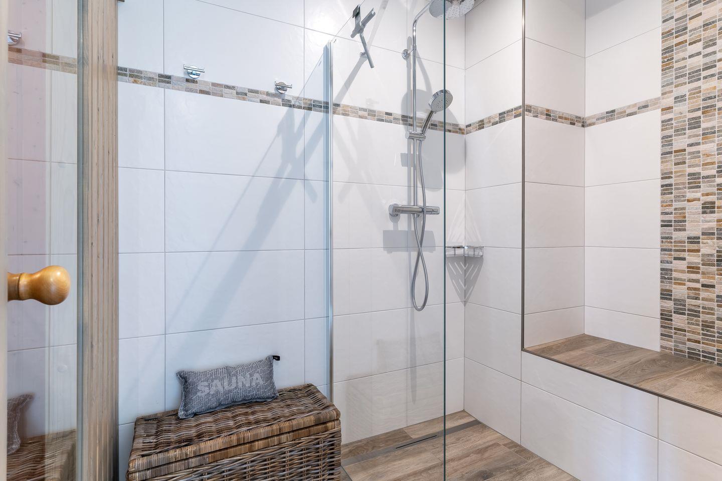 Von dort gelangen Sie in ein weiteres Badezimmer, das mit Waschbecken, Toilette und bodengleicher Dusche ausgestattet ist. Ebenfalls finden Sie dort den hauseigenen Waschtrockner.