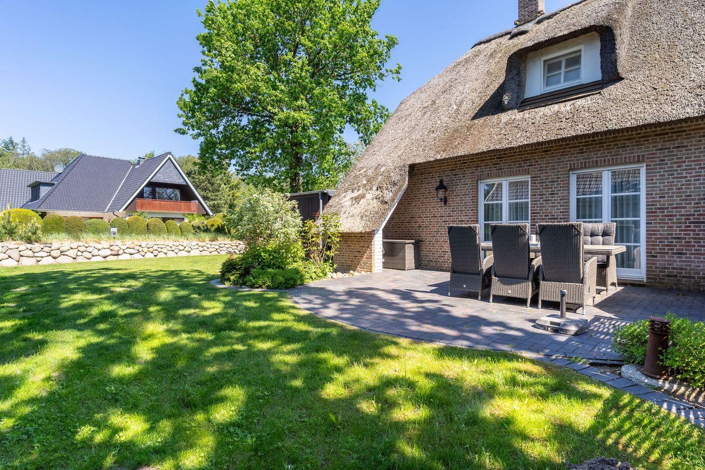 Einen wunderschönen Garten mit heimischen Pflanzen erreichen Sie direkt vom Wohnraum. Hier befindet sich eine Terrasse mit Gartenmöbel und ein Strandkorb.