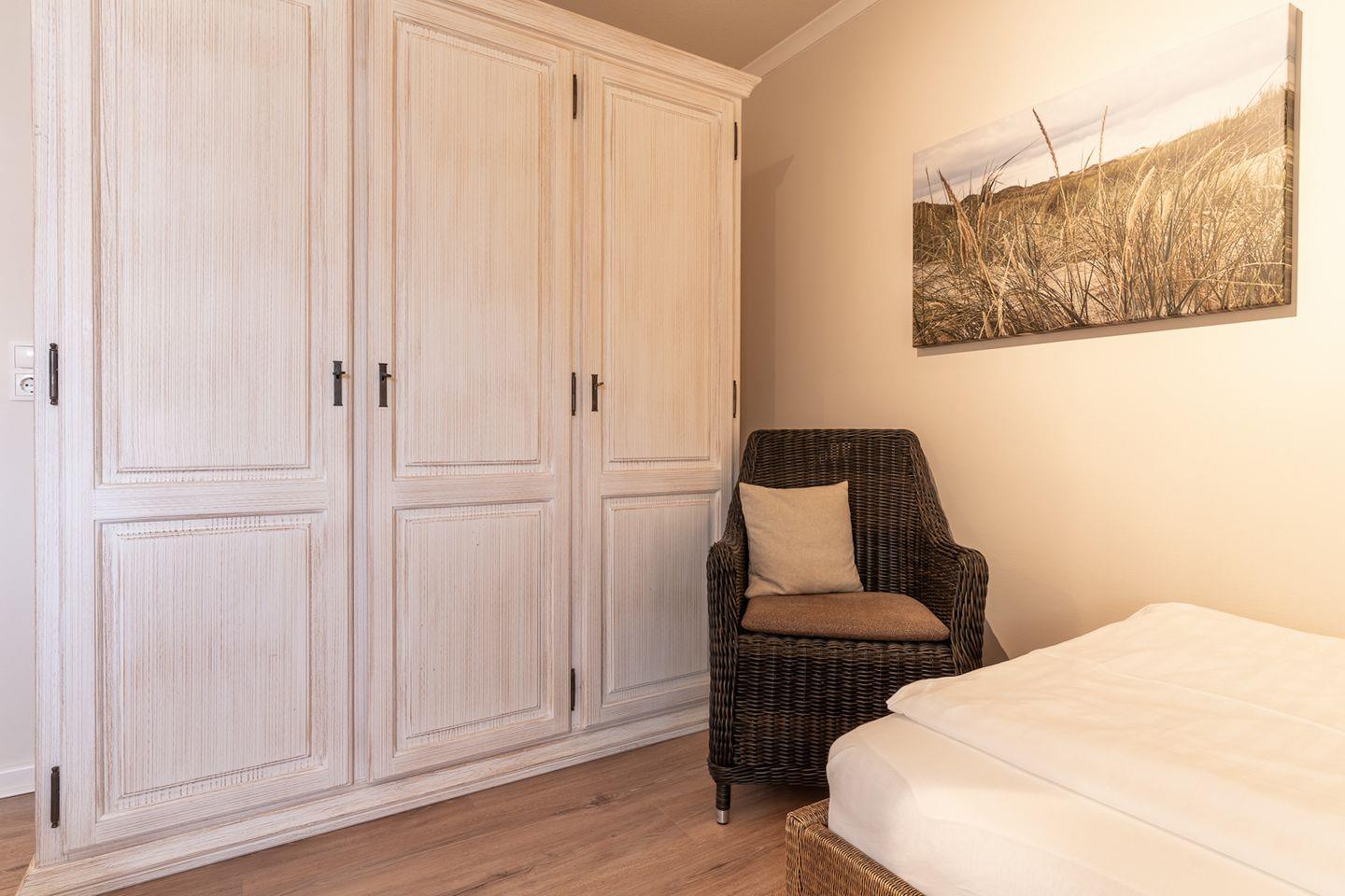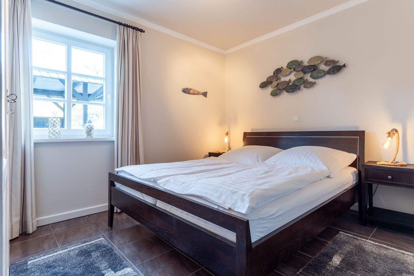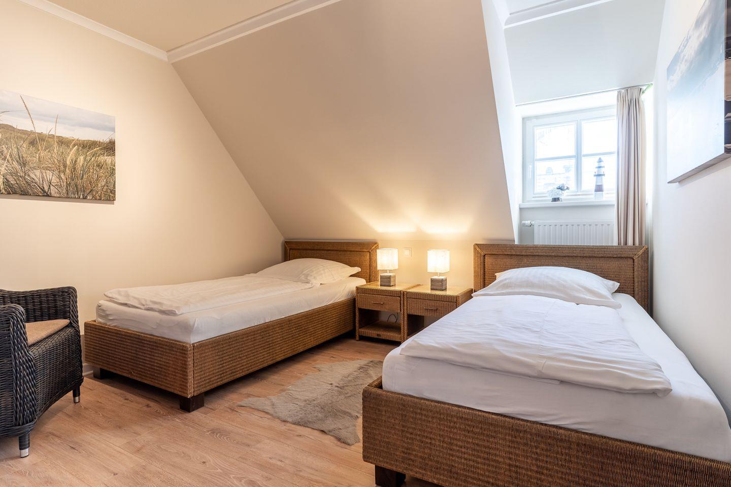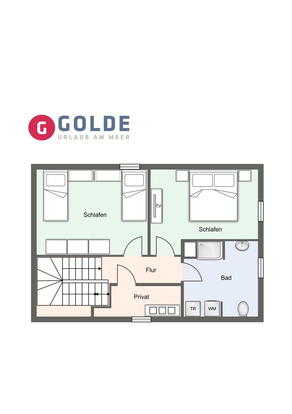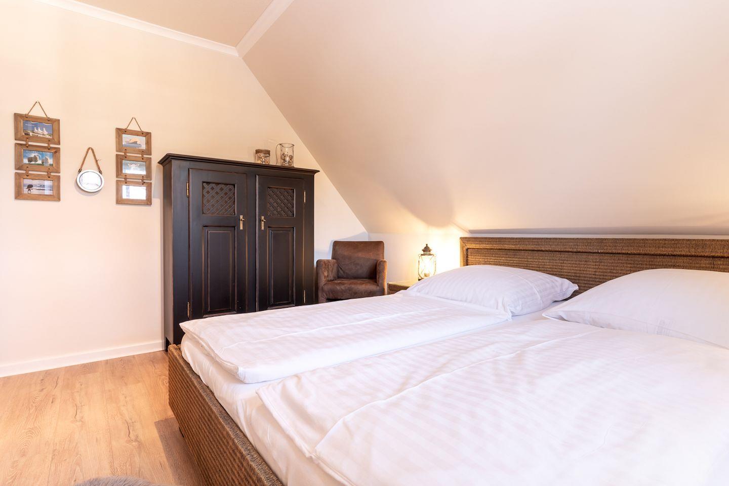 Über eine Holztreppe im Flur gelangt man in das Obergeschoss mit zwei Schlafzimmern. Eines verfügt über ein 180er Bett mit TV und das andere über 2 x 90er Einzelbetten. Außerdem ist im Obergeschoss ein Duschbad.