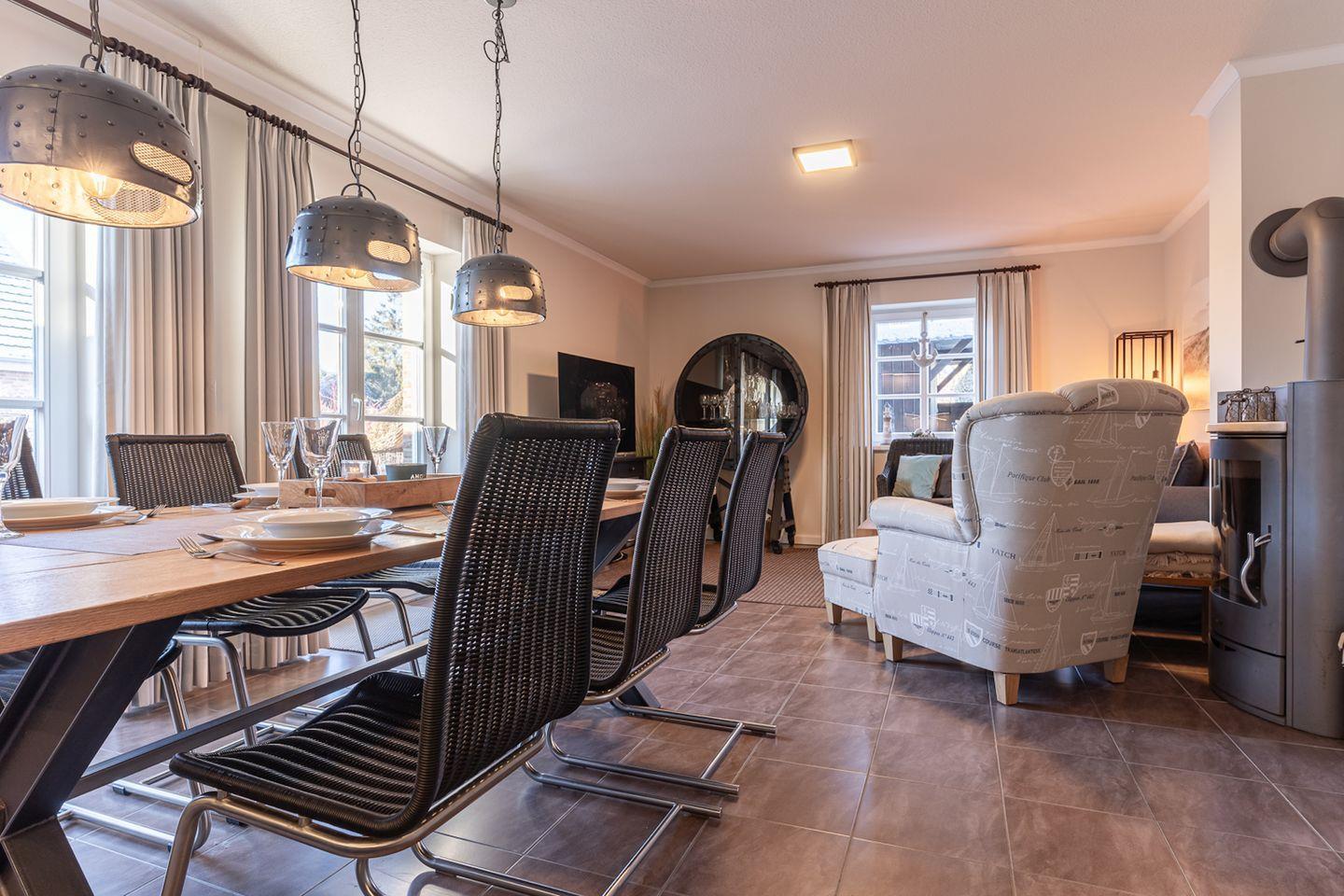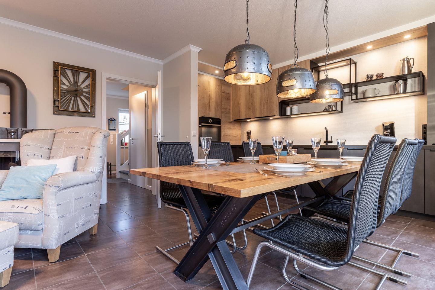 Im Erdgeschoss befindet sich der Wohnraum mit einer offenen Küche und einem gemütlichen Essbereich. Die Küche ist mit hochwertigen Geräten voll ausgestattet.