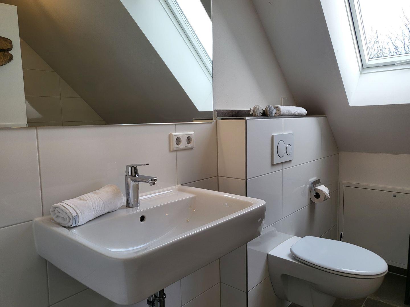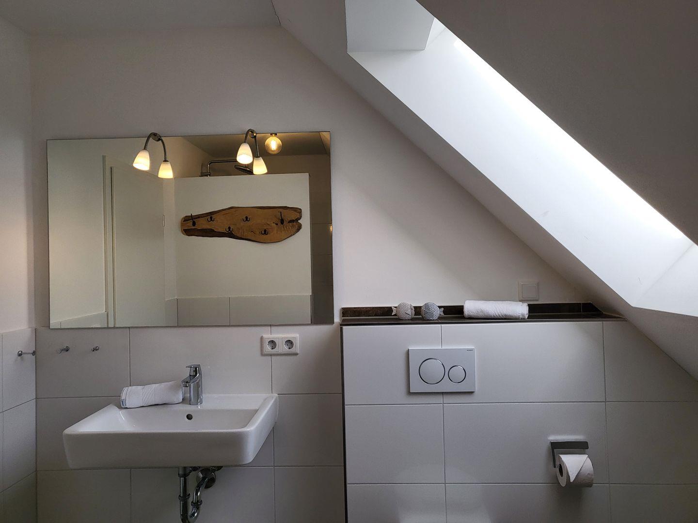 Auch das Obergeschoss verfügt über ein großes Bad mit bodengleicher Dusche, welche mit einer Regenbrause ausgestattet ist.