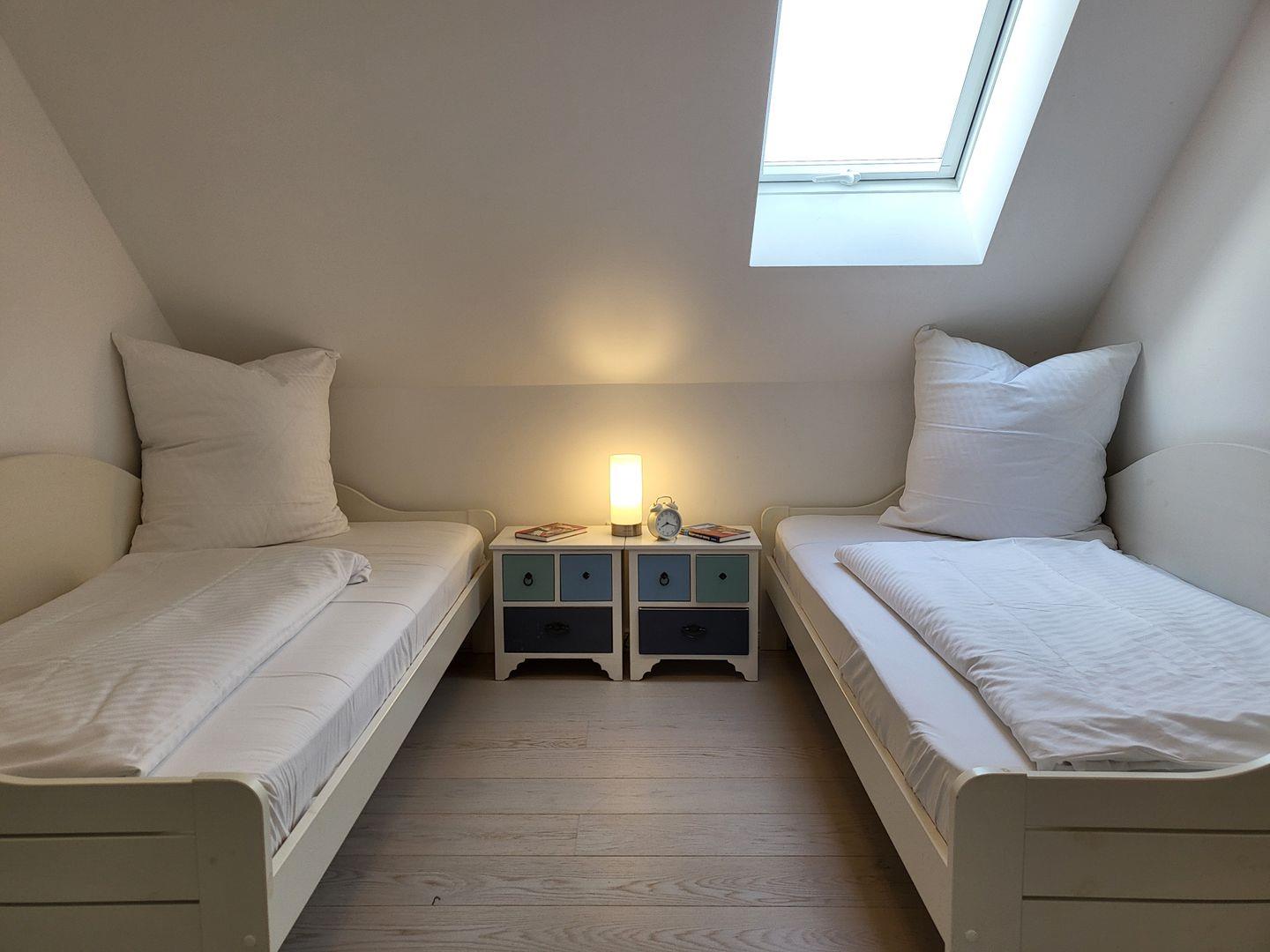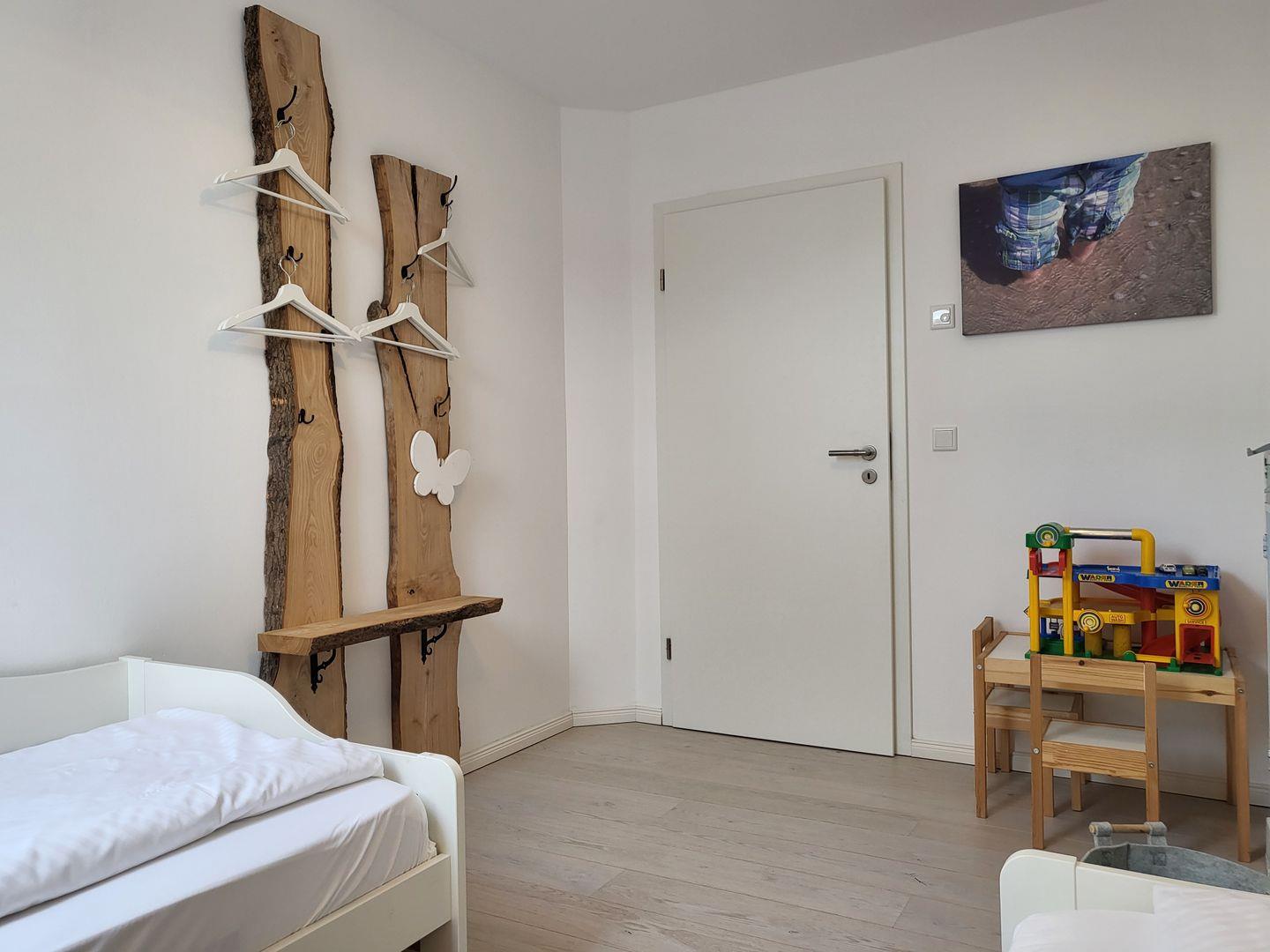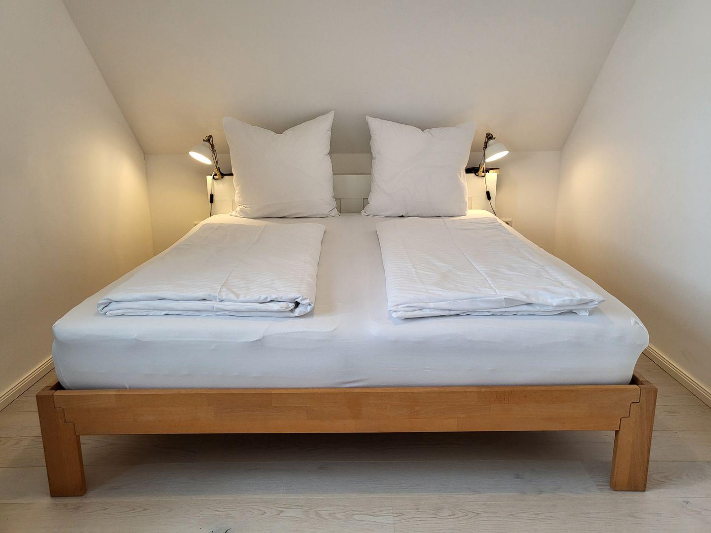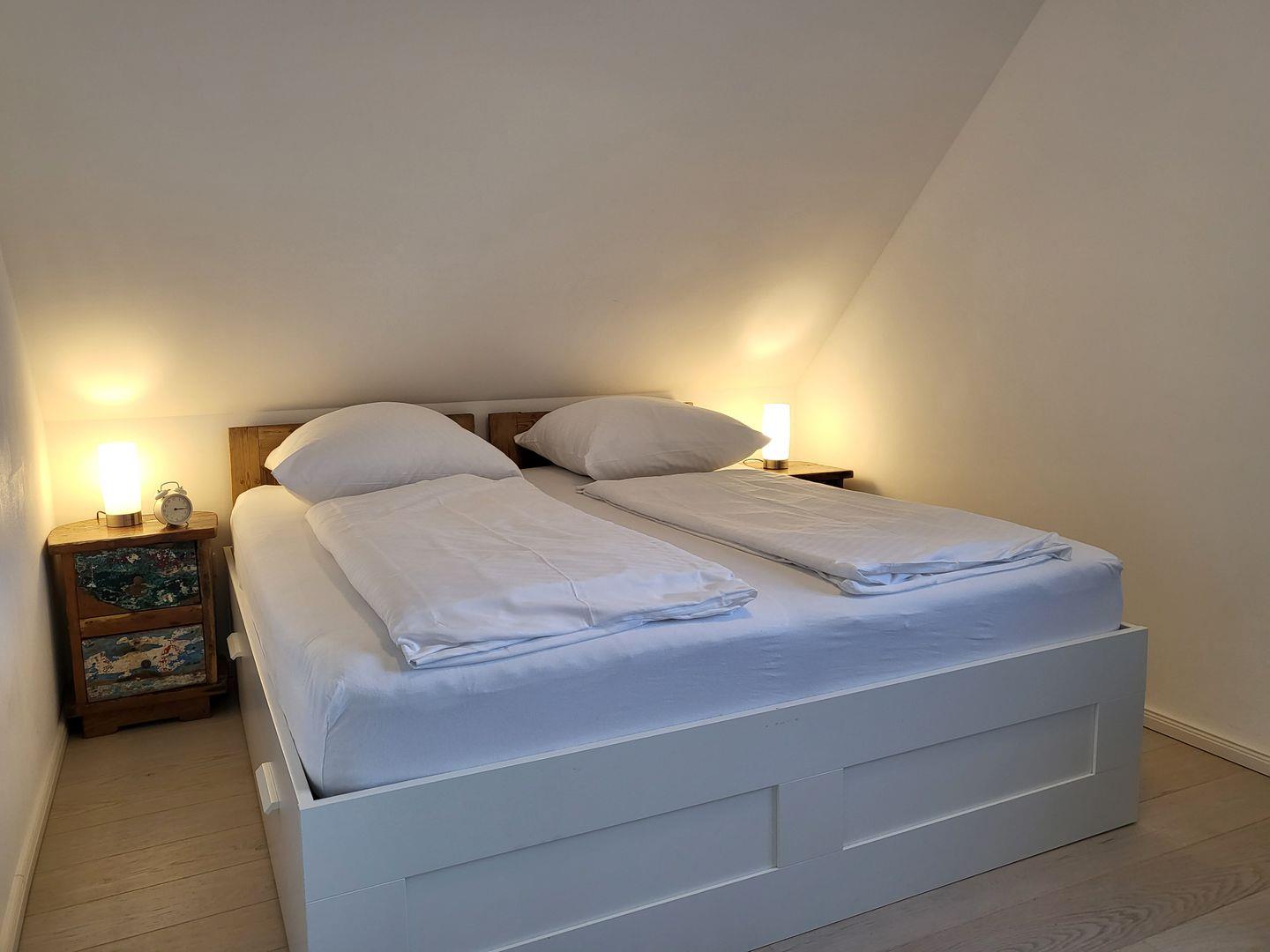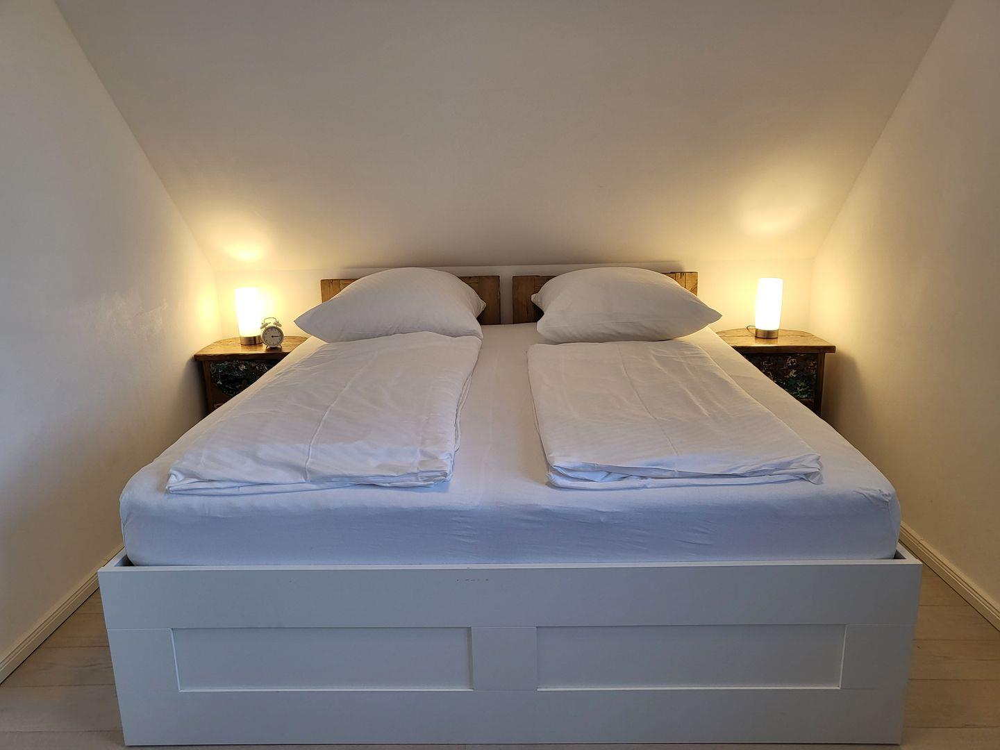 Eines der Schlafräume ist ausgestattet mit einem Doppelbett mit verstellbaren Lattenrosten (180x200cm) und einem Smart-TV, eines mit Doppelbett (180x200m) und ein Kinderzimmer mit zwei Einzelbetten (90x200cm).