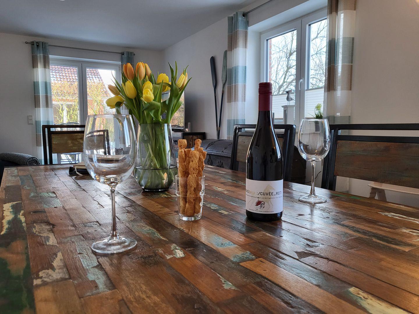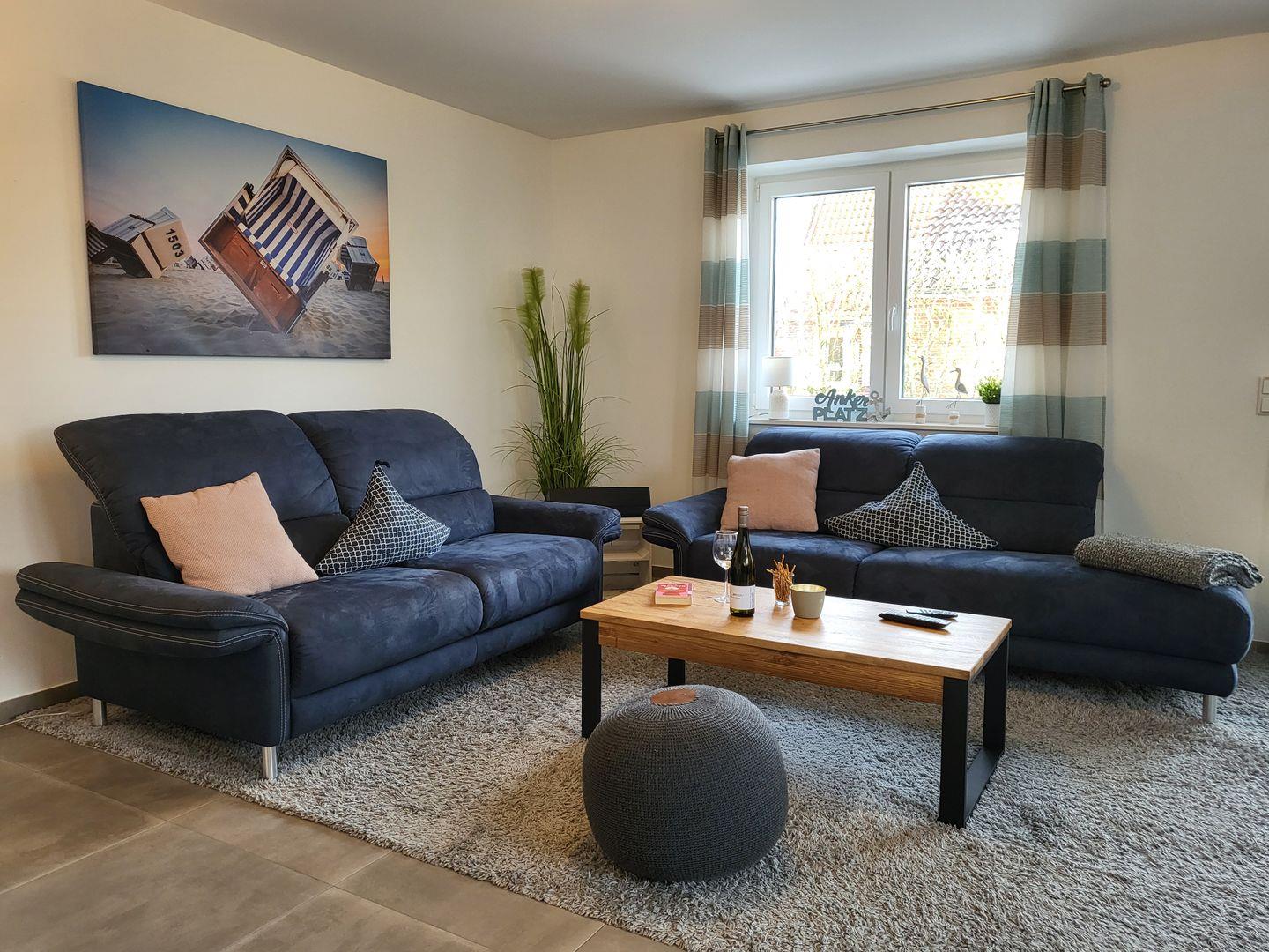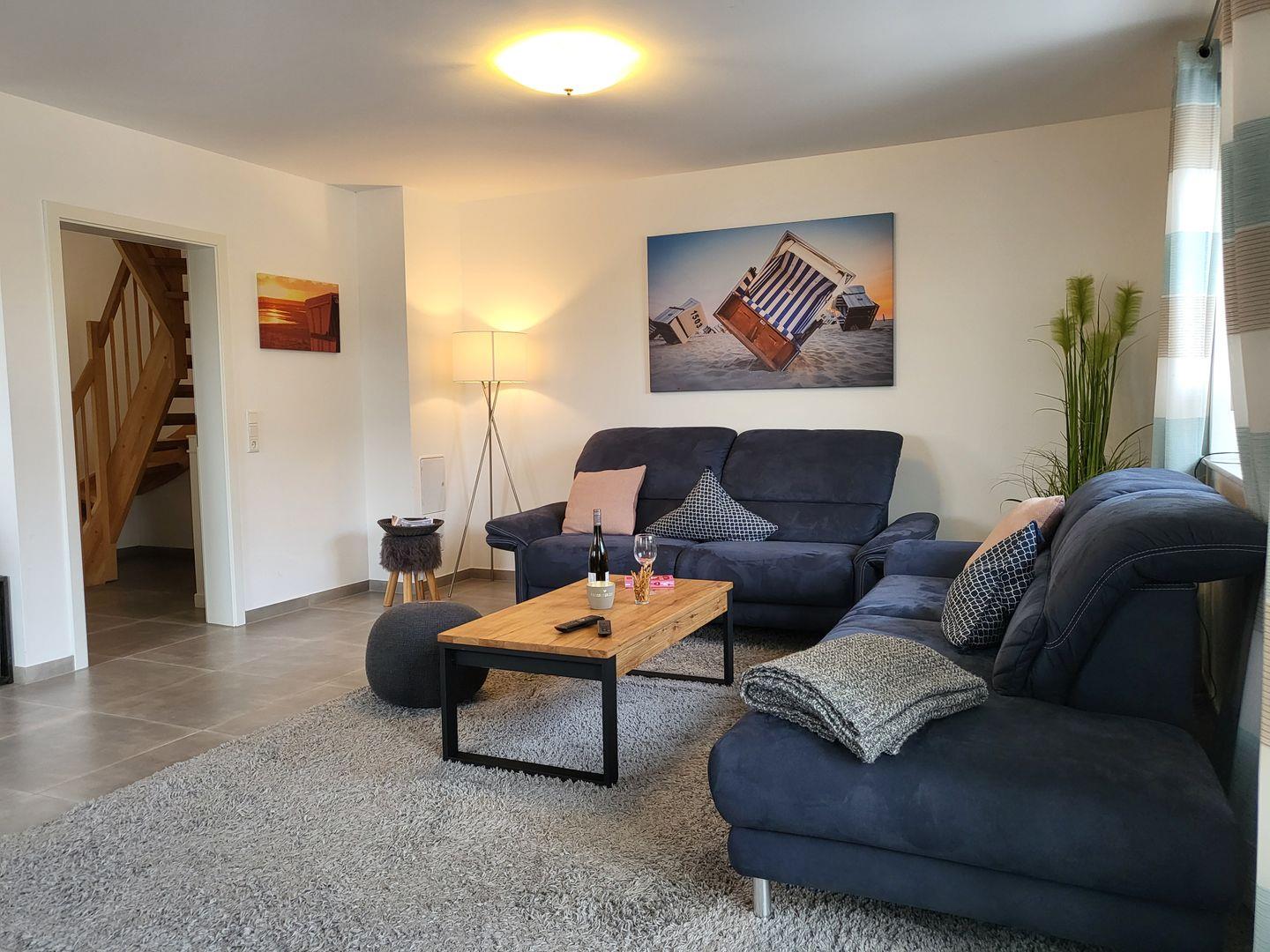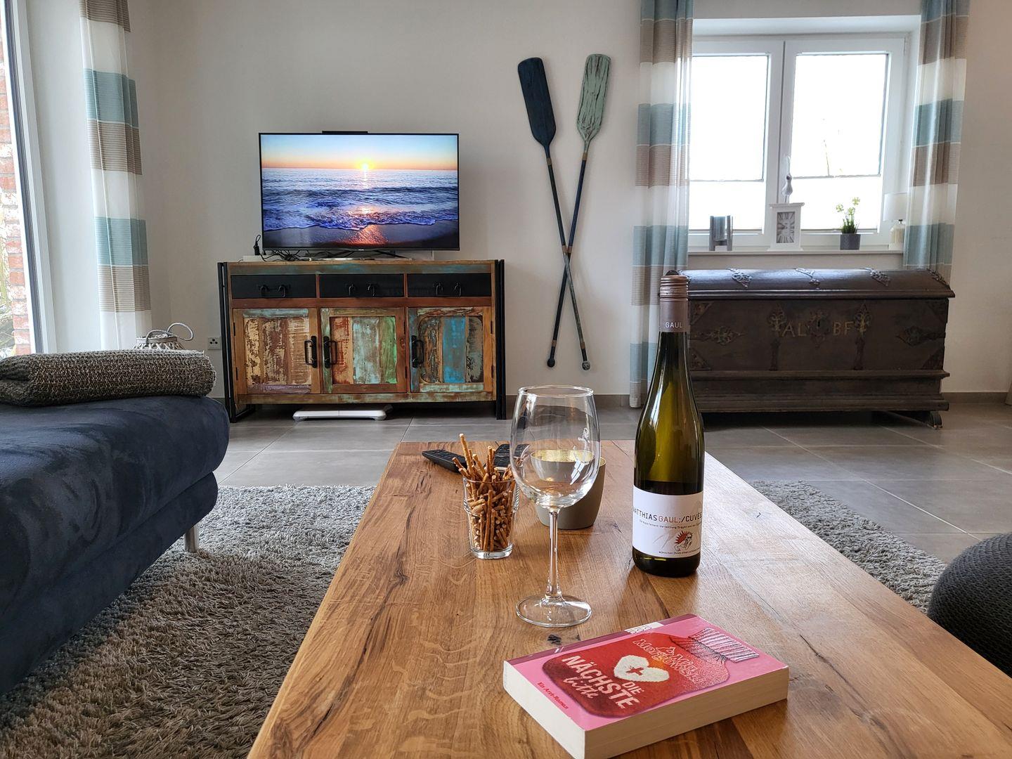 Im Wohraum steht den Gästen jederzeit ein Smart-TV mit kostenfreiem Netflix-Zugang, Magenta-TV, Disney+ und RTL+ sowie einem CD-Spieler und einer kleinen Spielesammlung für "schiet Wetter" zur Verfügung.