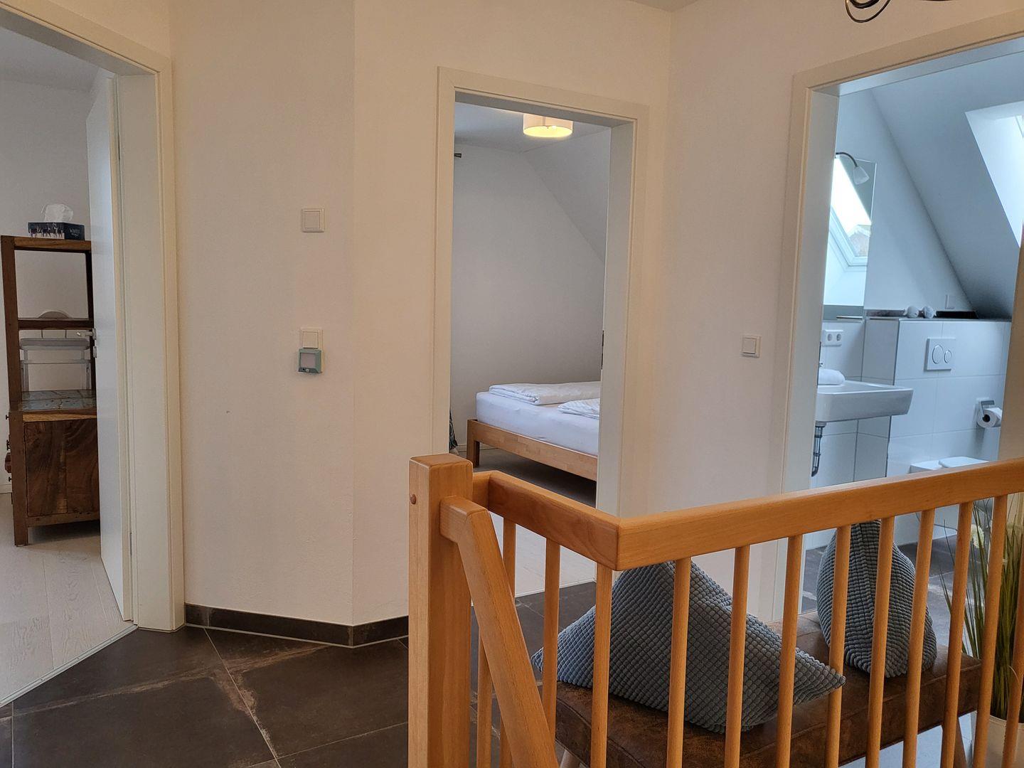 In das Obergeschoss gelangen Sie über eine Holztreppe zu den Schlafräumen.