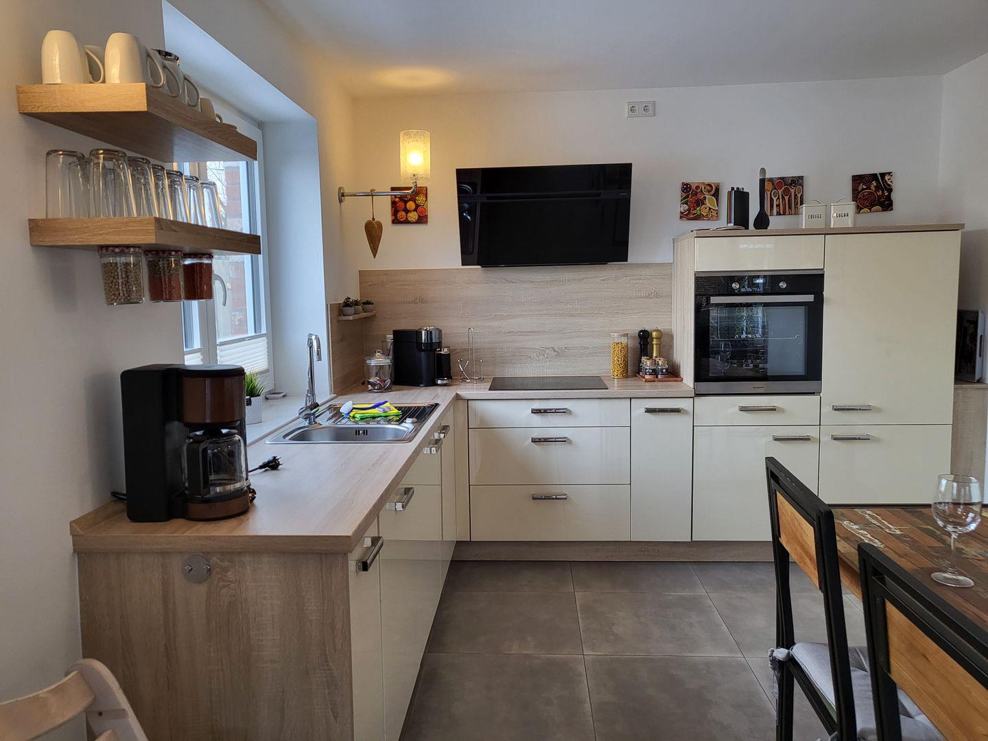 Die offene Wohnküche bietet Kaffeeliebhabern eine Filter- sowie Nespressomaschine, aber auch ein Espressokocher und Milchaufschäumer gehören hier zum Inventar.
