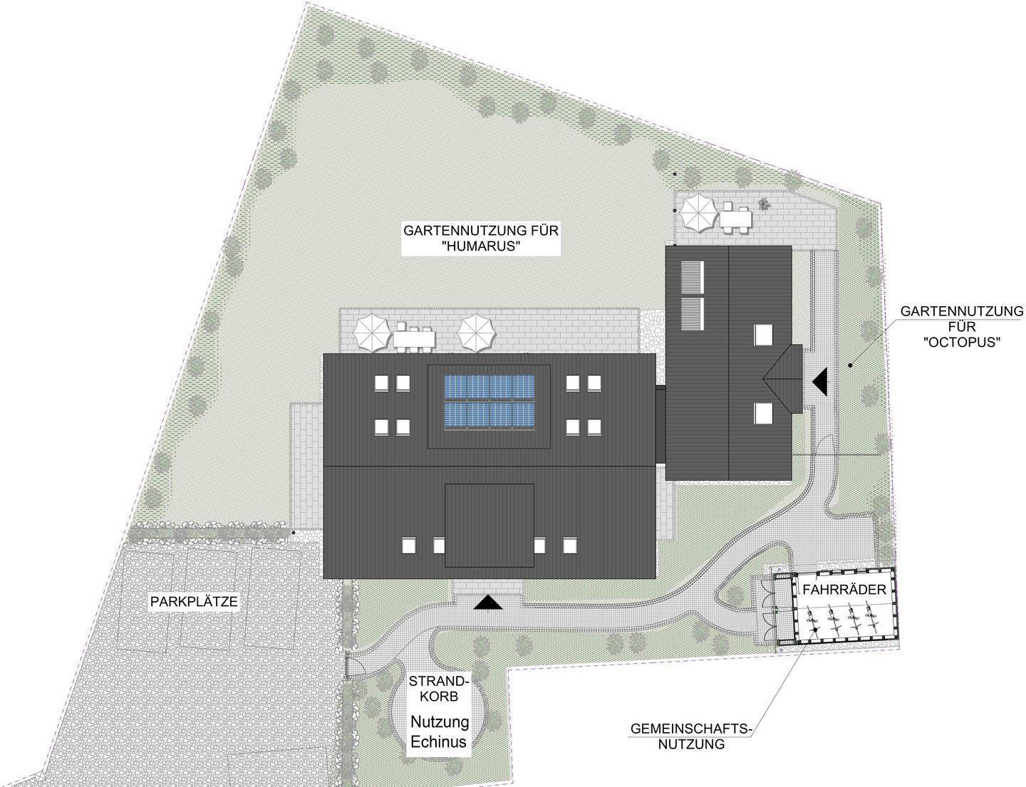 Das sehr sonnige Grundstück mit Stellplatz, großer Rasenfläche und zwei Terrassen- einer Frühstücksterrasse und einer Abendterrasse - ist mit Pflanzen aus der Region angelegt.