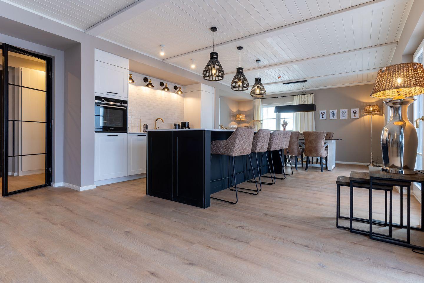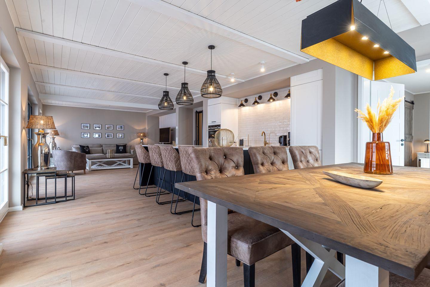 Im Wohnbereich erwartet Sie ein loftartiges Gefühl, denn das lichtdurchflutete Wohnzimmer, die offene Küche sowie das wunderschöne Esszimmer mit luxuriösen Möbeln gehen alle ineinander über. Die Küche verfügt über hochwertige Elektrogeräte und genügend Platz zum gemeinsamen Kochen, sowie verweilen.