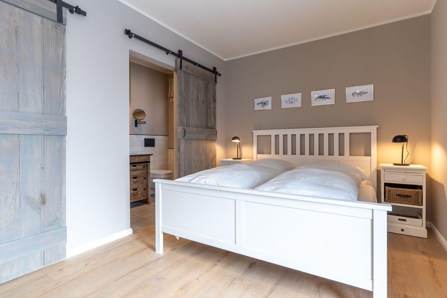 Das erste liebevoll eingerichtete Schlafzimmer verfügt über ein Doppelbett, einen TV, einen kleinen begehbaren Kleiderschrank sowie über ein Bad en suite. Warme Materialien, Möbel, Farben und Stoffe lassen einen sofort im Urlaub ankommen und sich Wohlfühlen. Die Terrasse vor diesem Schlafzimmer lädt zu einem ersten Morgenkaffee ein.