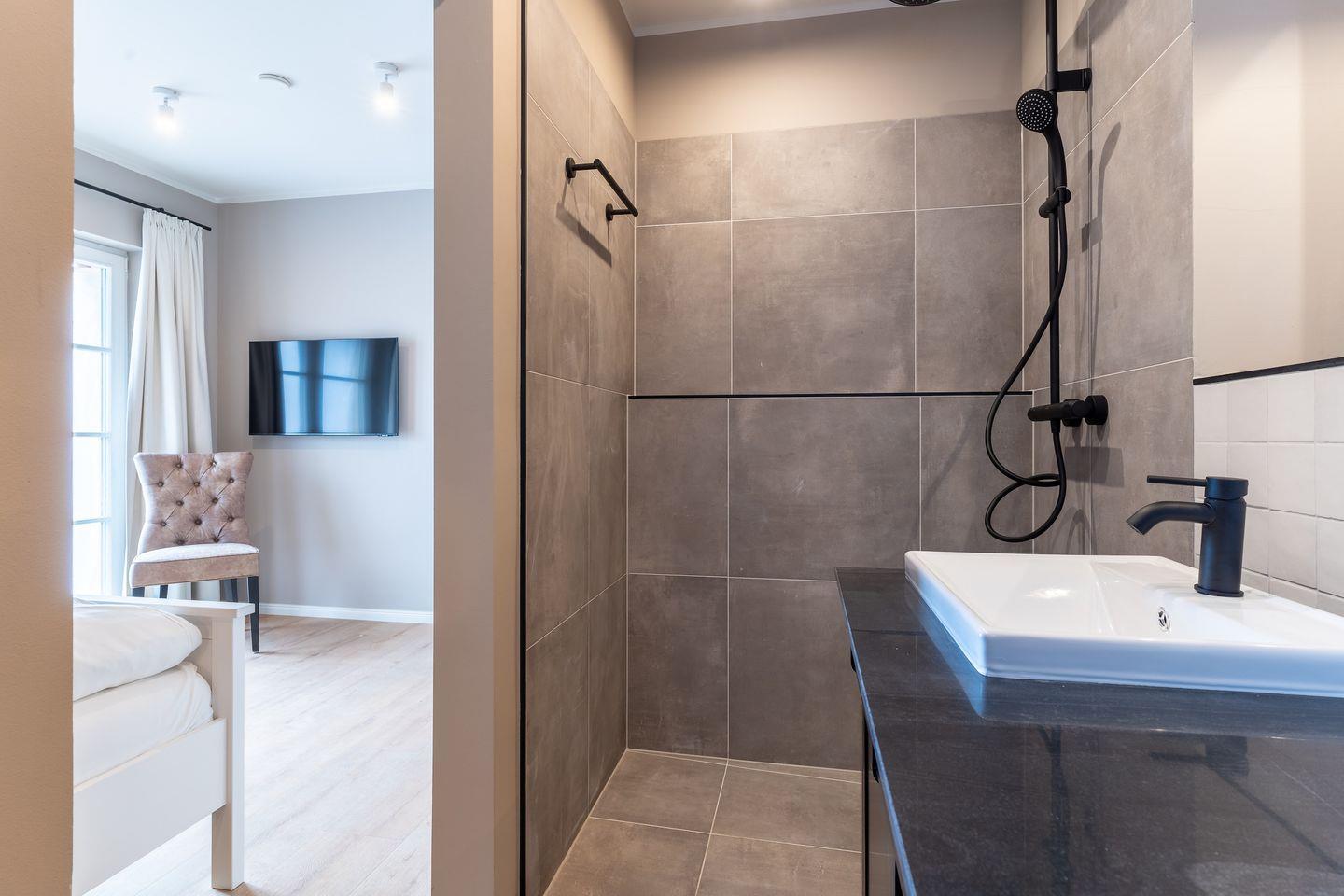 Über einen schönen Flur gelangt man in ein voll ausgestattetes Badezimmer mit einer Rainshower-Glas-Dusche, einem WC sowie einem großzügigen Doppelwaschtisch.