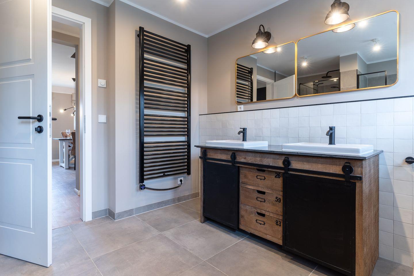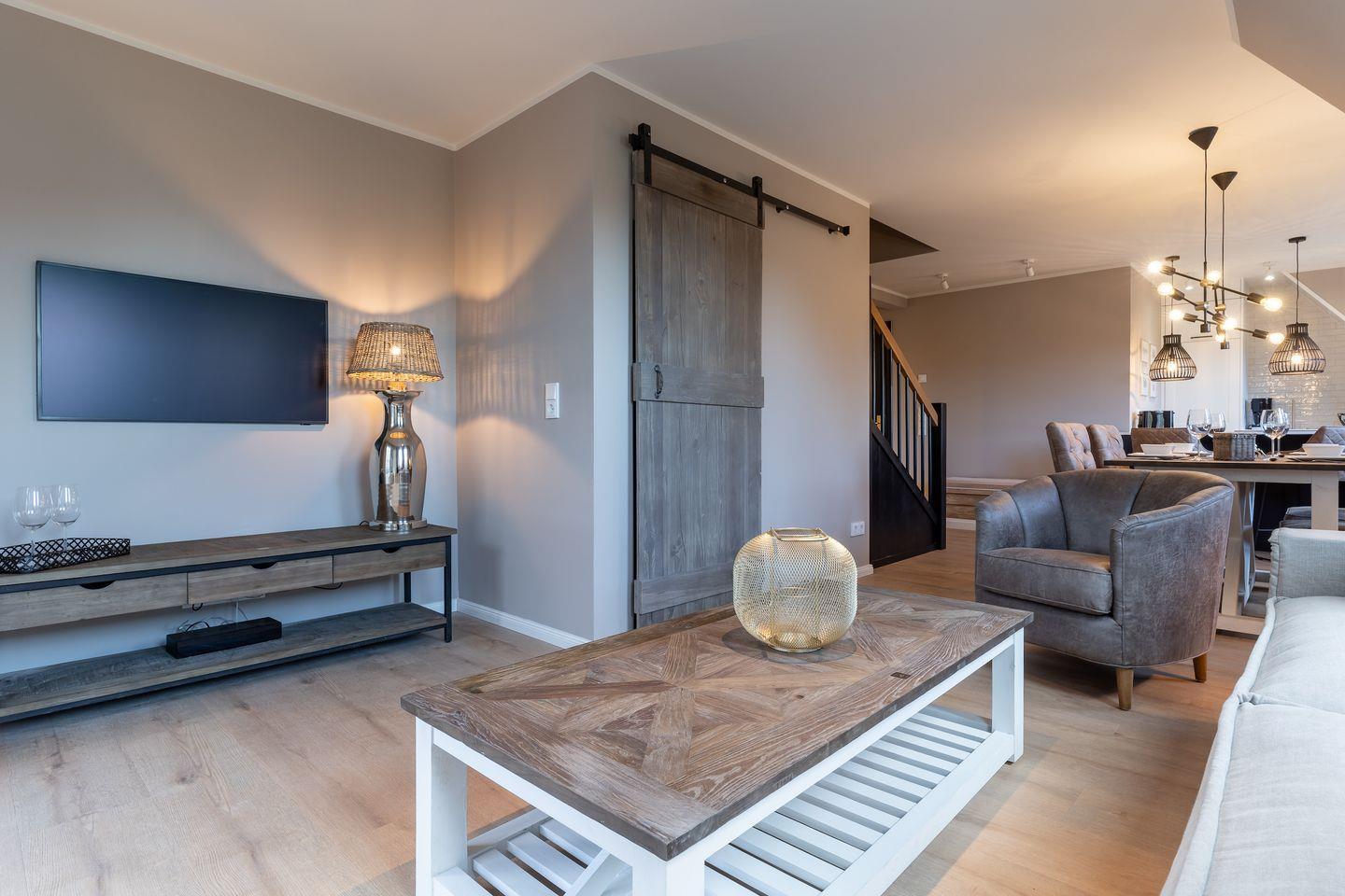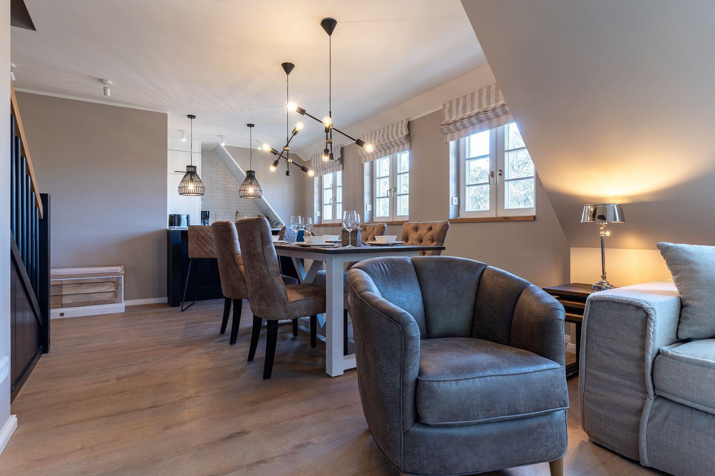 Im Wohnbereich erwartet Sie ein loftartiges Gefühl, denn das lichtdurchflutete Wohnzimmer, die offene Küche sowie das wunderschöne Esszimmer mit luxuriösen Möbeln gehen alle ineinander über. Die Küche verfügt über hochwertige Elektrogeräte und genügend Platz zum gemeinsamen Kochen und Verweilen. Besonders charmant ist die große Loggia, die zum Abendessen draußen einlädt.