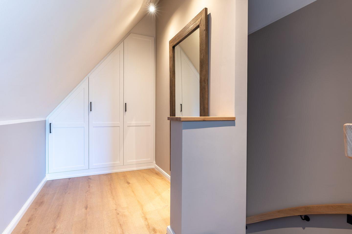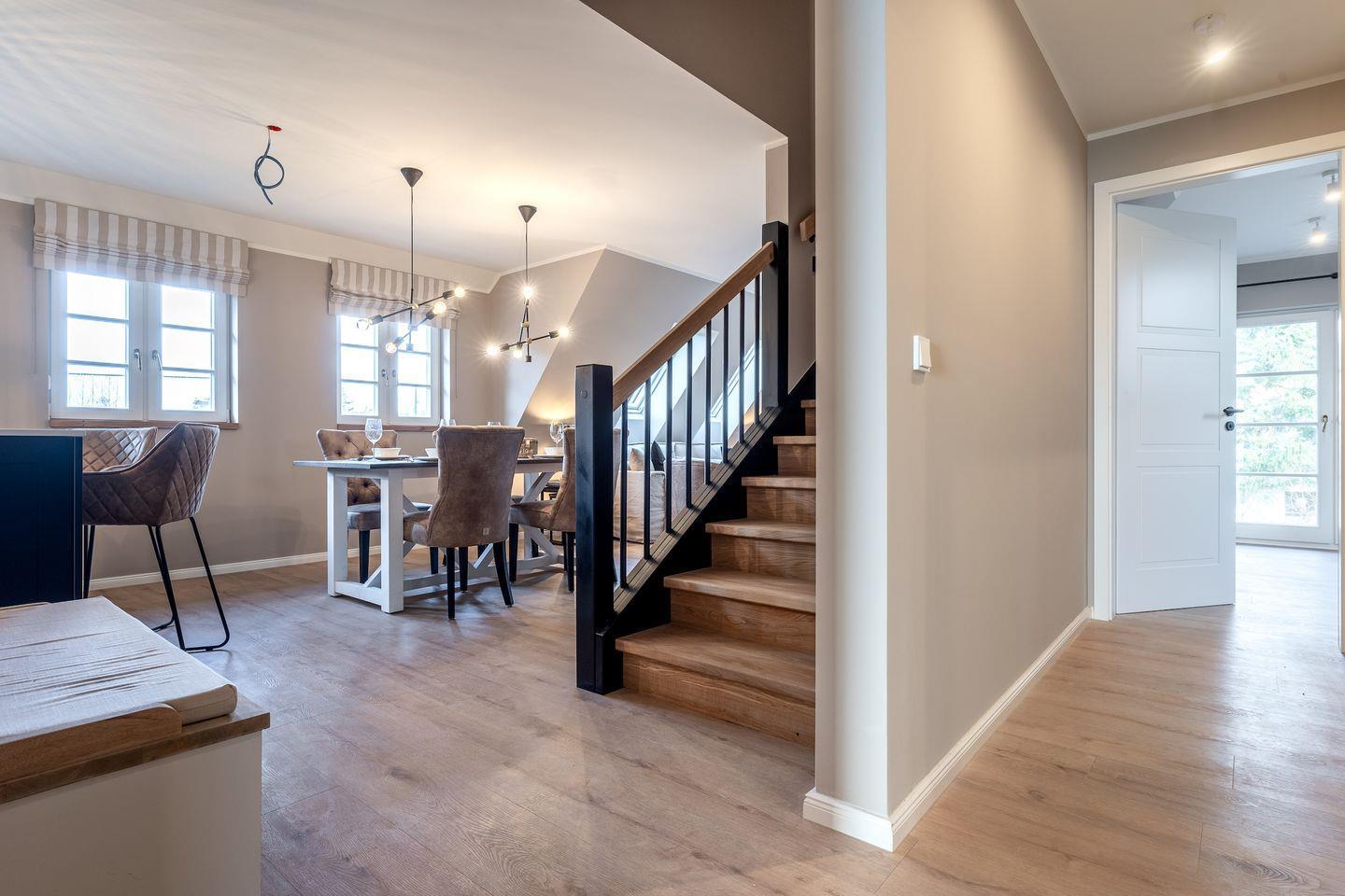 Der Flur bietet ausreichend Stauraum für Schuhe, Jacken und Schirme. Unter der Treppe befindet sich ein kleiner Abstellraum mit Waschmaschine.