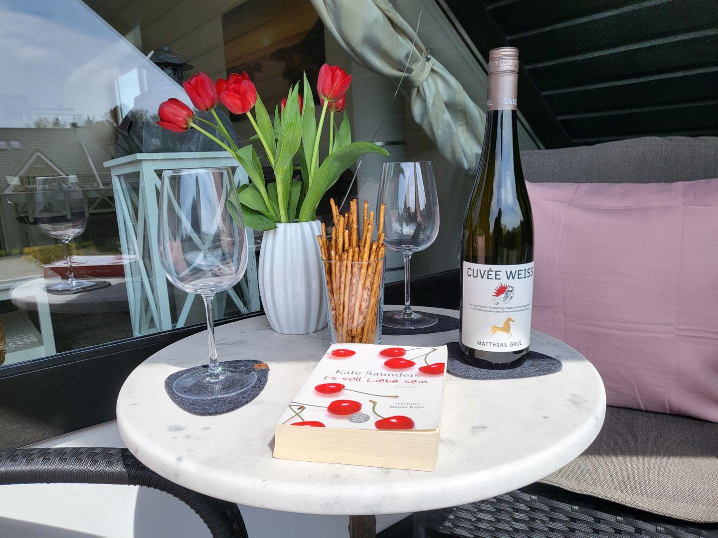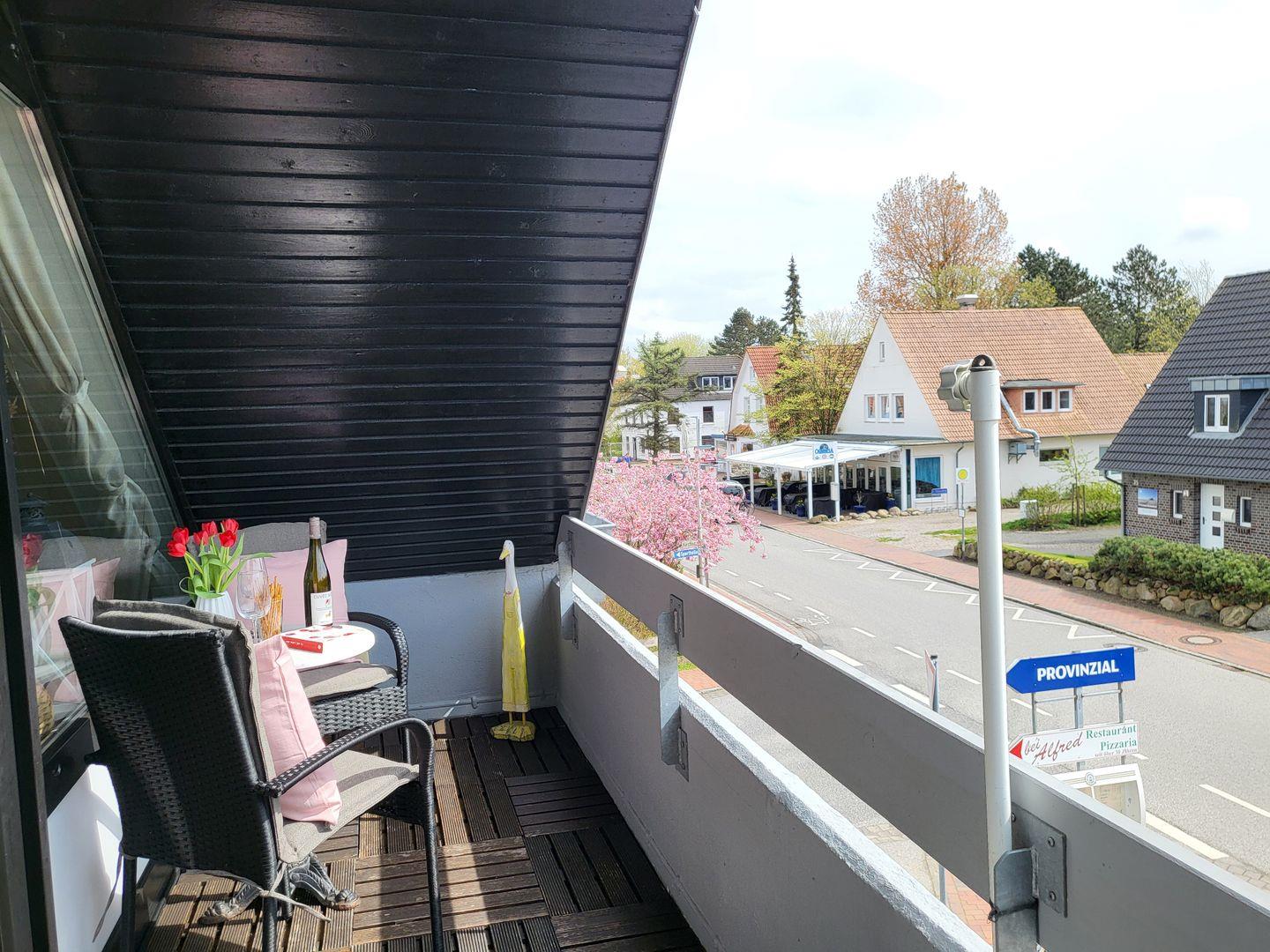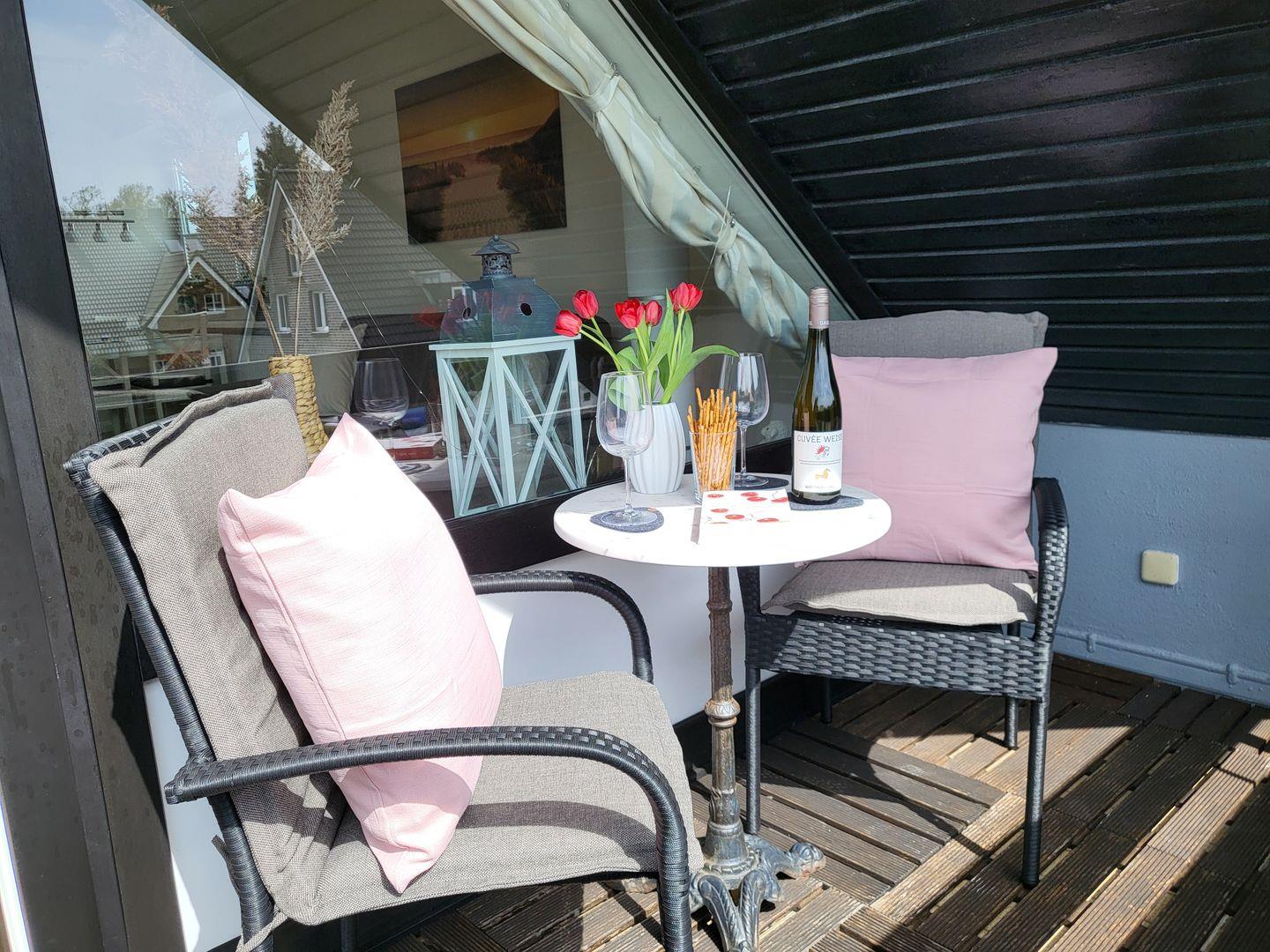 Vom Wohnzimmer aus geht es auf den Balkon, auf dem man bei schönem Wetter einfach entspannen kann.
