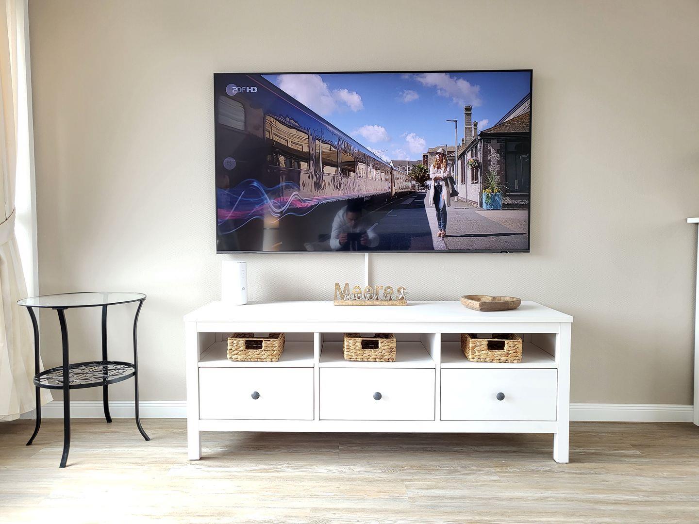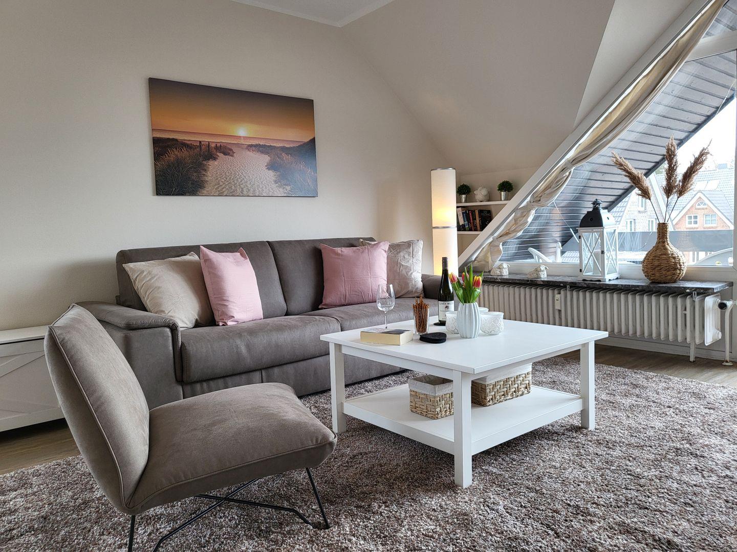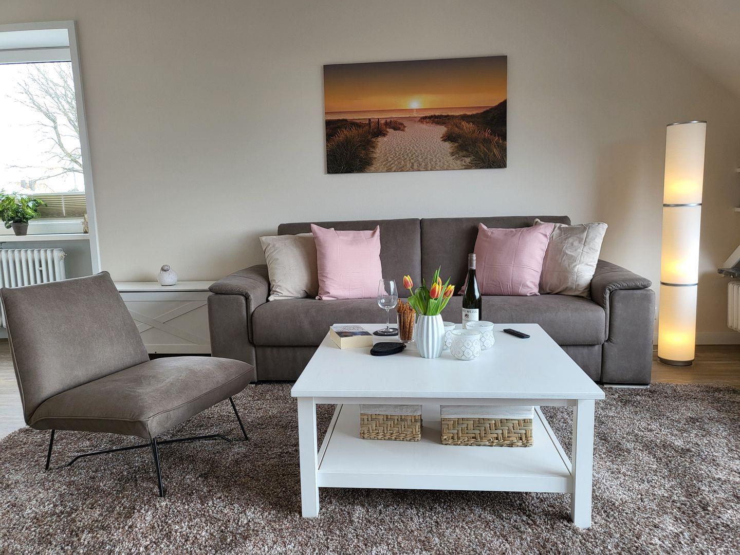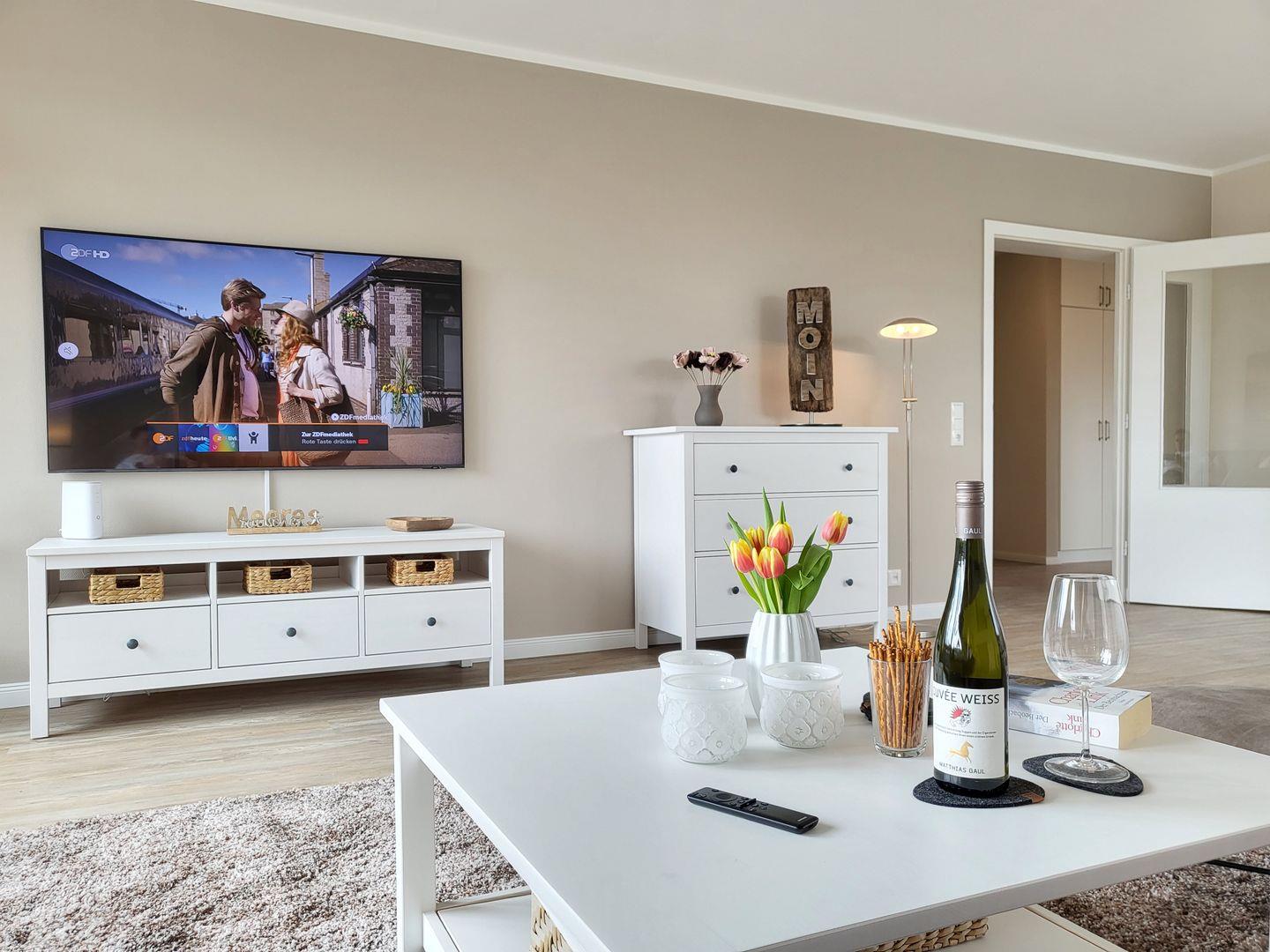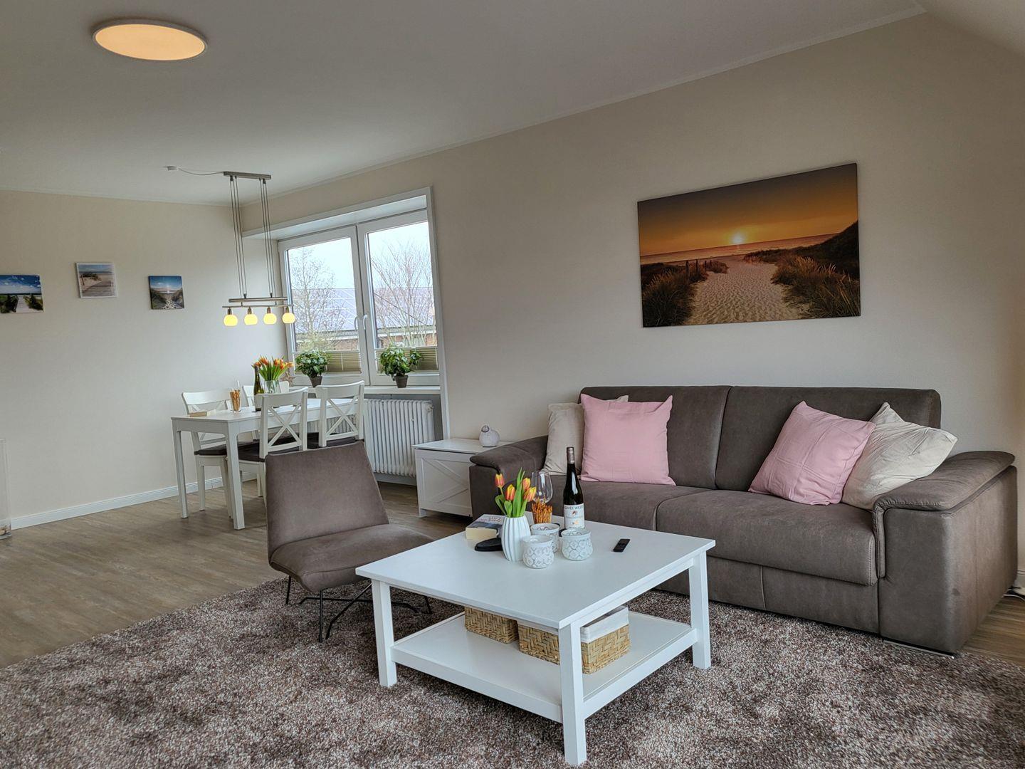 Der große Wohnraum ist modern und maritim eingerichtet. Er ist mit einer komfortablen Couch, einem Flachbild-TV mit Internetzugang und einem Fernsehsessel ausgestattet. Der großzügige Esstisch bietet bis zu 4 Personen Platz.