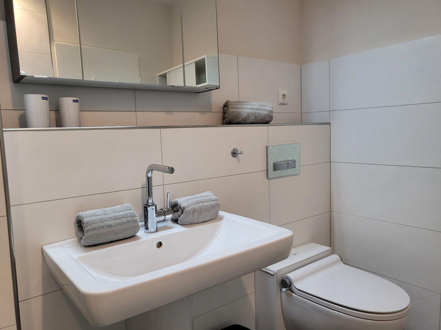 Das moderne und hochwertige Badezimmer ist mit einer bodengleichen Dusche und einem WC ausgestattet.
