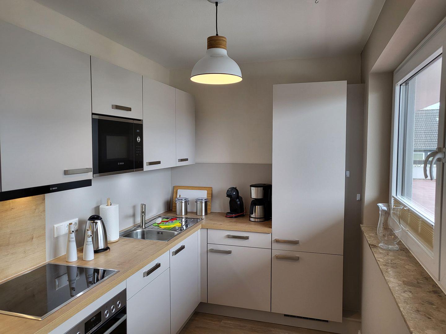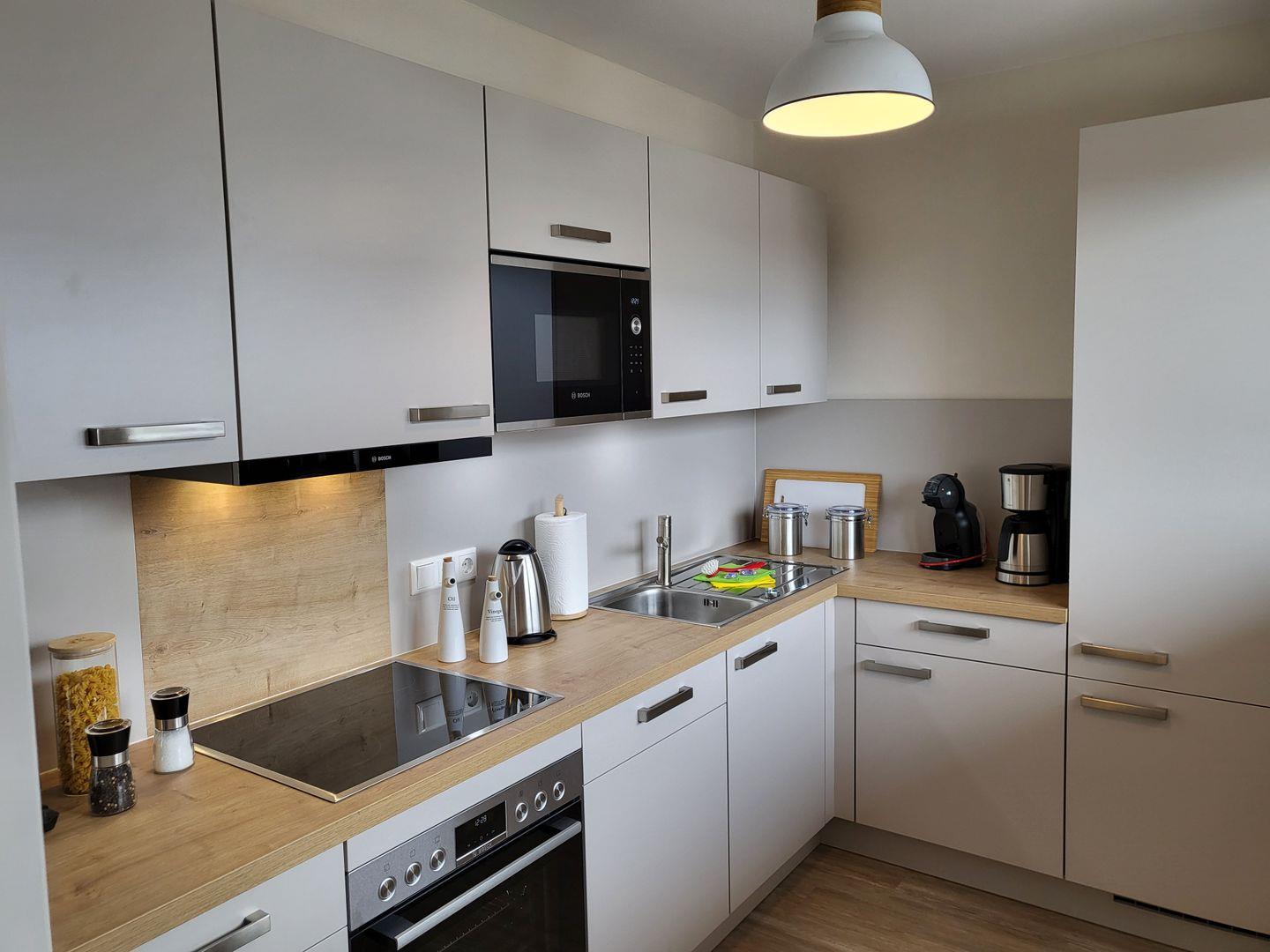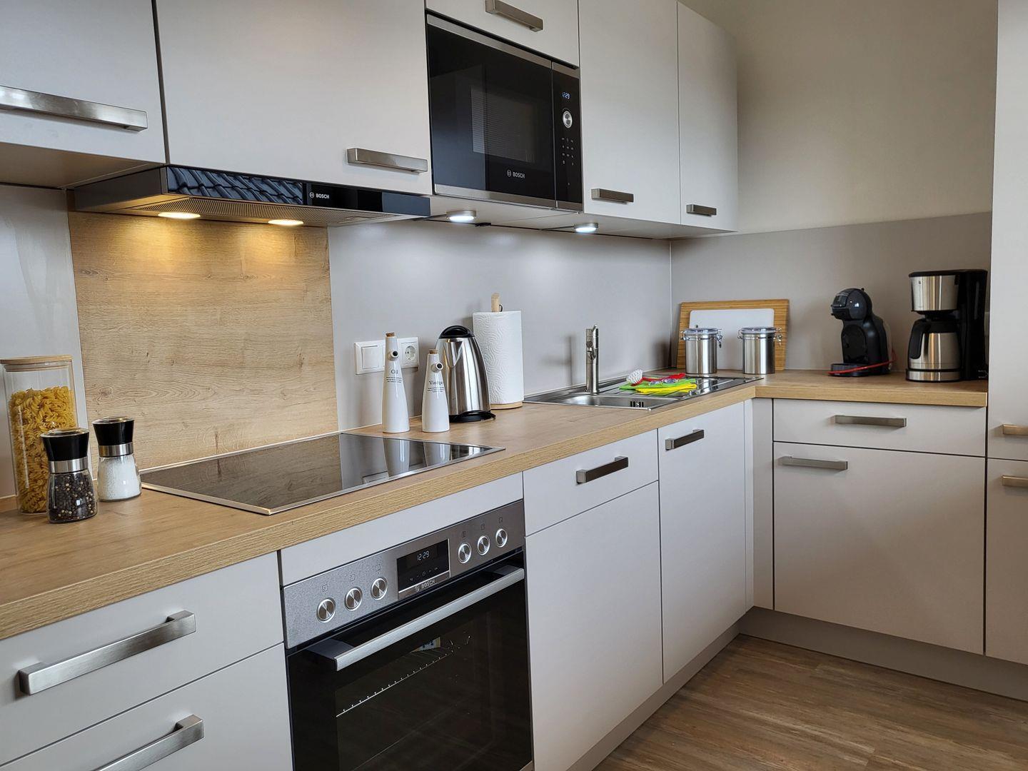 Die separate Küche ist hochwertig und vollumfassend mit Cerankochfeld, Backofen, Geschirrspüler, einem Kühlschrank mit separaten Gefrierfach, Mikrowelle, Kaffemaschine, Toaster und weiteren Kleingeräten usw. ausgestattet.