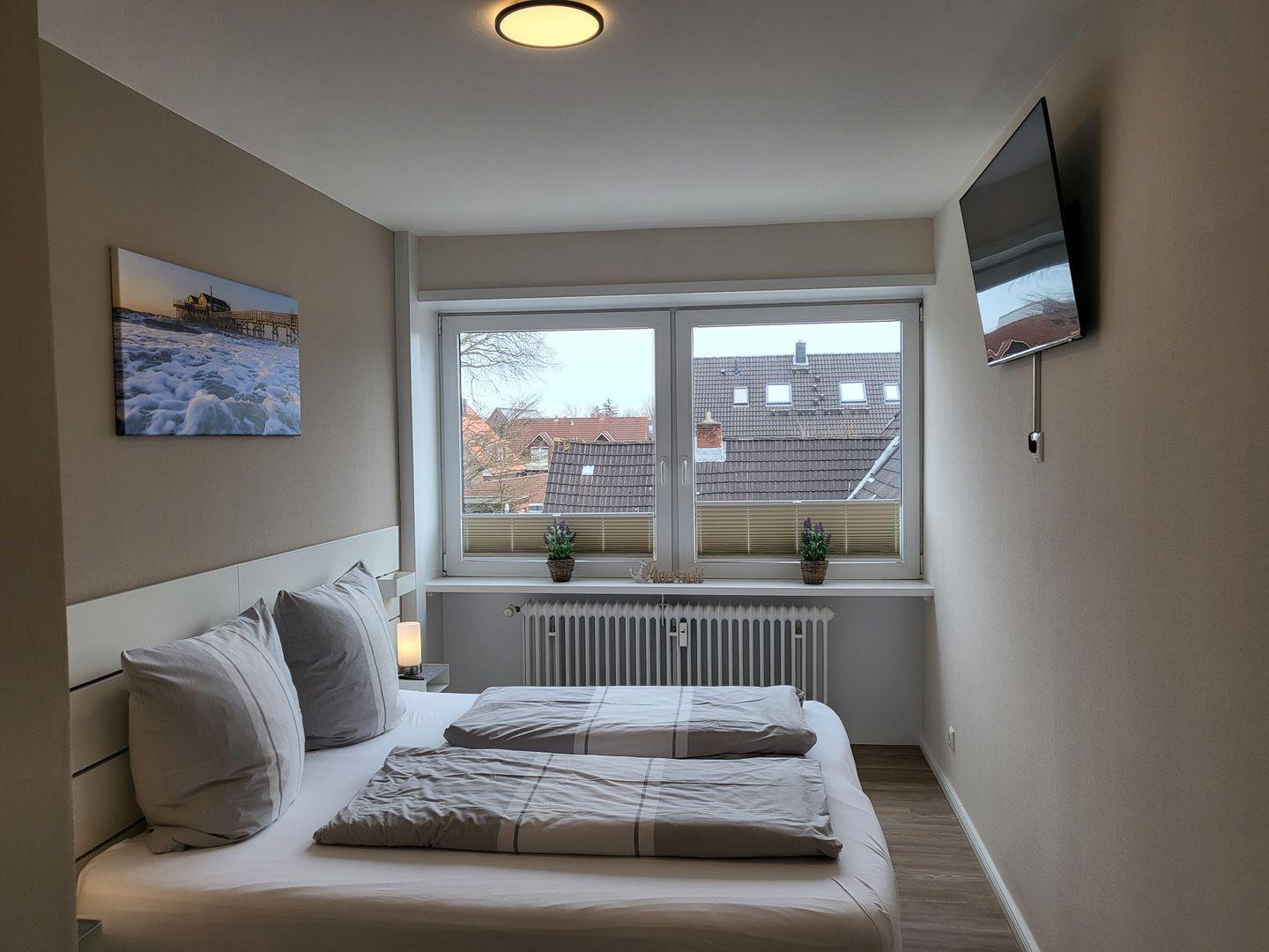 Ein geräumiges Schlafzimmer bietet ein komfortables Doppelbett (180x200cm) und einen Flachbild-TV mit Internetzugang.