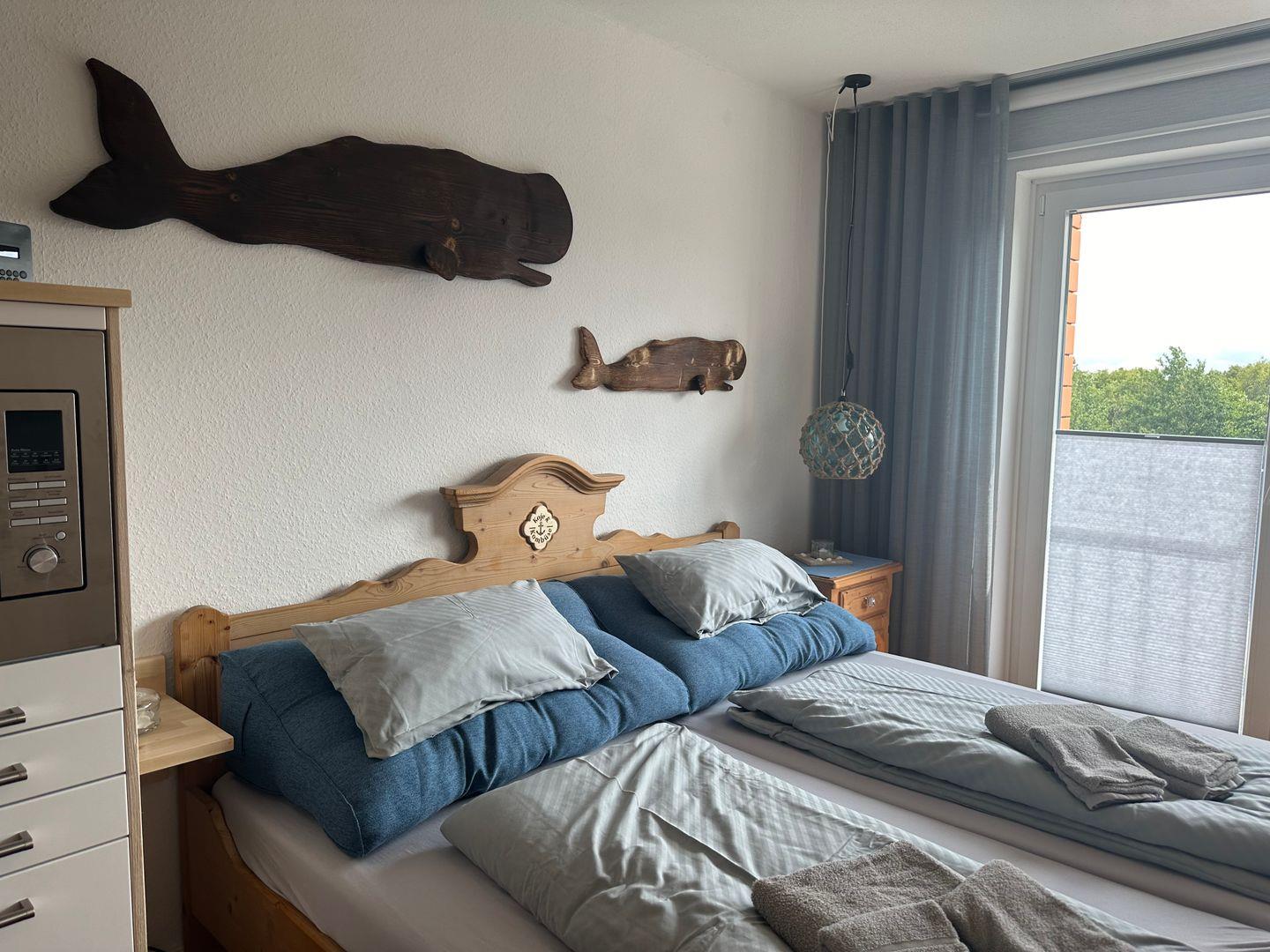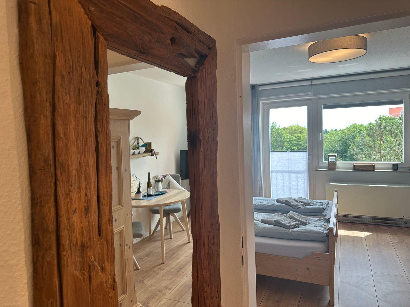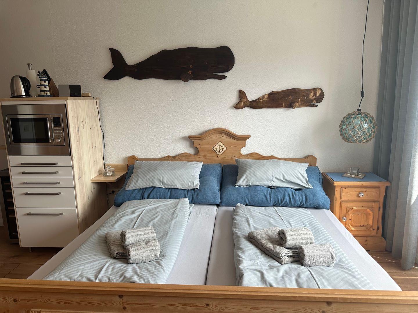 Durch die große Fensterfront wirkt der kombinierte Wohn- und Schlafraum wunderbar hell und einladend – Hier fühlt man sich direkt gut aufgehoben. Zur Ausstattung gehört hier das komfortable Holzbett (2x2m). Für die multimediale Unterhaltung in der Ferienwohnung sorgen Flachbild-TV, ein Radio und kostenfreies W-LAN.