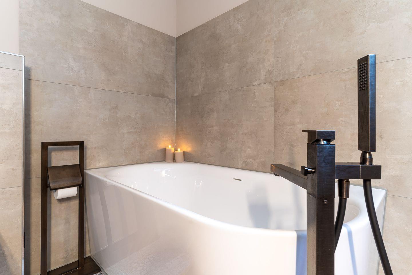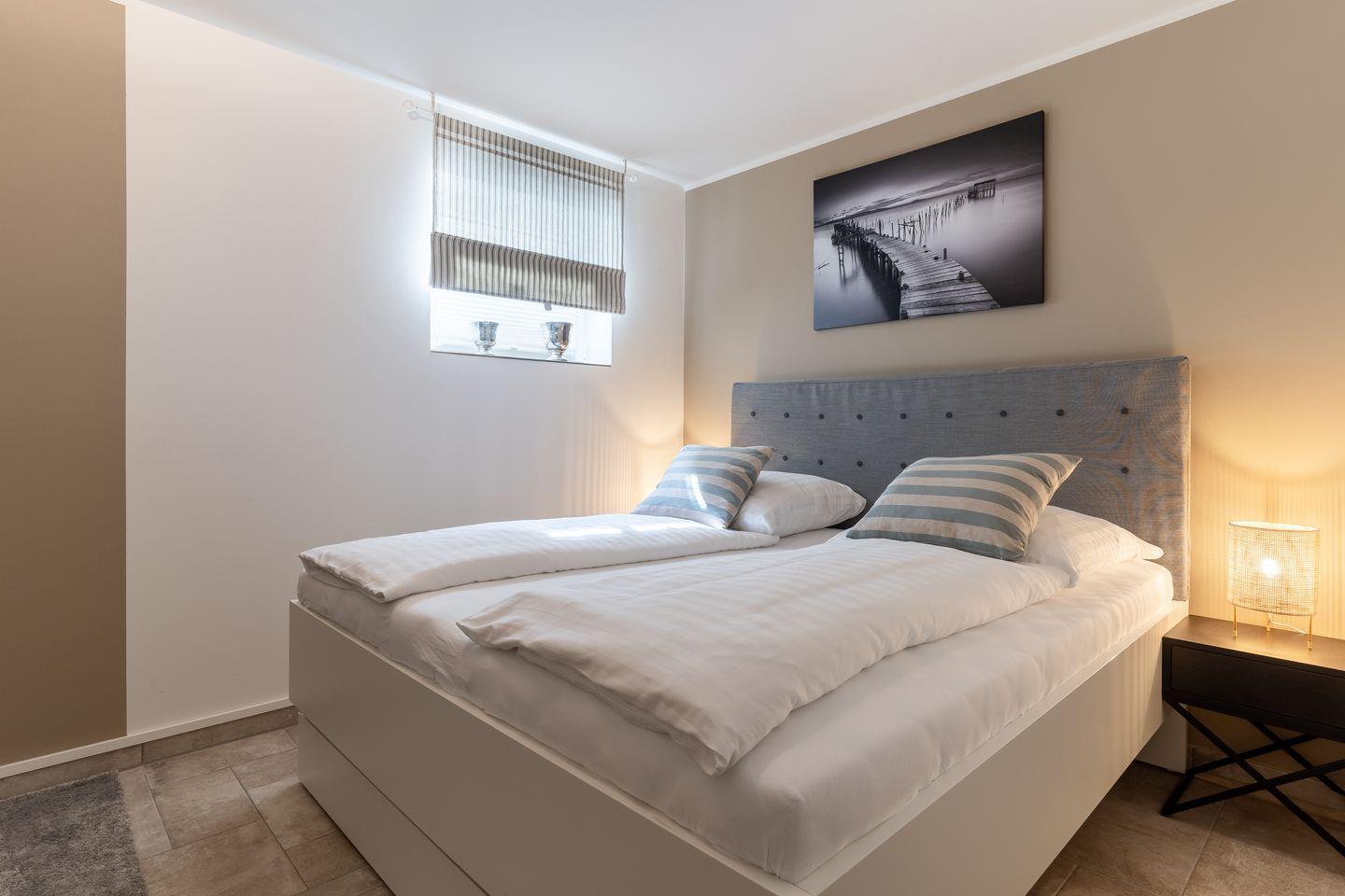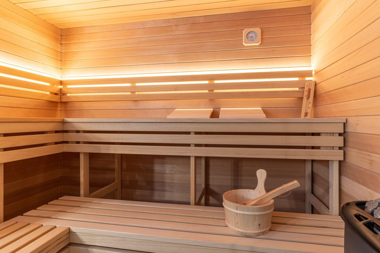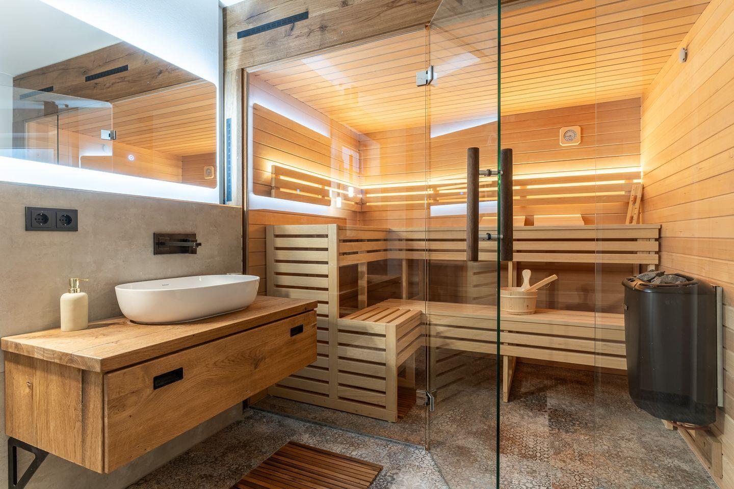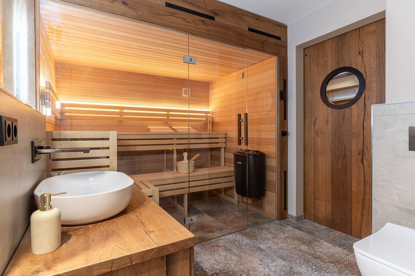 Im Untergeschoss befindet sich ein traumhaftes Bad mit Sauna, Dusche und Wannenbad. Ein Schlafzimmer mit einem Doppelbett (180x200cm + TV) befindet sich ebenfalls auf dieser Etage.