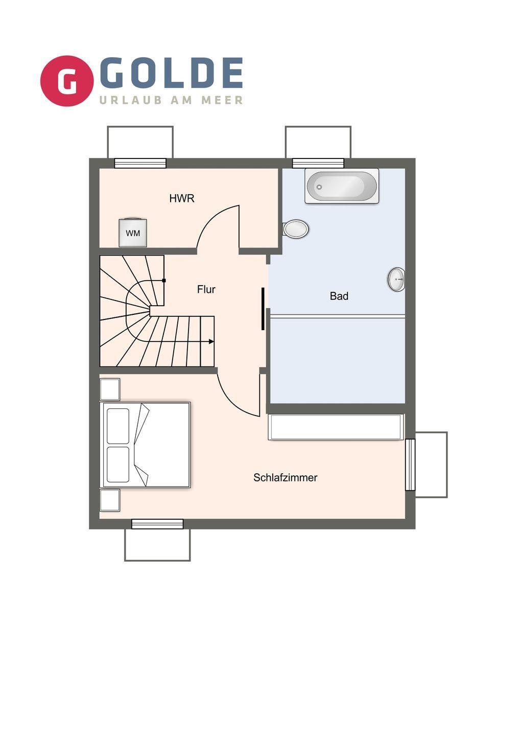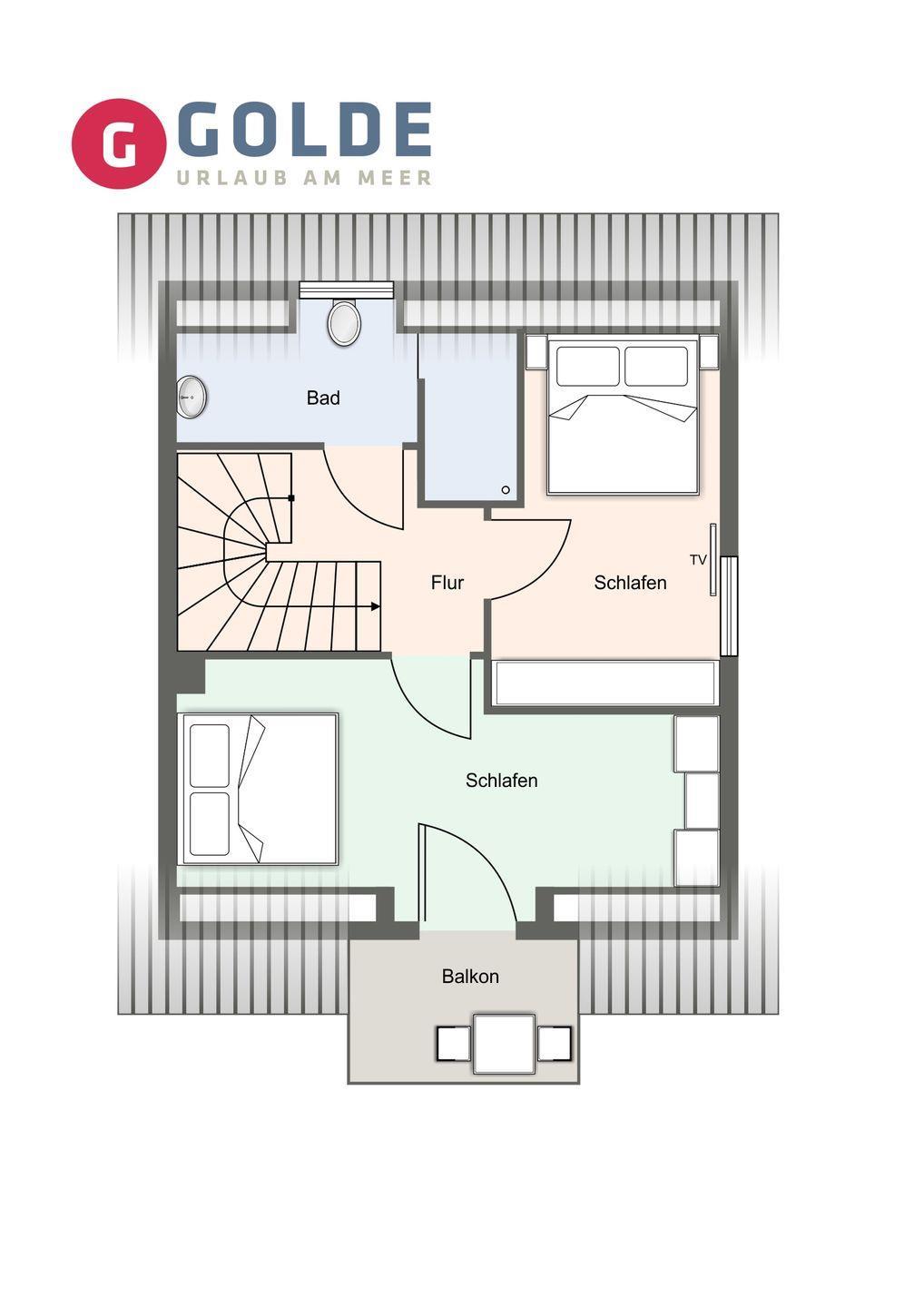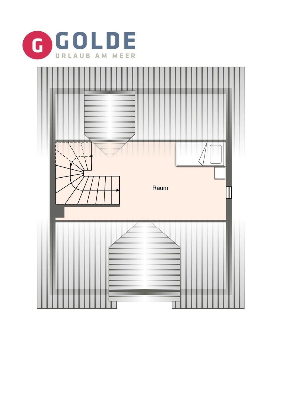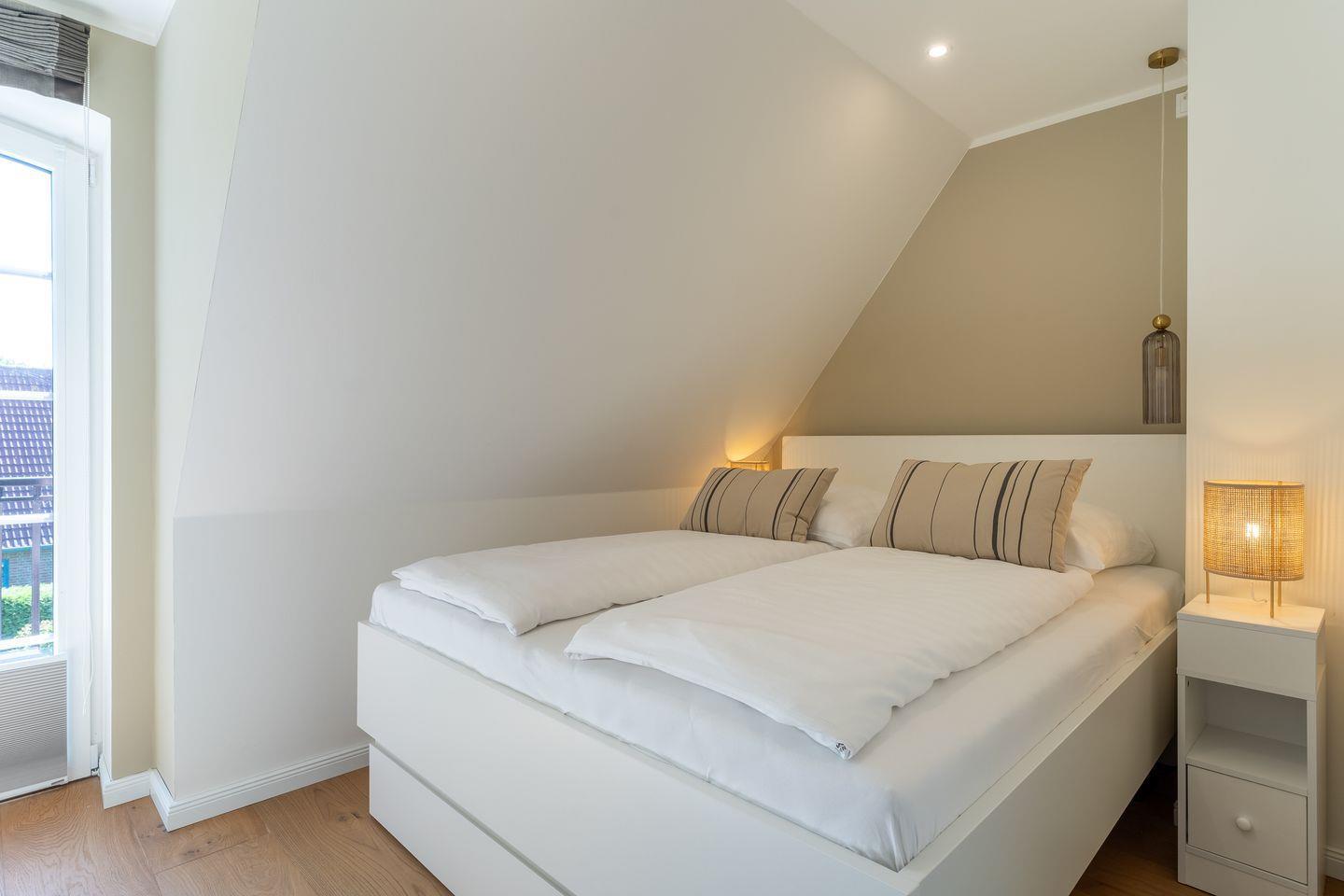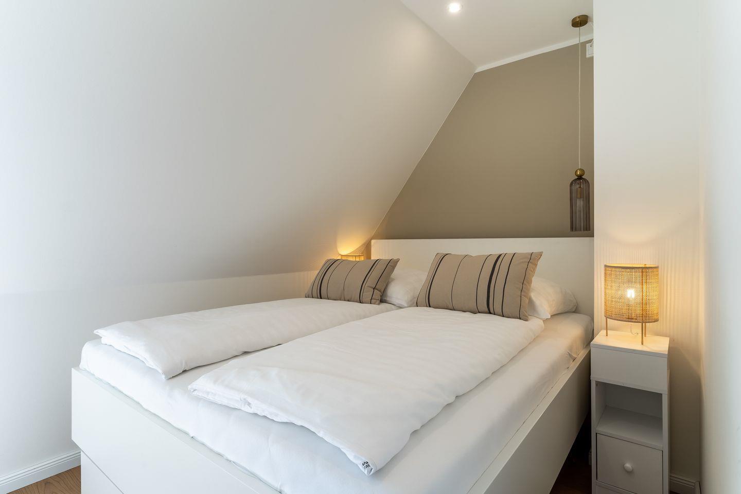 Über eine weitere Holztreppe geht es vom Flur ins Dachgeschoss. Hier finden Sie ein weiteres Zimmer mit zwei Einzelbetten (90x200cm).