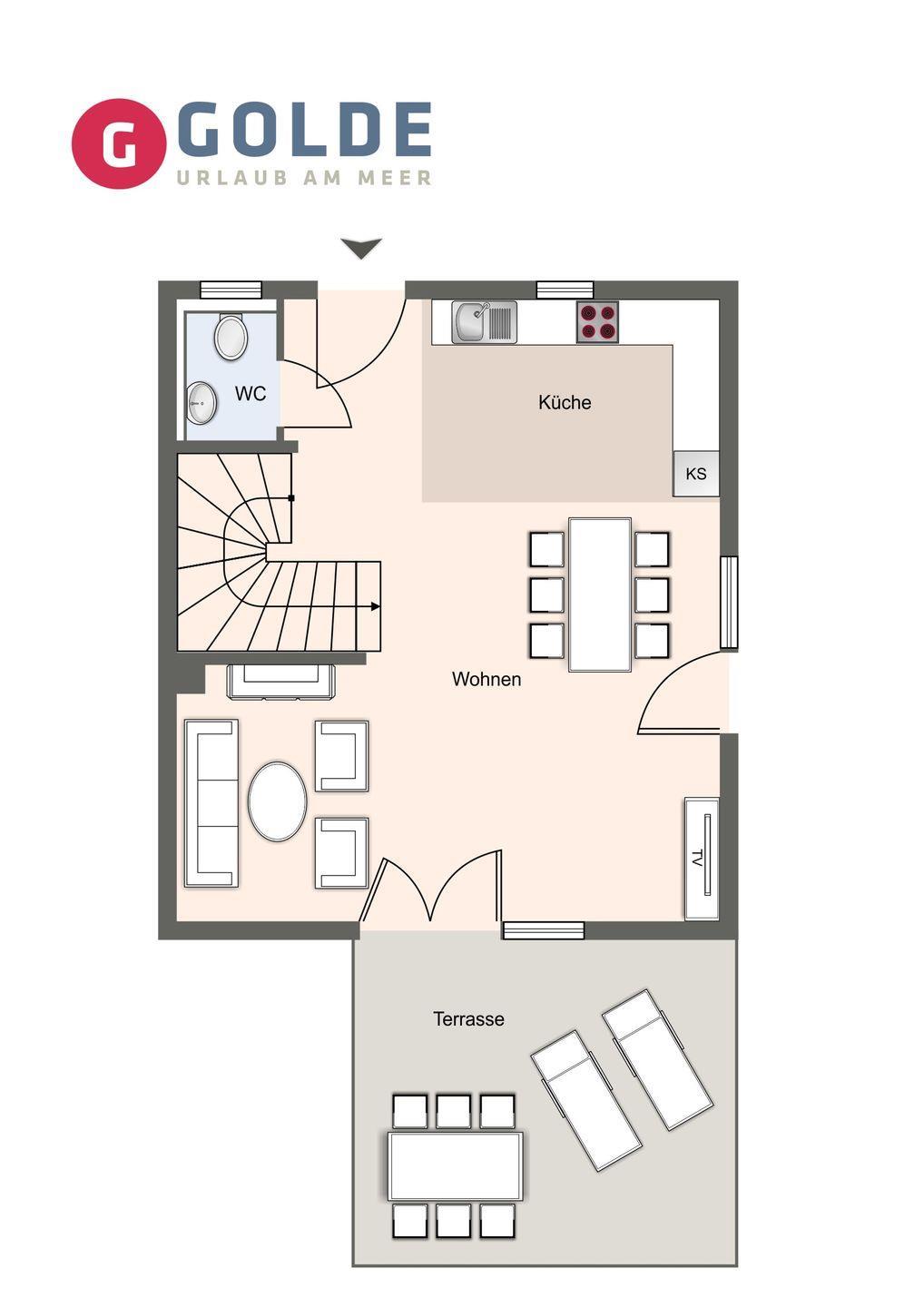 An den Wohnbereich schließt sich ein Gäste WC an.