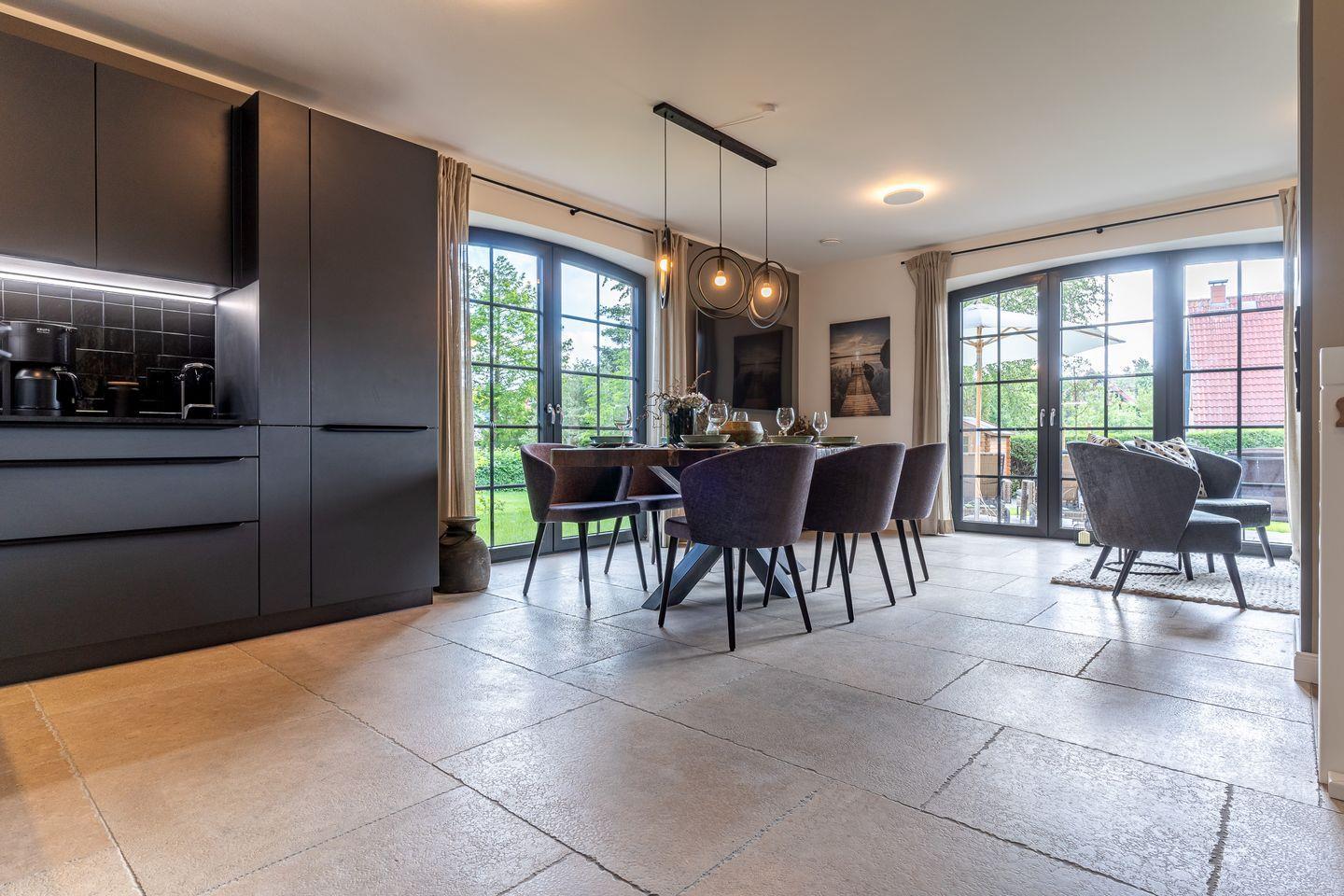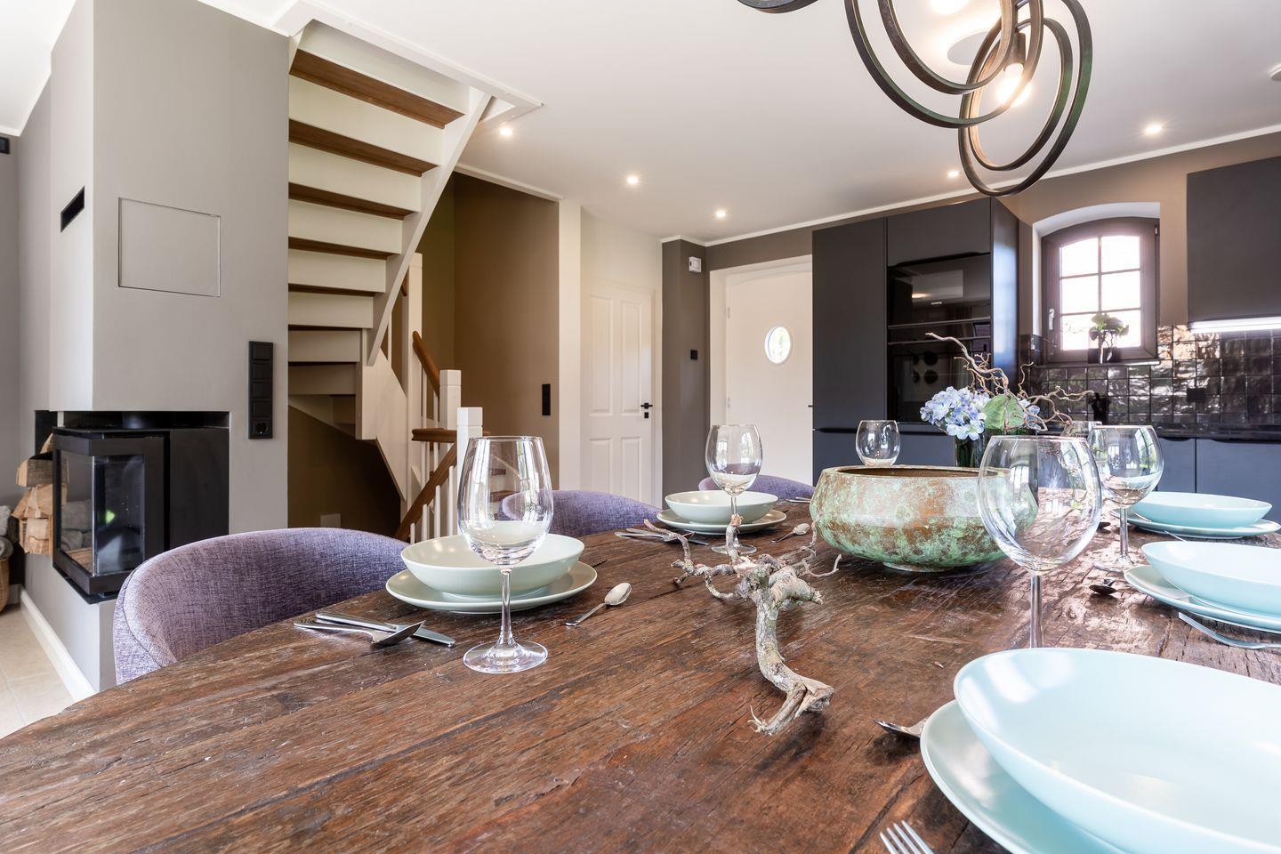 Der großzügige Wohnbereich bietet einen großen Esstisch mit Sitzplätzen für 6 Personen und eine gemütliche Sofaecke am Kamin.