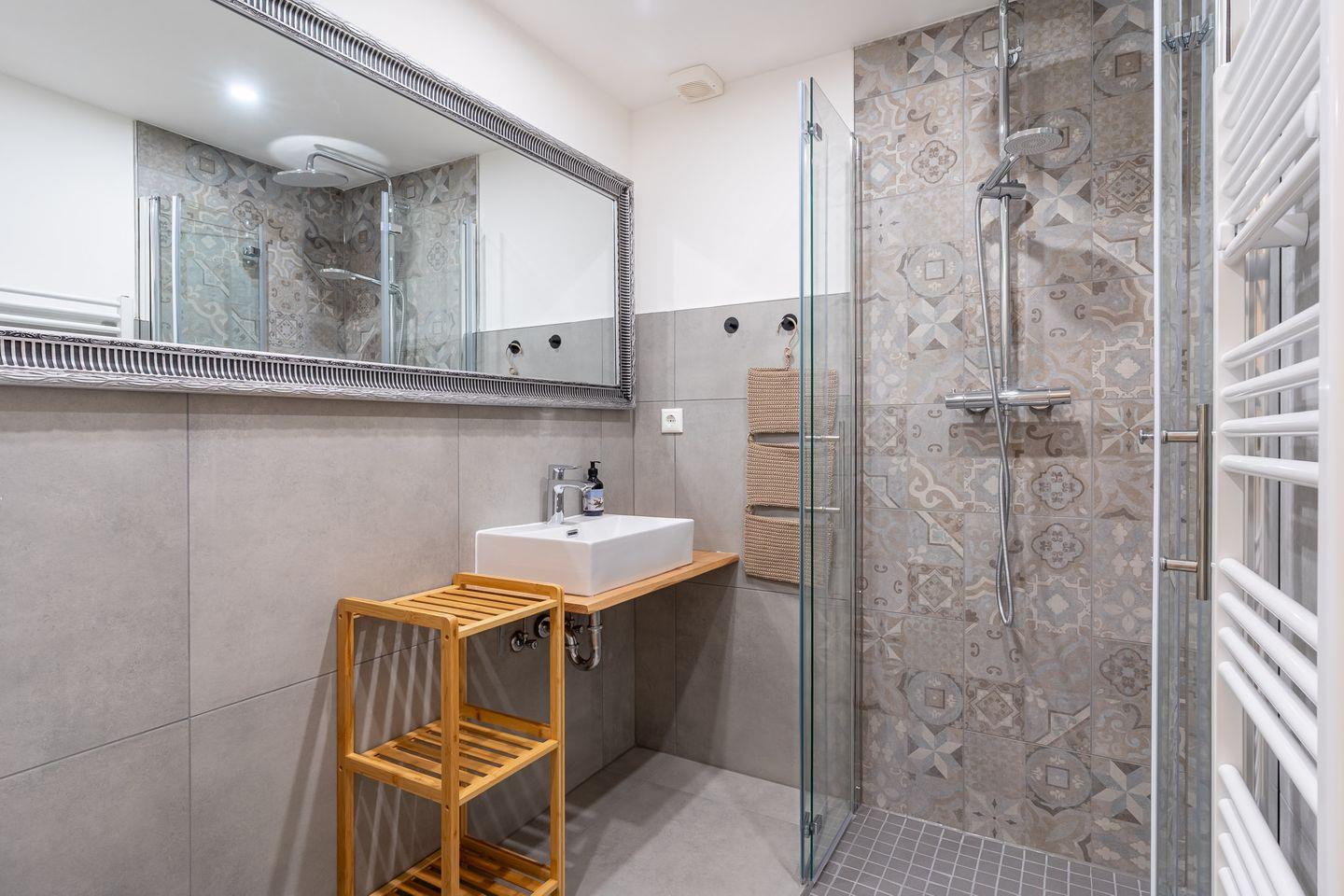 Der Wohnbereich dient gleichzeitig als Essbereich und bietet ausreichend Platz für gesellige Abende und gemeinsame Mahlzeiten. In der offenen Küchenzeile finden Sie alles, was Sie für die Selbstversorgung benötigen, inklusive Geschirrspüler und Backofen. Hier können Sie nach Herzenslust kochen und Ihre Lieblingsgerichte zubereiten. Das Badezimmer wurde komplett erneuert, verfügt über eine bodengleiche Dusche und wurde modern und zeitlos gestaltet.