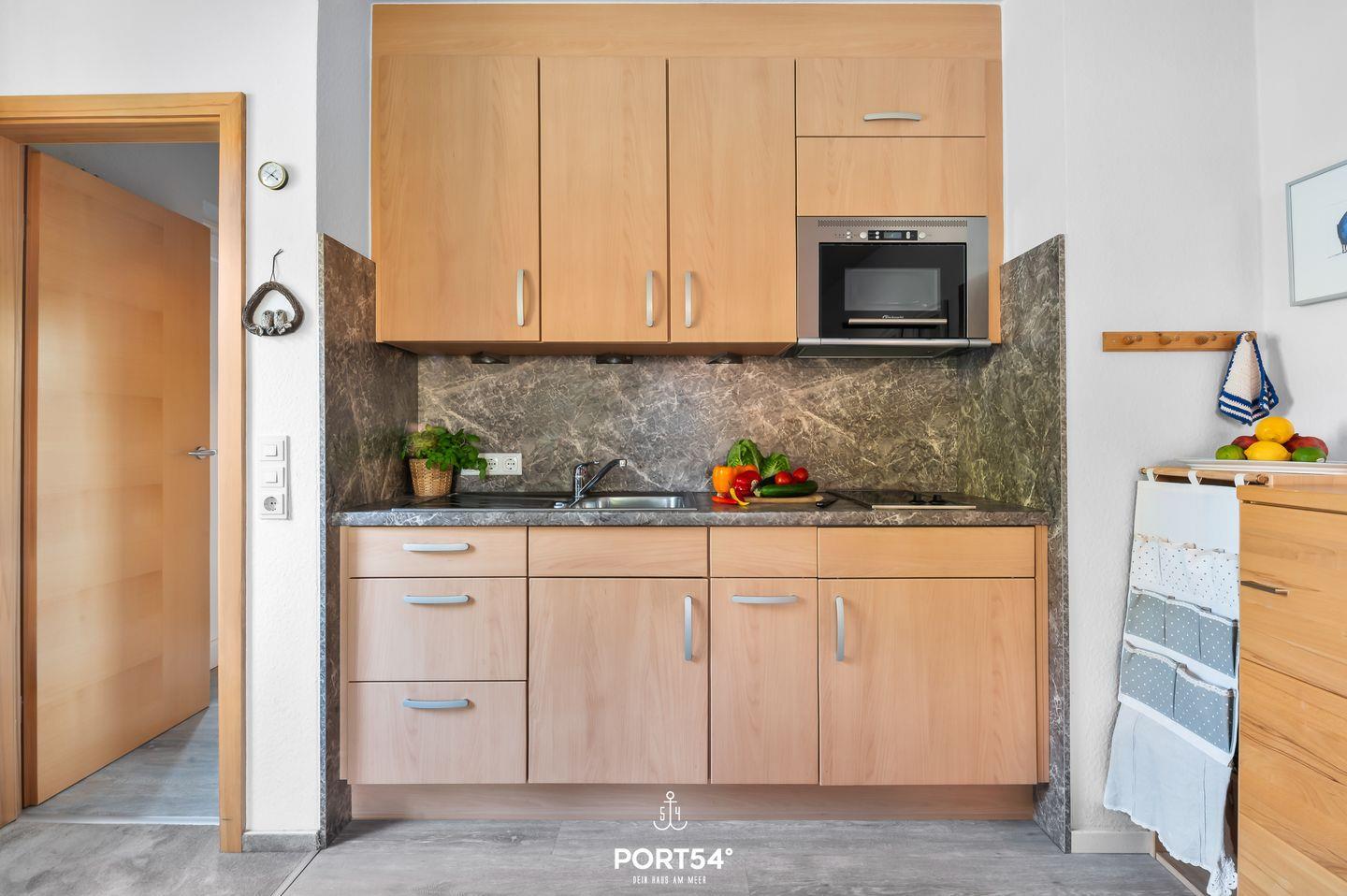 Die Küche ist offen zum Wohnzimmer und bietet alles für einen gemütlichen Kochabend.