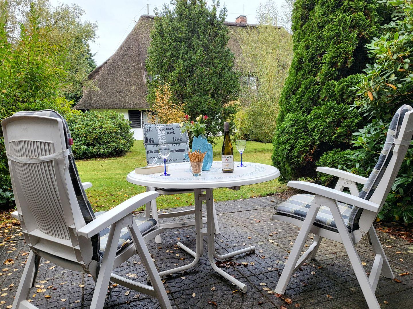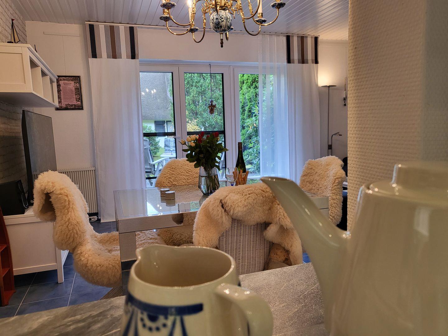 Zentral gegelene 2 Zimmer Ferienwohnung mit Terrasse unter Reetdach im Ortsteil Dorf. Wohnraum mit Sitz-und Essecke, Schlafcouch, separate Küche,