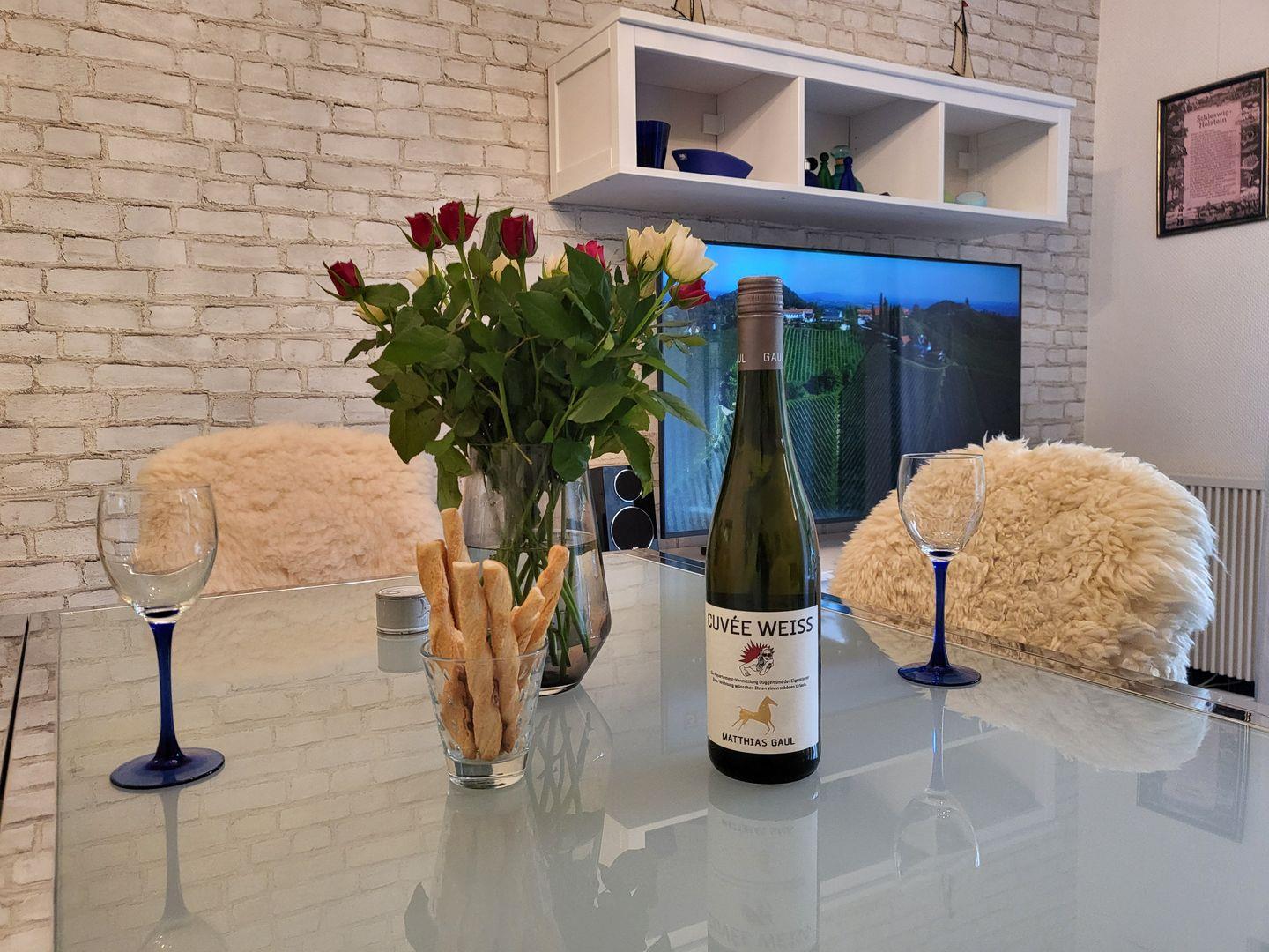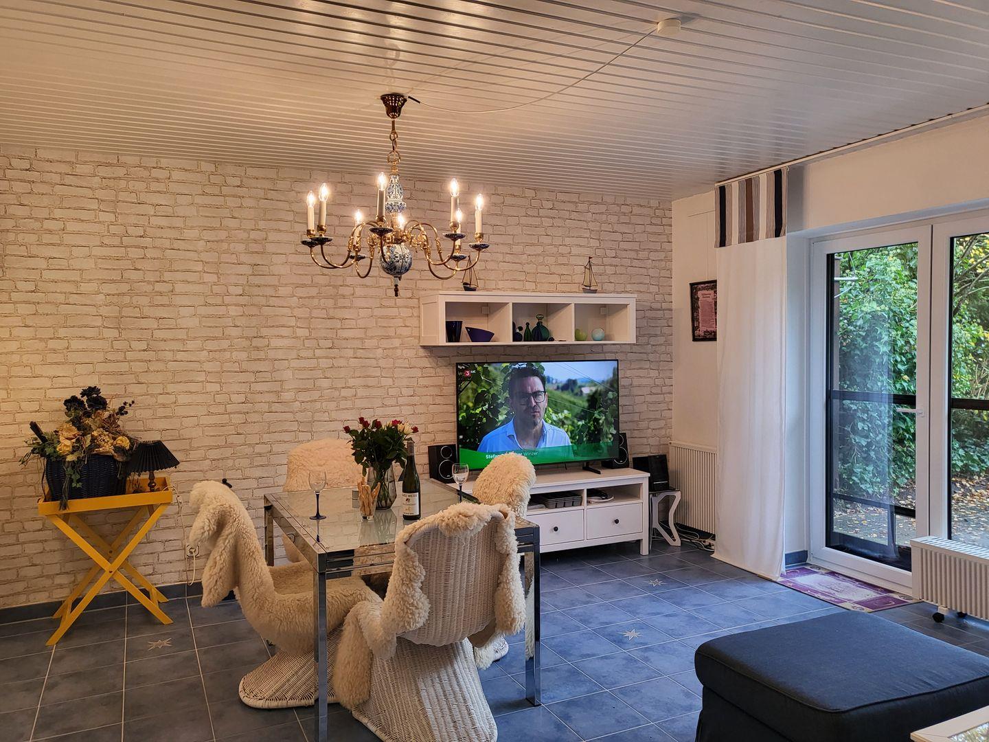 Am großen Esstisch nimmt die ganze Familie Platz, für die multimediale Unterhaltung sorgen ein großer Flachbild-TV mit 55 Zoll und kostenfreies W-LAN. Dank Durchreiche wirkt die separate Küche offen und hell.