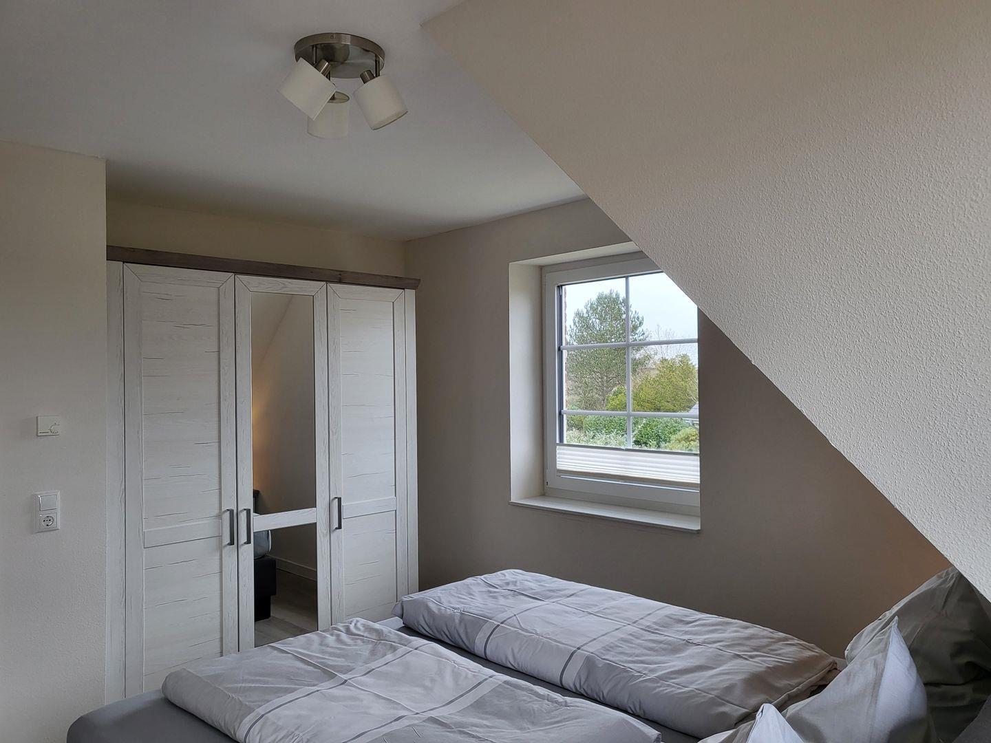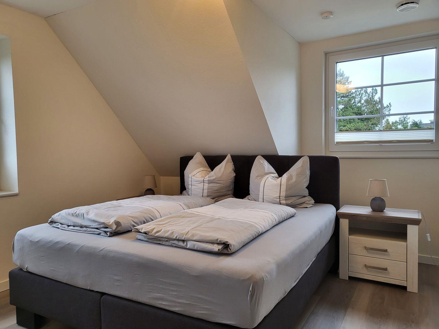 Über eine offene Holztreppe gelangt man in das helle Obergeschoss. Die drei Schlafzimmer, mit je einem Doppel Boxspringbett (180 x 200 cm) bieten eine ruhevollen Schlaf.