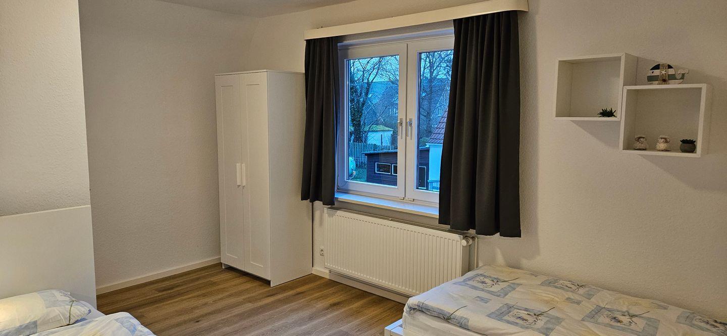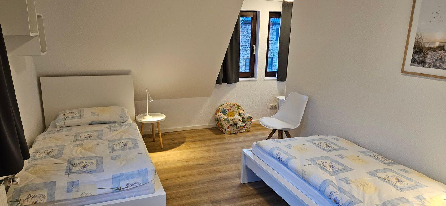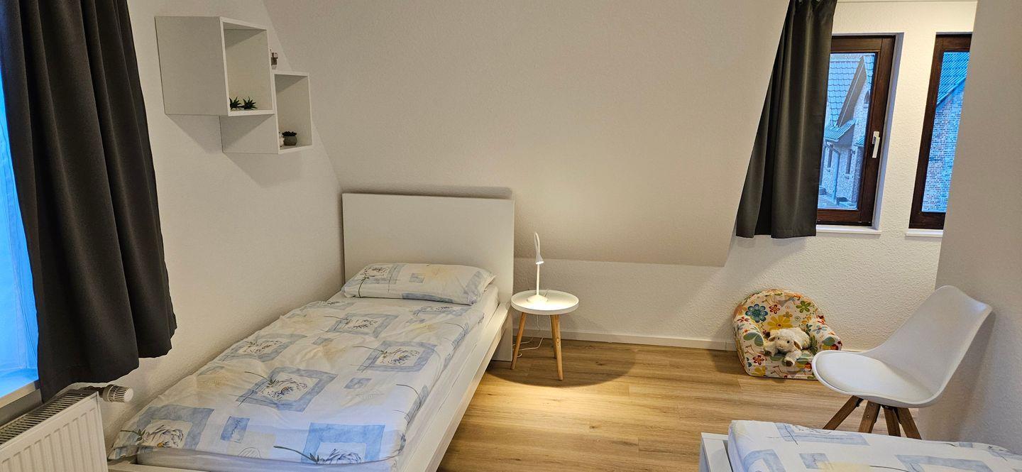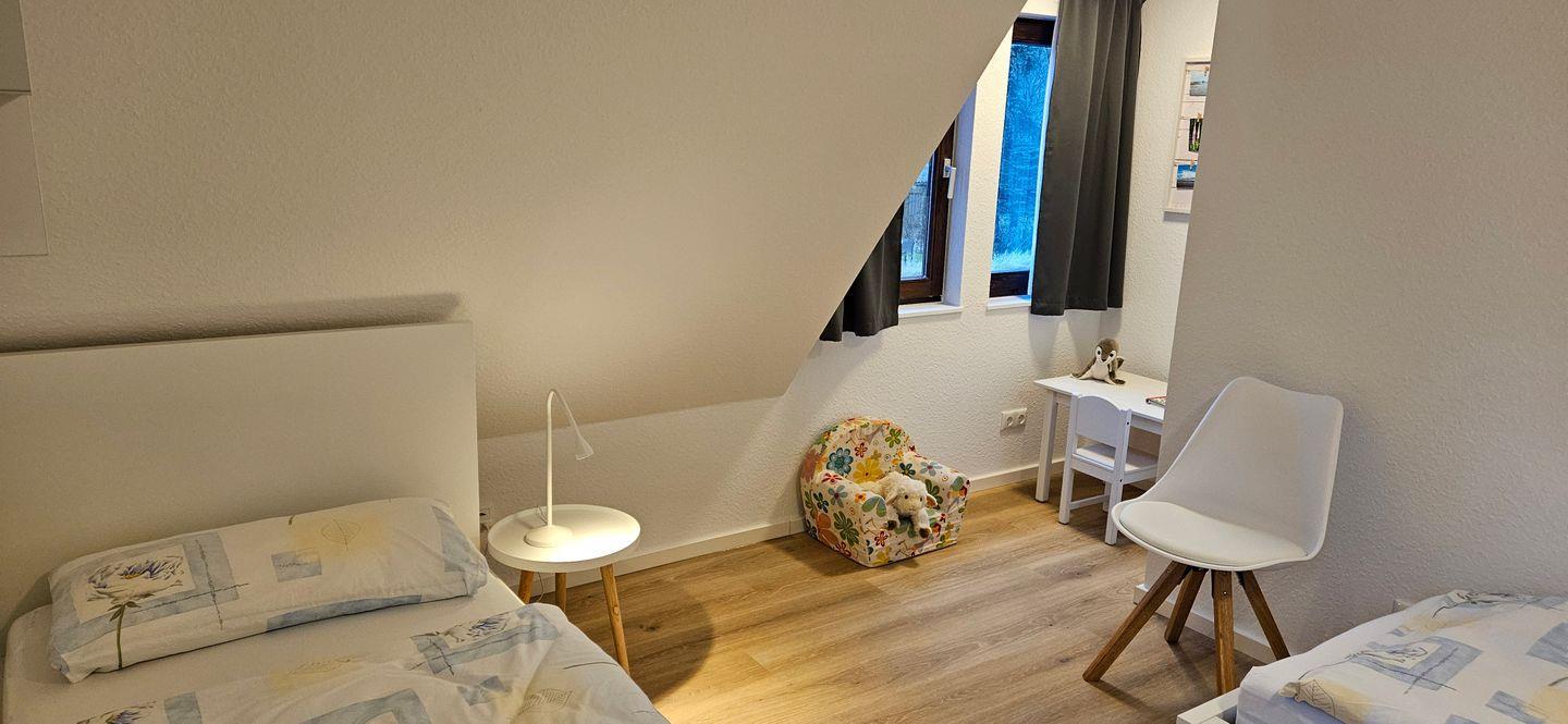Im Obergeschoss gibt es zwei weitere Schlafzimmer – eines mit Doppelbett und eines mit zwei Einzelbetten – sowie ein weiteres WC.