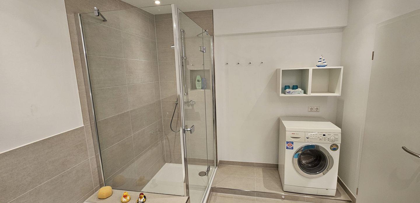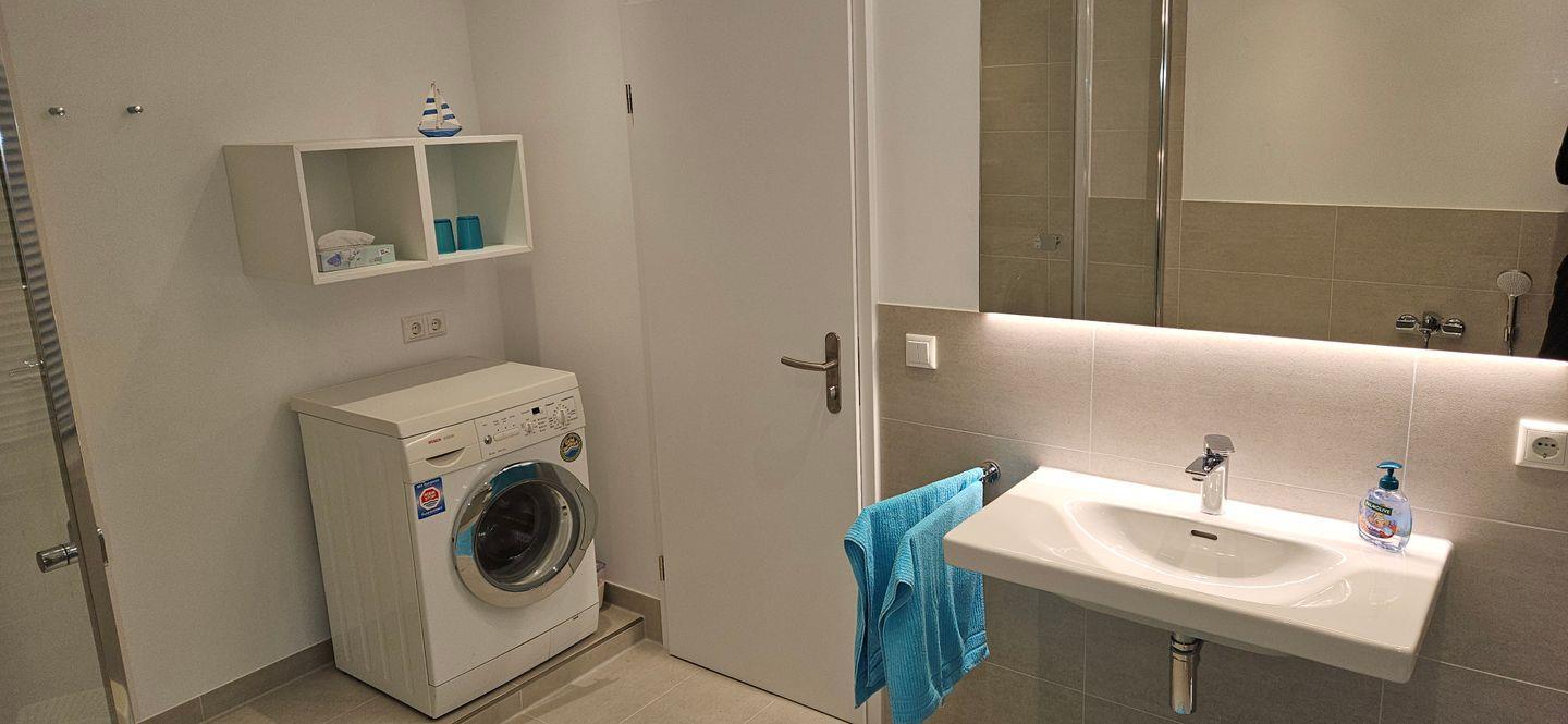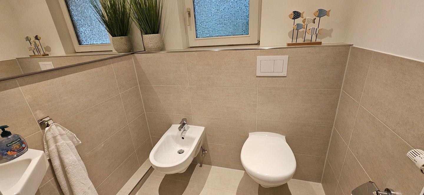 Neben der Küche, die mit Geräten wie Geschirrspüler, Ceran-Kochfeld und Mikrowelle ausgestattet ist, befinden sich im Erdgeschoss auch das Badezimmer mit Badewanne, Dusche und Waschmaschine, ein separates WC mit Bidet sowie ein Schlafzimmer mit Doppelbett.