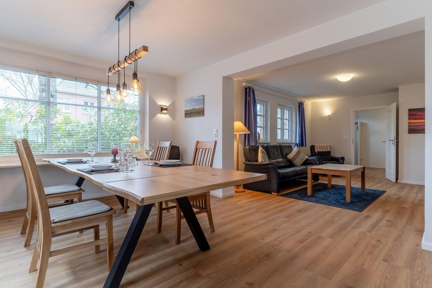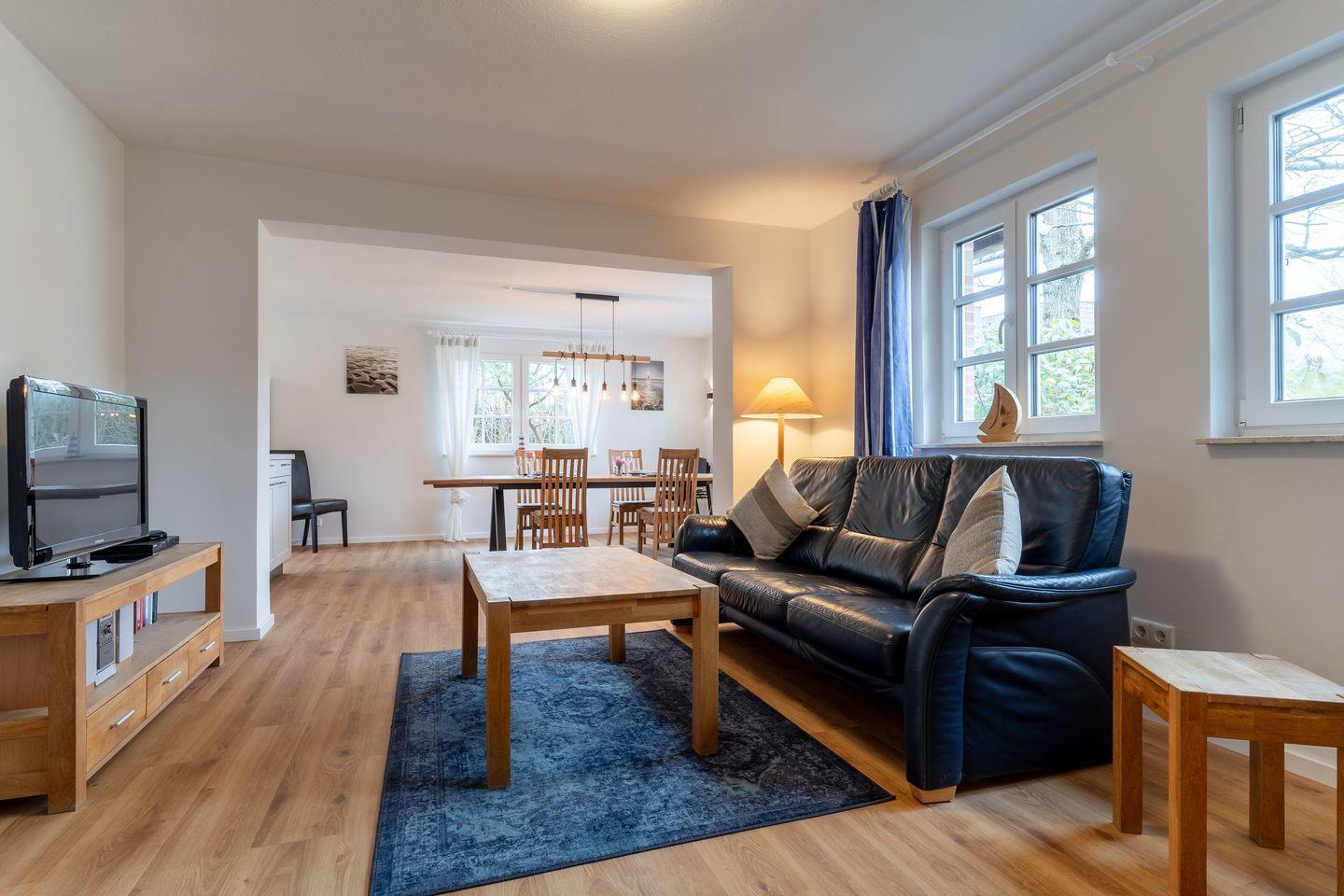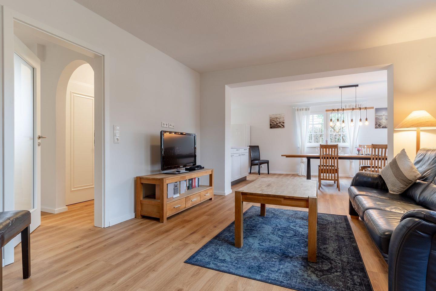 Im Esszimmer ist ein großer Esstisch, der allen Personen Platz bietet. Von hier aus geht es dann weiter in den Wohnraum mit gemütlichem Sofa und TV.