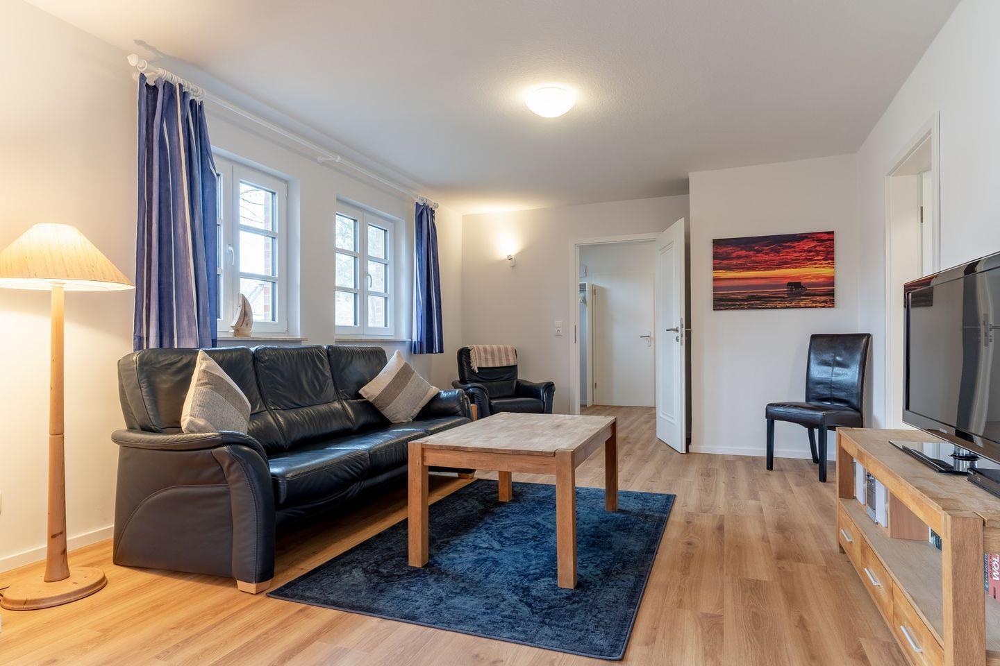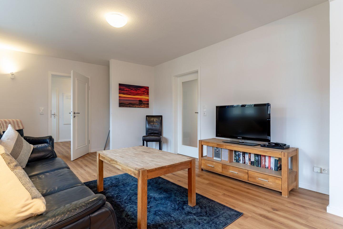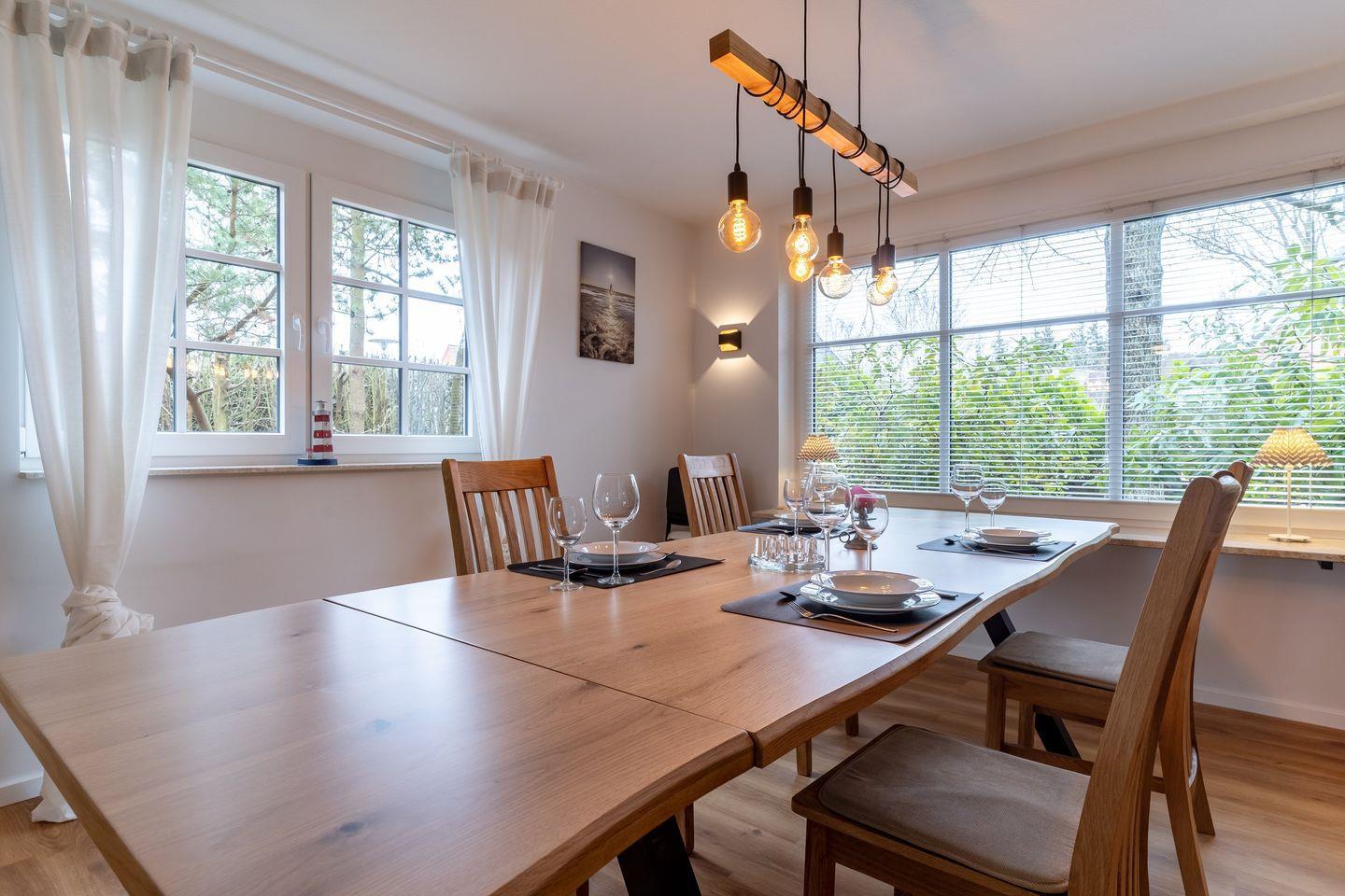 Im Esszimmer ist ein großer Esstisch, der allen Personen Platz bietet. Von hier aus geht es dann weiter in den Wohnraum mit gemütlichem Sofa und TV.