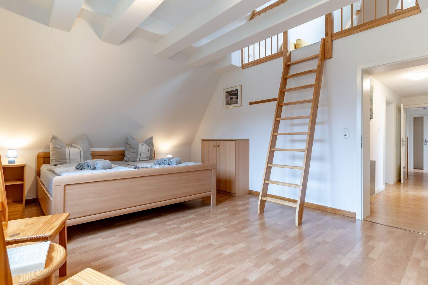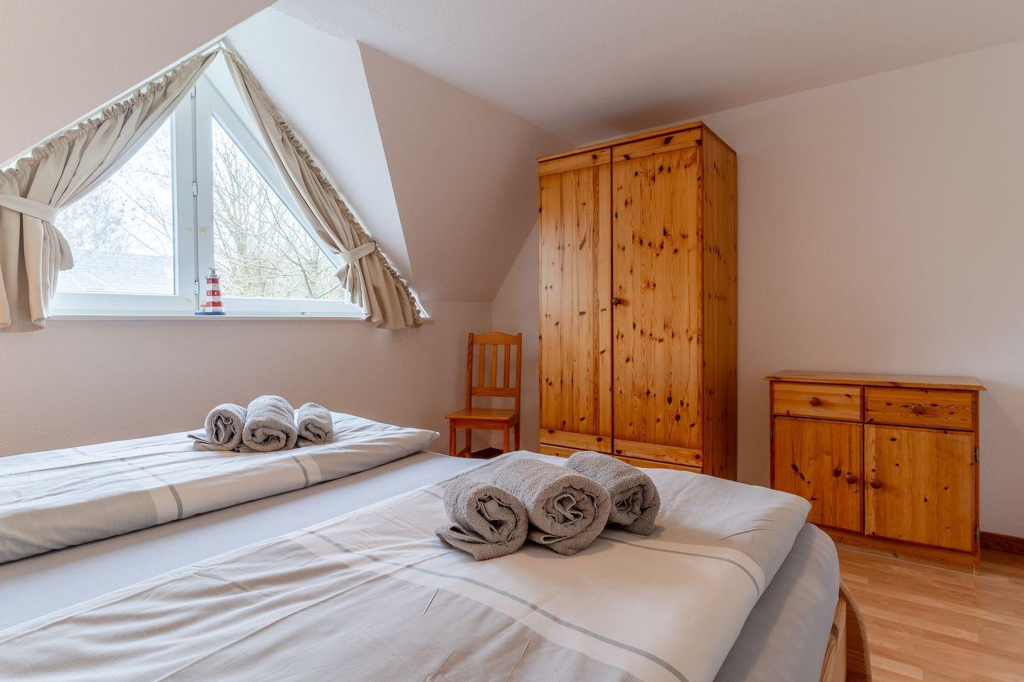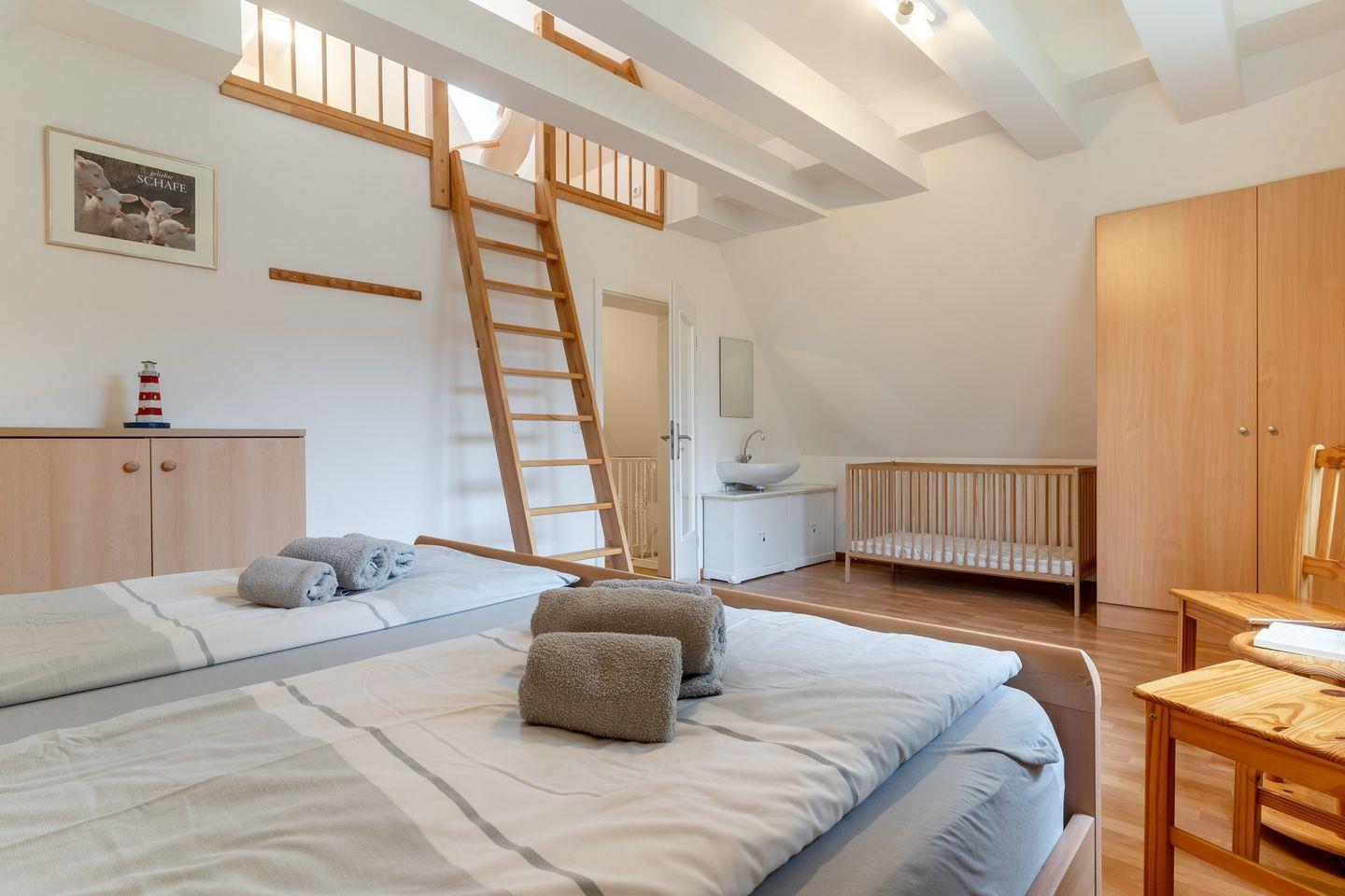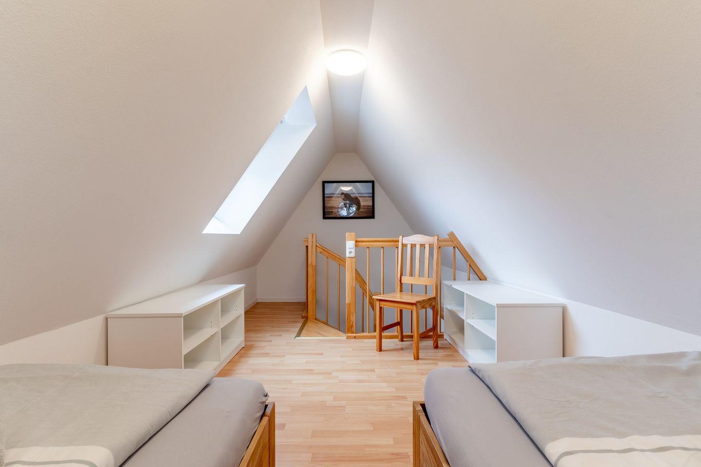 Das Oberschoß ist in zwei Bereiche eingeteilt, jeweils mit einem Master-Schlafzimmer mit einem 180x200cm Doppelbett und Kleiderschrank und je einem weiteren Schlafzimmer, eines mit einem 140x200cm Doppelbett und eines mit zwei Einzelbetten.