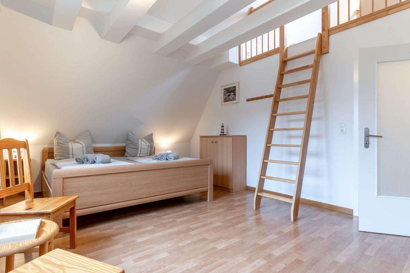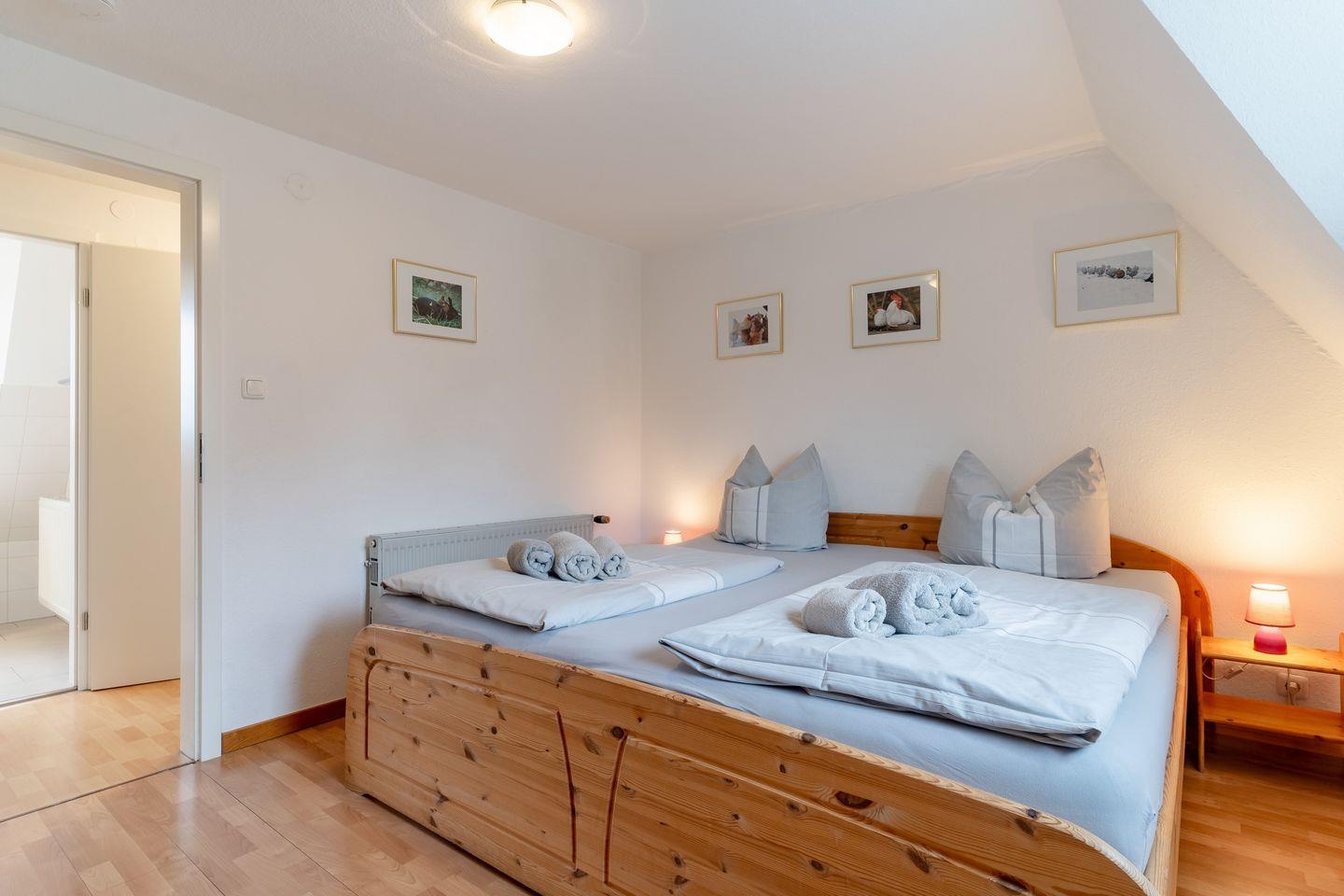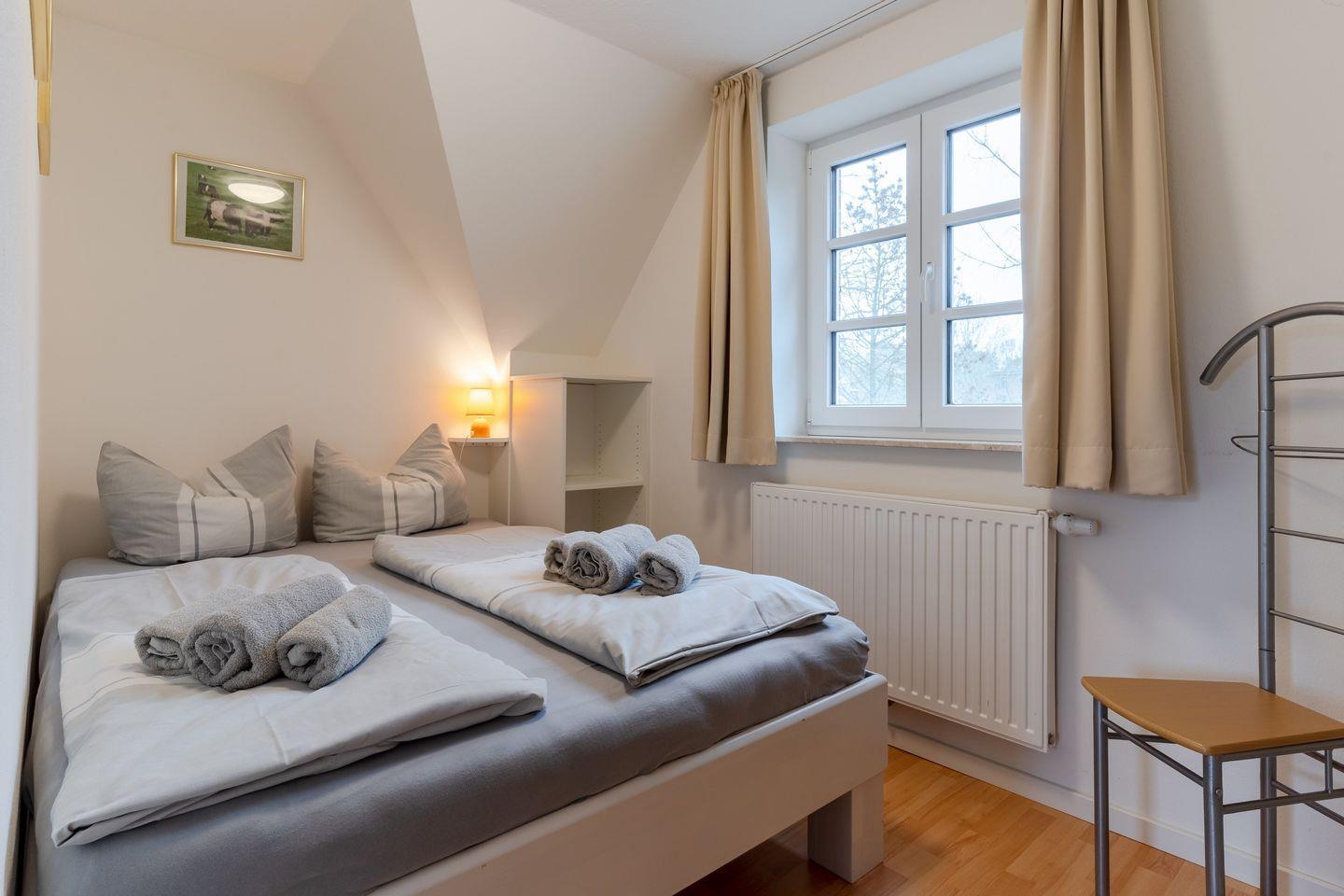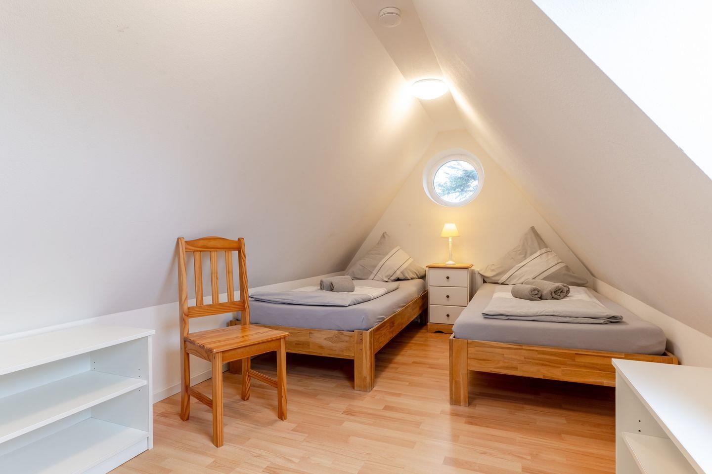 Das Oberschoß ist in zwei Bereiche eingeteilt, jeweils mit einem Master-Schlafzimmer mit einem 180x200cm Doppelbett und Kleiderschrank und je einem weiteren Schlafzimmer, eines mit einem 140x200cm Doppelbett und eines mit zwei Einzelbetten.