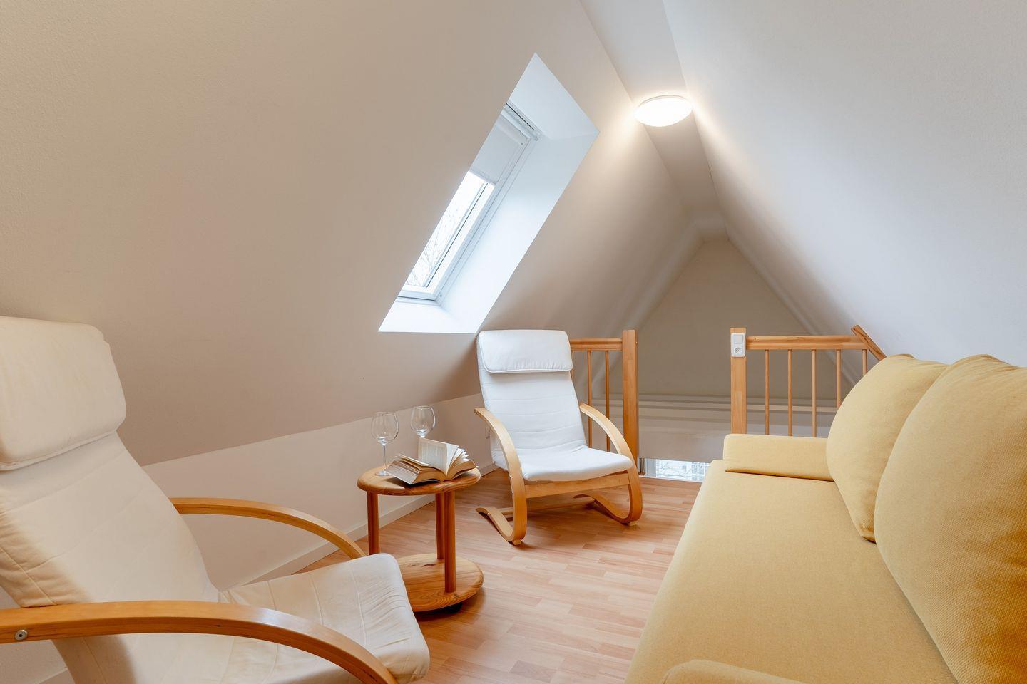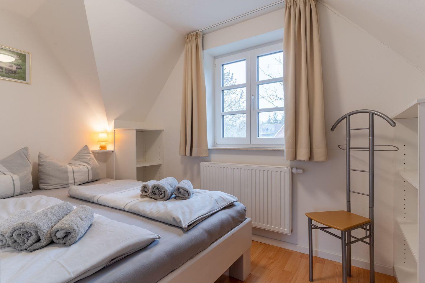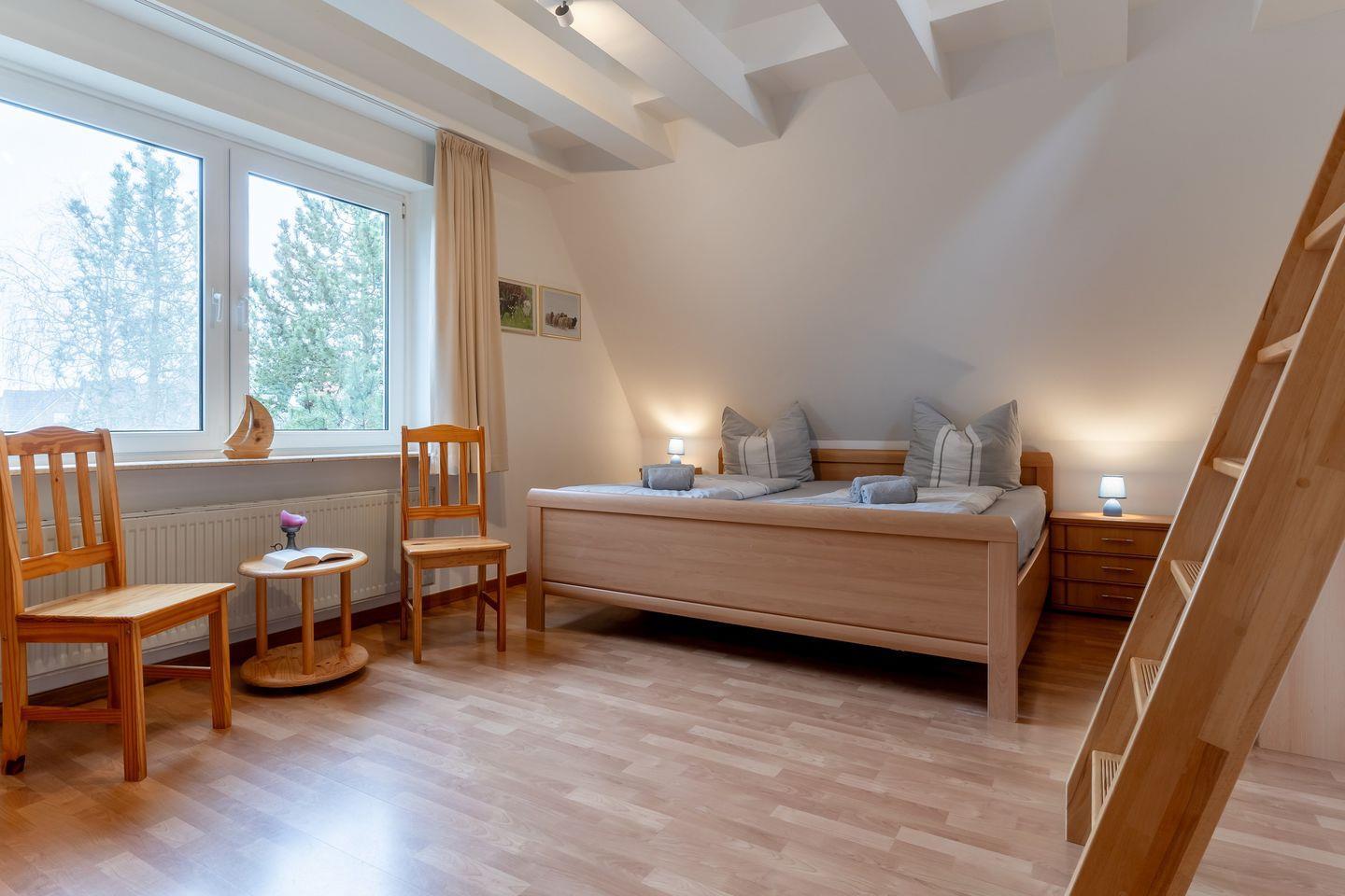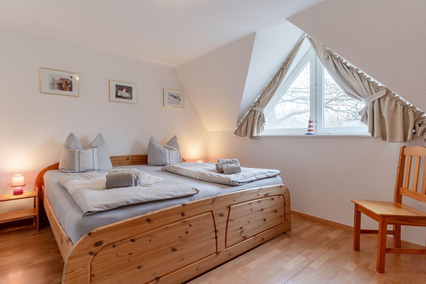 Das Oberschoß ist in zwei Bereiche eingeteilt, jeweils mit einem Master-Schlafzimmer mit einem 180x200cm Doppelbett und Kleiderschrank und je einem weiteren Schlafzimmer, eines mit einem 140x200cm Doppelbett und eines mit zwei Einzelbetten.