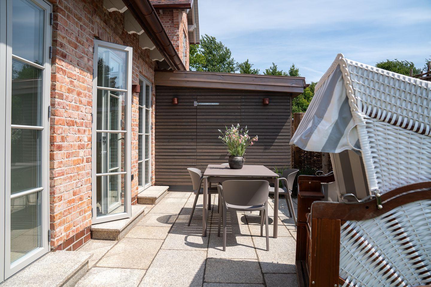 Eine wunderbare Terrasse lädt dazu ein entspannte Stunden im Freien zu verbringen. Ein eigener Garten und ein Strandkorb bieten Ihnen zusätzlichen Platz zum Relaxen. Damit die Wohnung für Sie ein Zuhause auf Zeit wird, ist auch max. ein Haustier herzlich willkommen.