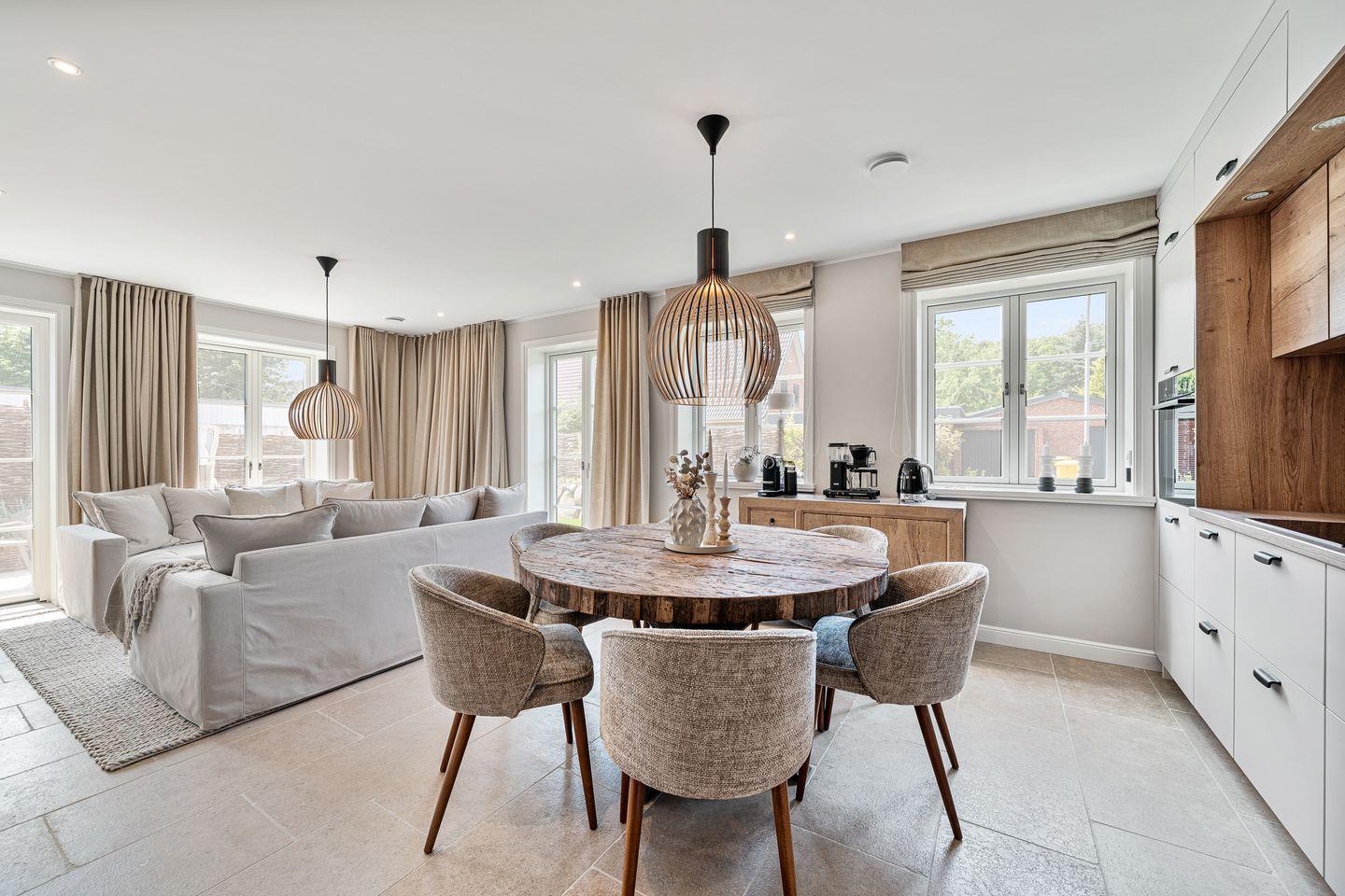 Der offene Wohnbereich verbindet einen einladenden Wohnraum mit einer voll ausgestatteten Küche. Hier finden Sie alle Annehmlichkeiten, die das Herz eines jeden Kochs höher schlagen lassen. Der gemütliche Gas-Kamin sorgt in den kühleren Monaten für eine wohlige Atmosphäre. Genießen Sie gemeinsame Abende mit Ihren Liebsten vor dem Fernseher – insgesamt stehen Ihnen vier Fernseher zur Verfügung, sodass jeder sein Lieblingsprogramm genießen kann.