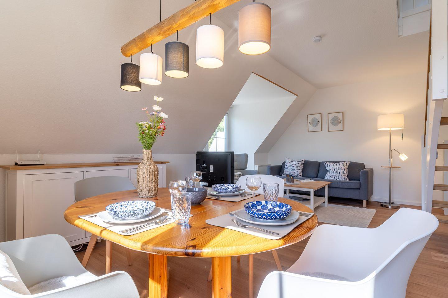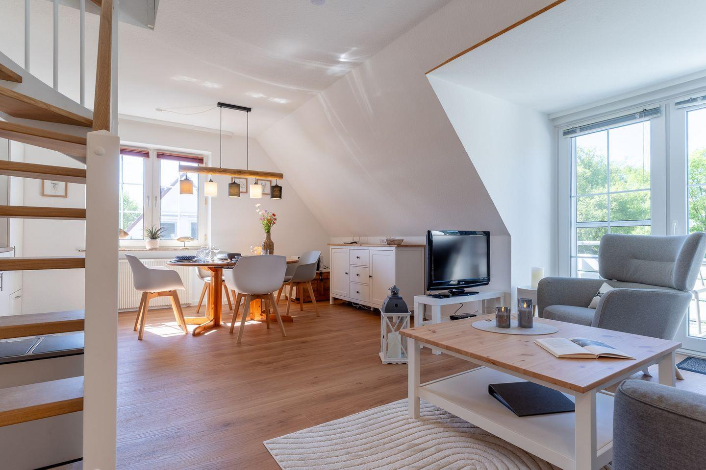 Die ca. 65 qm große Wohnung erstreckt sich über zwei Etagen. Im unteren Bereich befindet sich das moderne, gemütliche Wohnzimmer mit einem schicken Essbereich, Flachbildfernseher und einer voll ausgestatteten Küchenzeile.