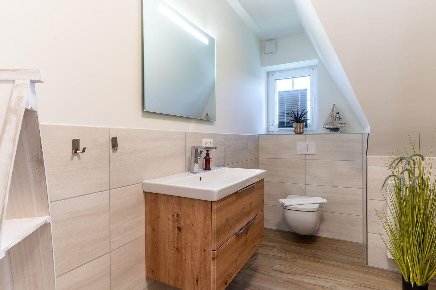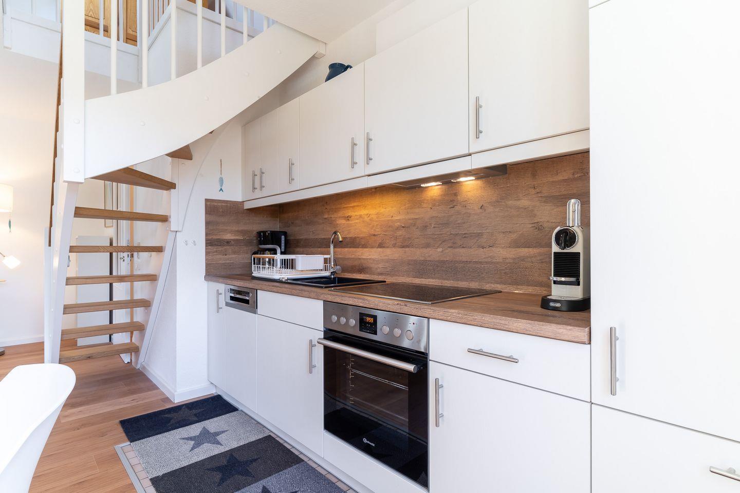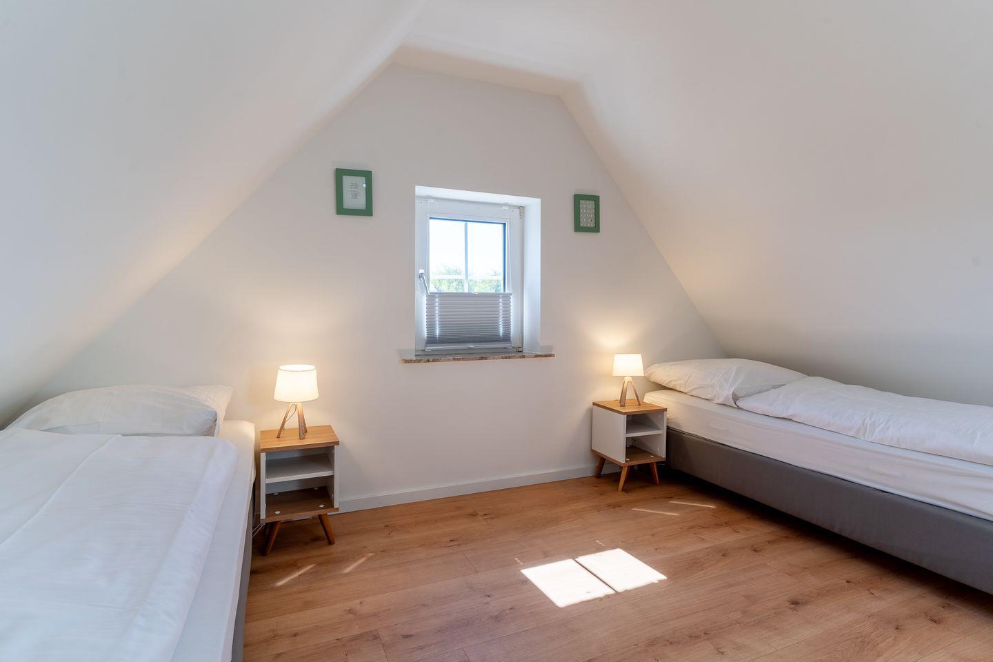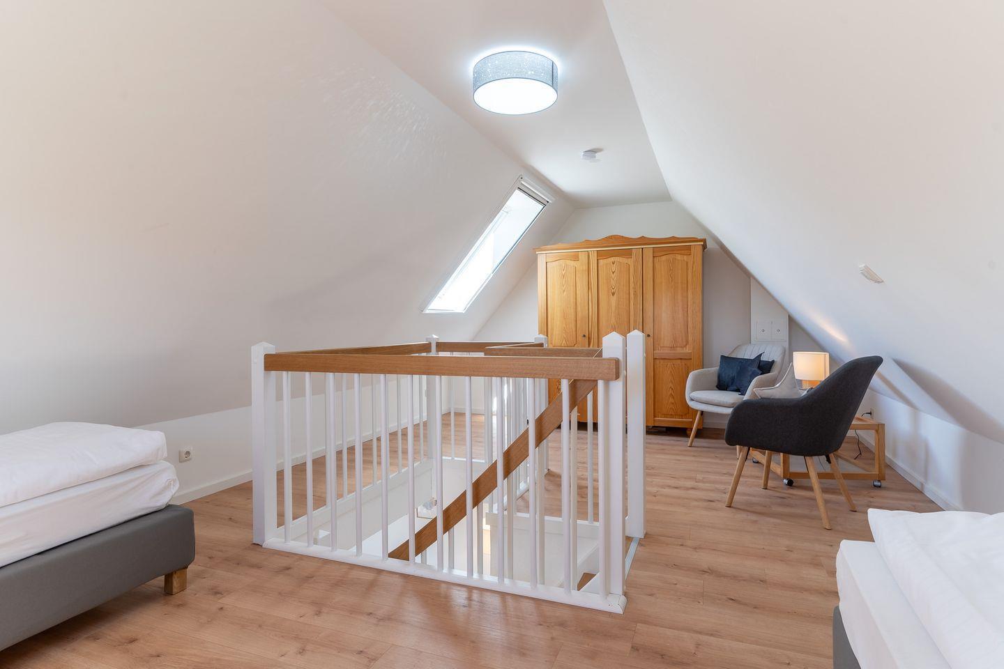 Eine offene Treppe im Wohnbereich führt in das Dachgeschoss mit zwei Einzelbetten (Boxspringbetten / je 90 x 200 cm) und einer gemütlichen Sitzecke.