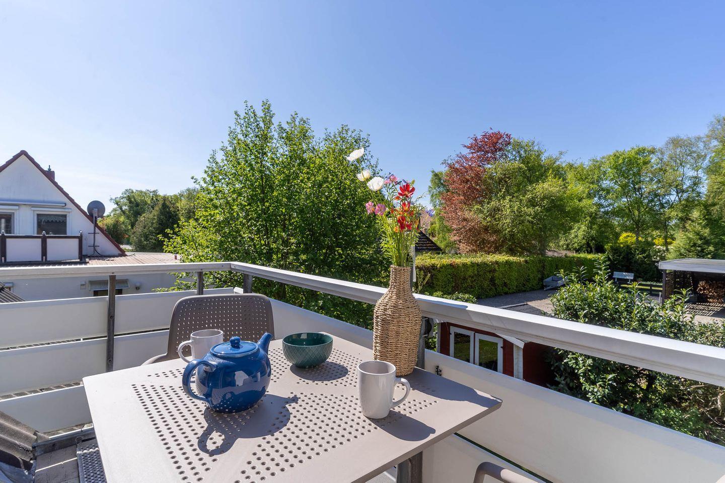 Ein Balkon mit Tisch und Stühlen lädt zum Verweilen ein.
